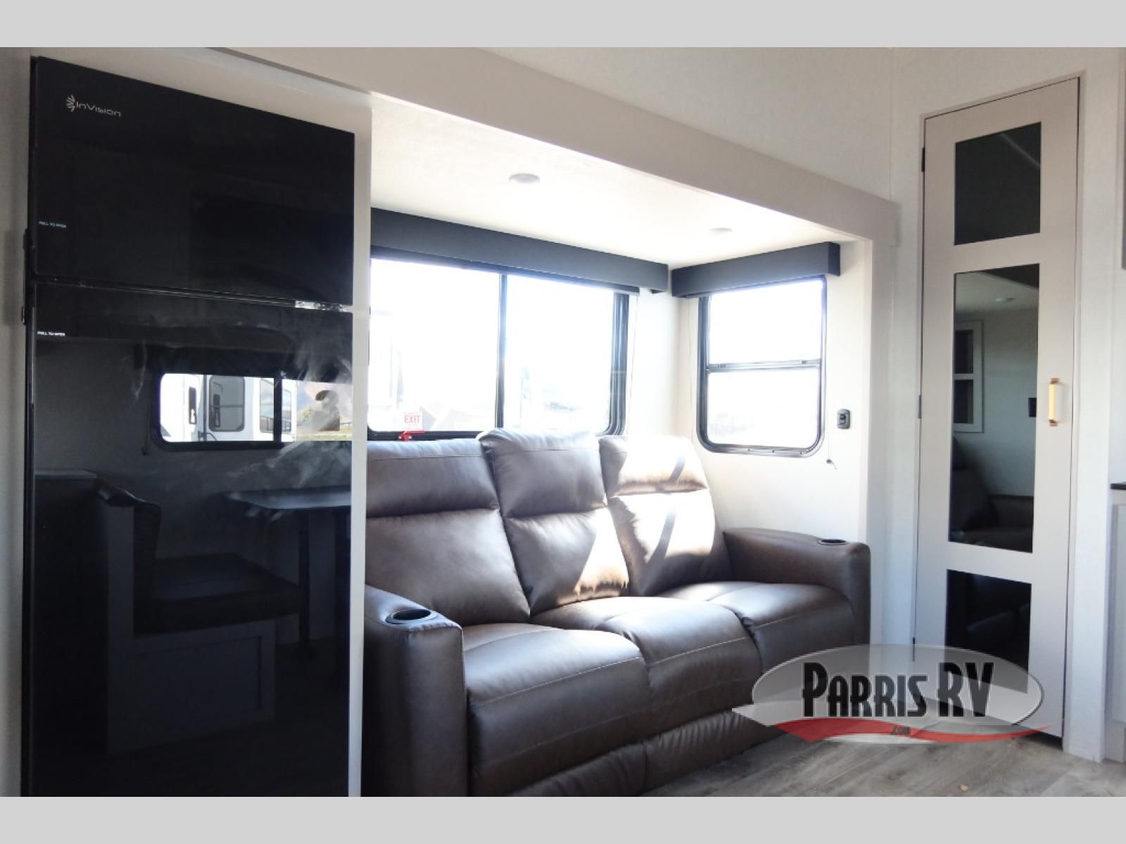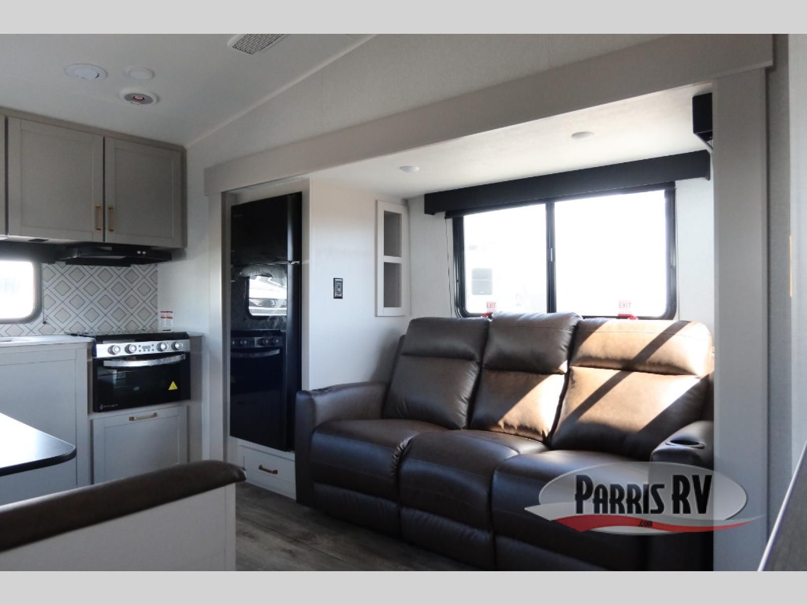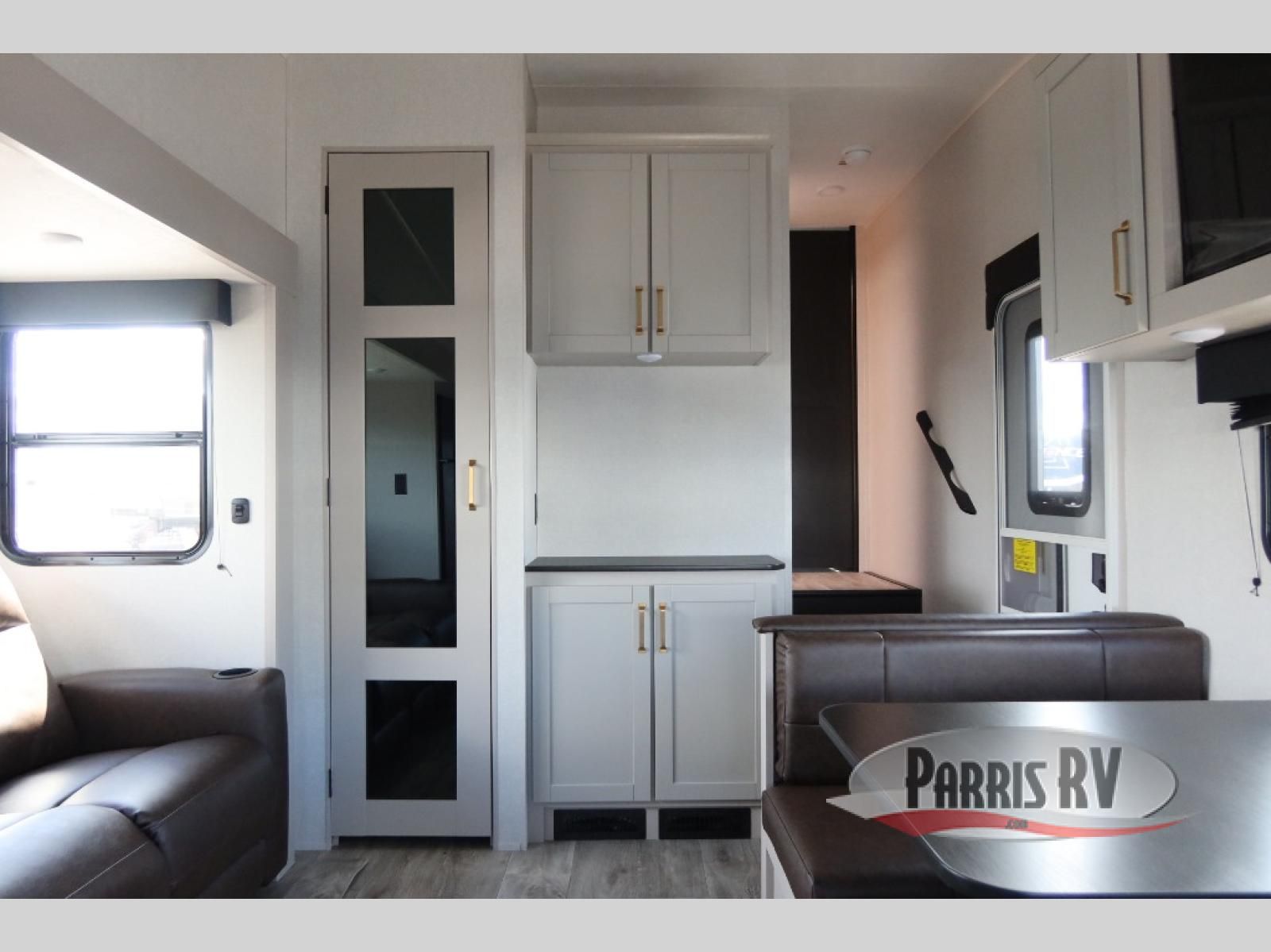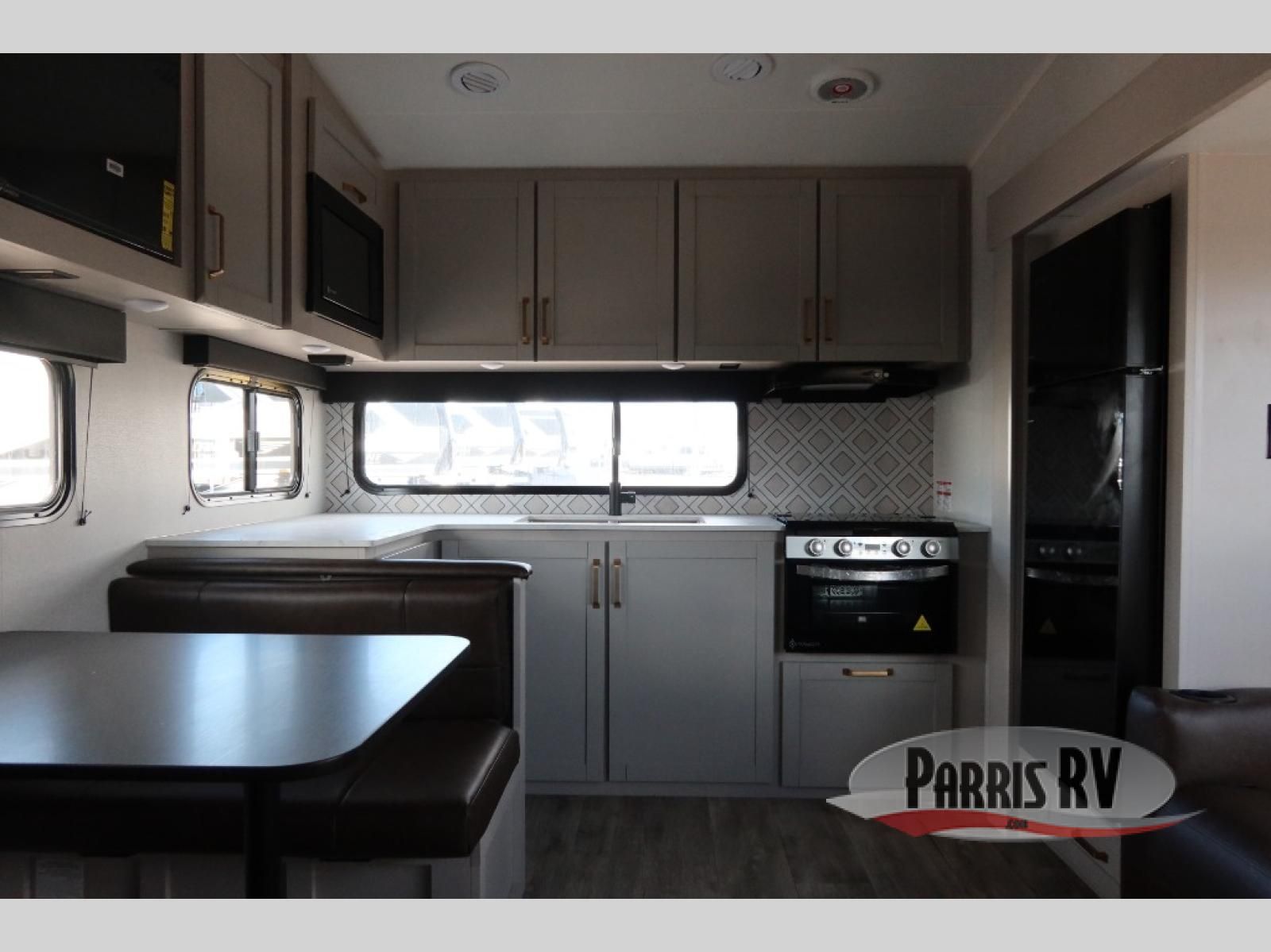 The fifth wheel you were waiting for! The spacious rear kitchen is equipped with a three-burner cooktop, microwave, booth dinette, 12V refrigerator, and sink, providing ample space for meal preparation. Overhead cabinets and a pantry provide ample storage for cookware, dishes, and other essential kitchen items. The living area features a trifold sofa, perfect for relaxation and entertainment. The full bathroom's thoughtful design ensures that everyone has their own space, and the front bedroom is a retreat from the world, featuring a plush queen bed, a spacious wardrobe, and a closet.