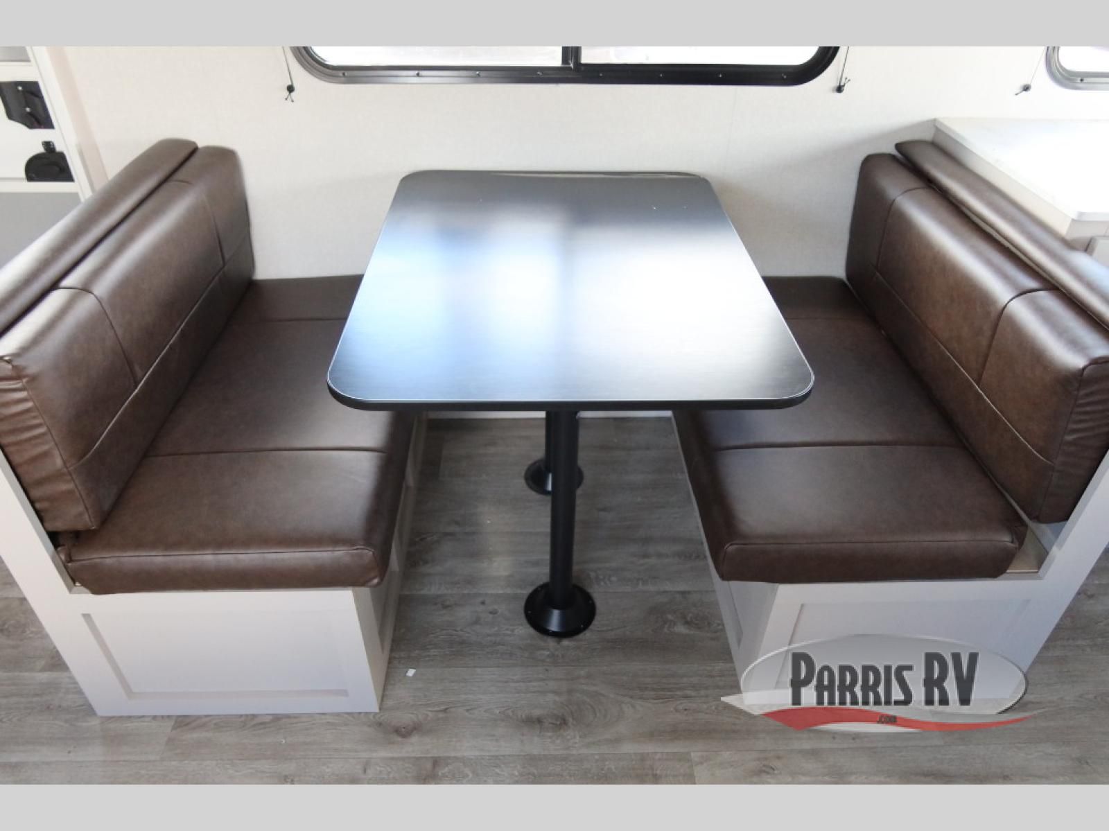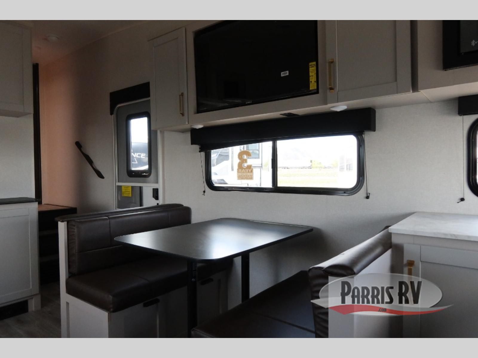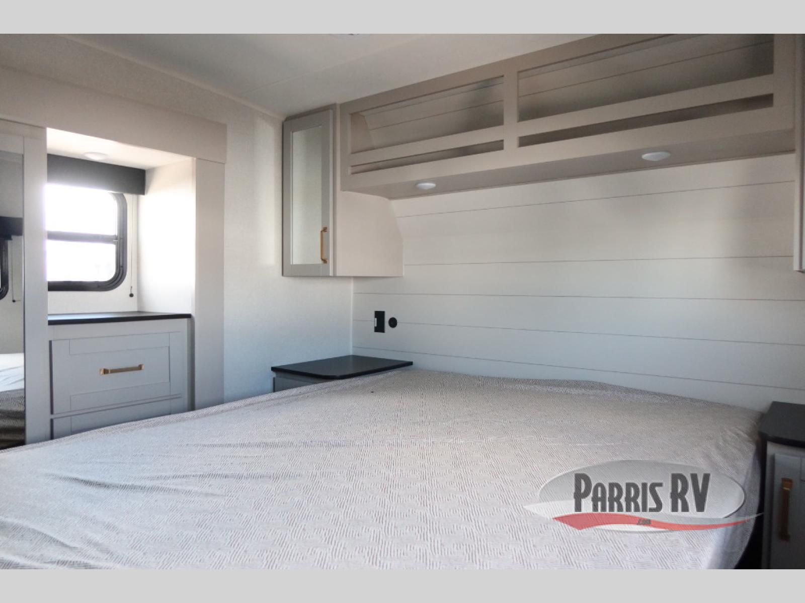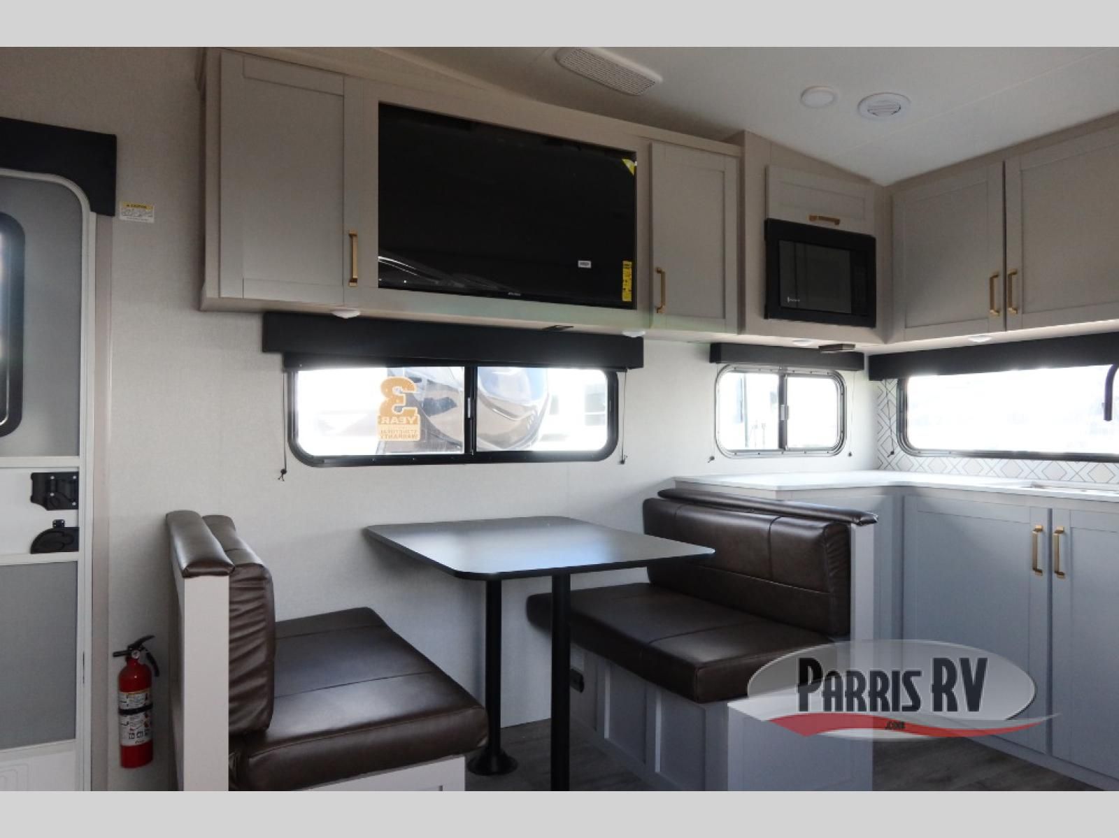 The fifth wheel you were waiting for! The spacious rear kitchen is equipped with a three-burner cooktop, microwave, booth dinette, 12V refrigerator, and sink, providing ample space for meal preparation. Overhead cabinets and a pantry provide ample storage for cookware, dishes, and other essential kitchen items. The living area features a trifold sofa, perfect for relaxation and entertainment. The full bathroom's thoughtful design ensures that everyone has their own space, and the front bedroom is a retreat from the world, featuring a plush queen bed, a spacious wardrobe, and a closet.