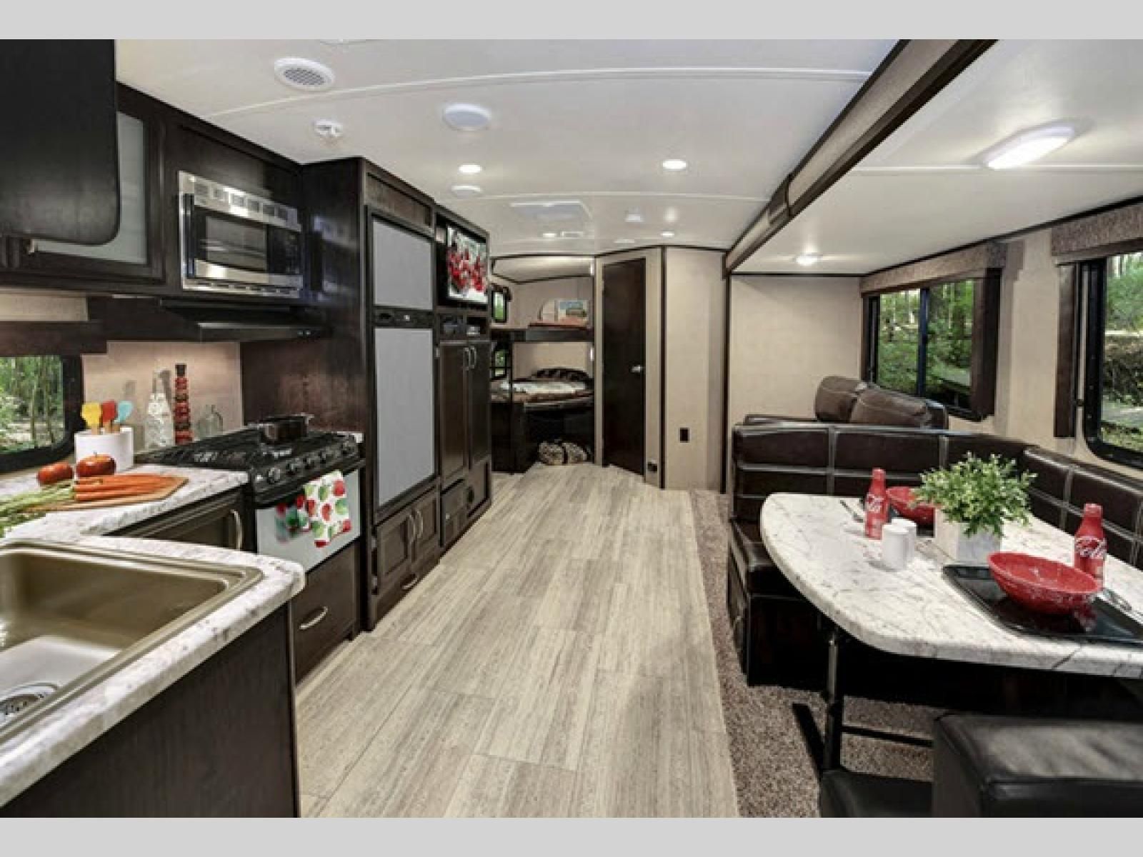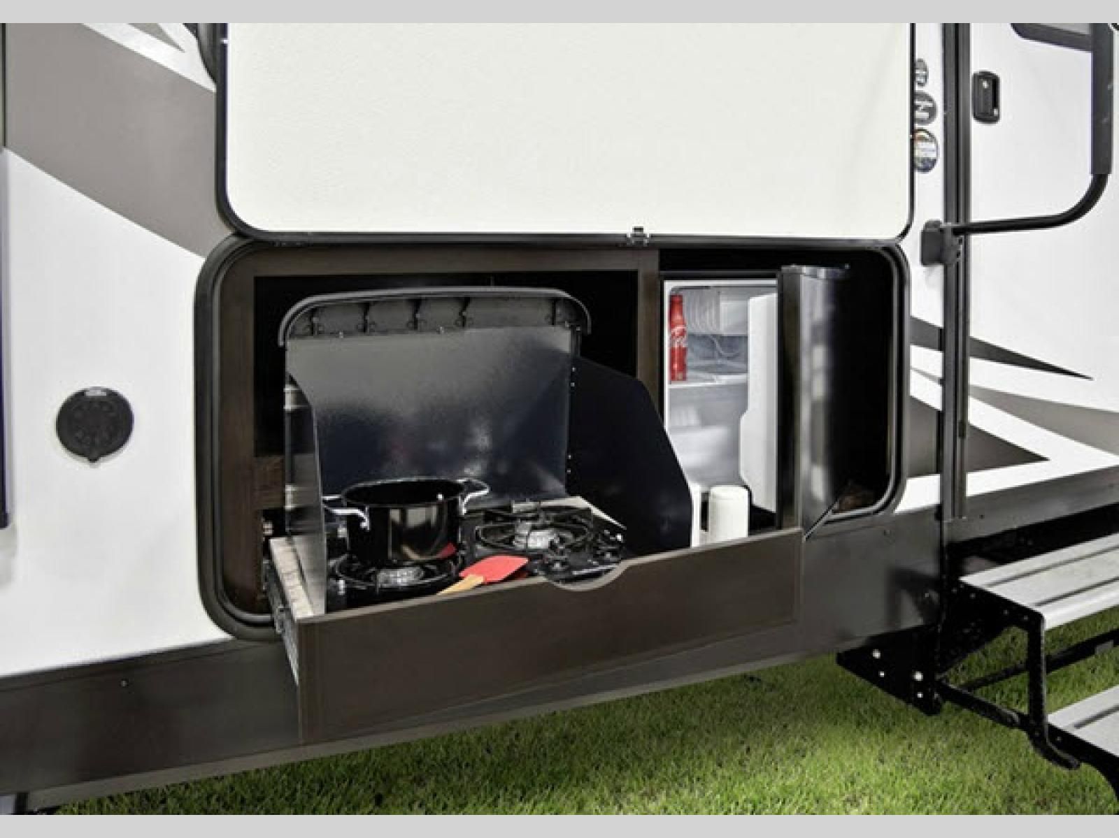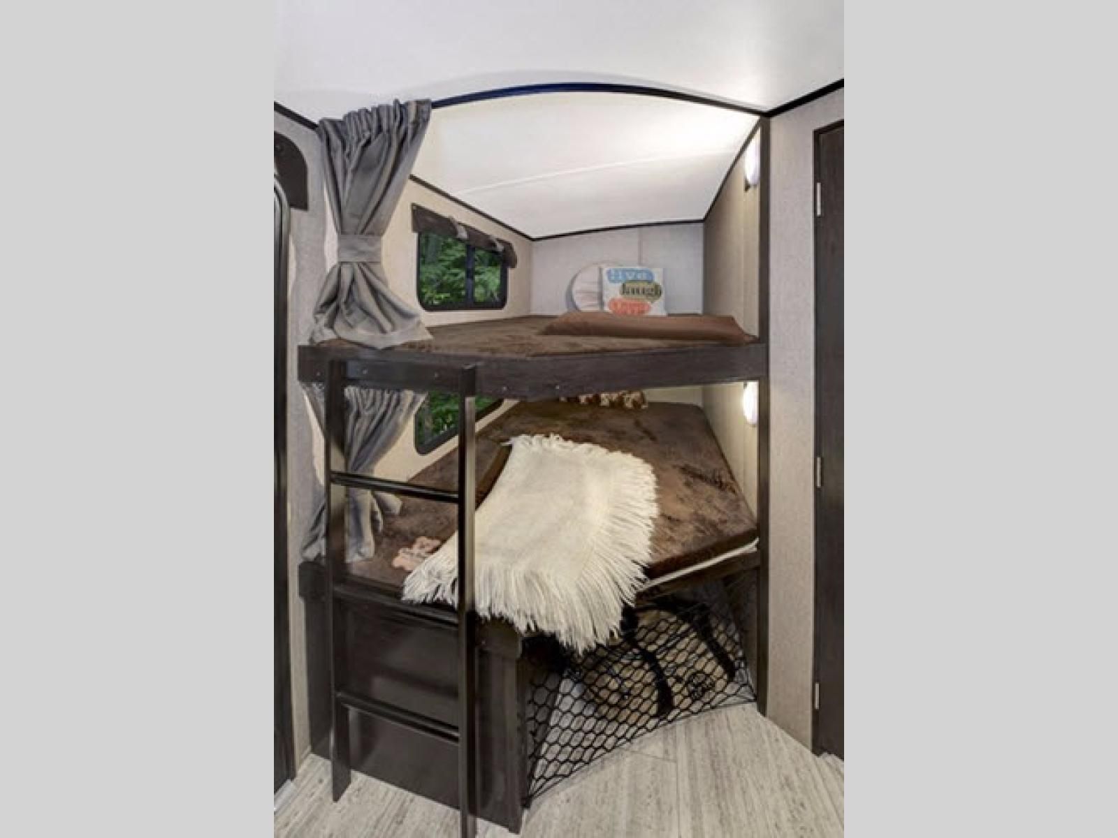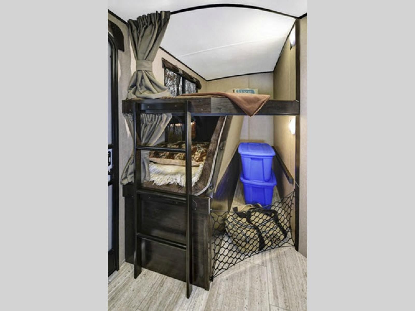 Step inside after checking out the convenient outside kitchen with a two burner range top, and refrigerator so you can cook and dine easily outdoors. Once indoors you will see a set of double bed bunks to your left. There is also bike storage beneath where you can easily stow things away while traveling.