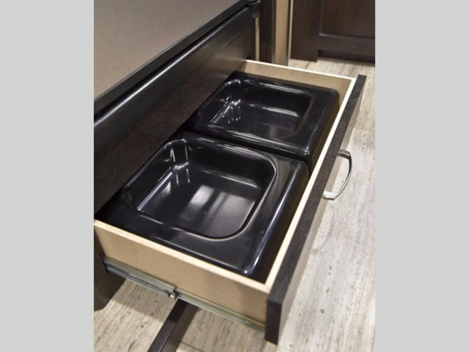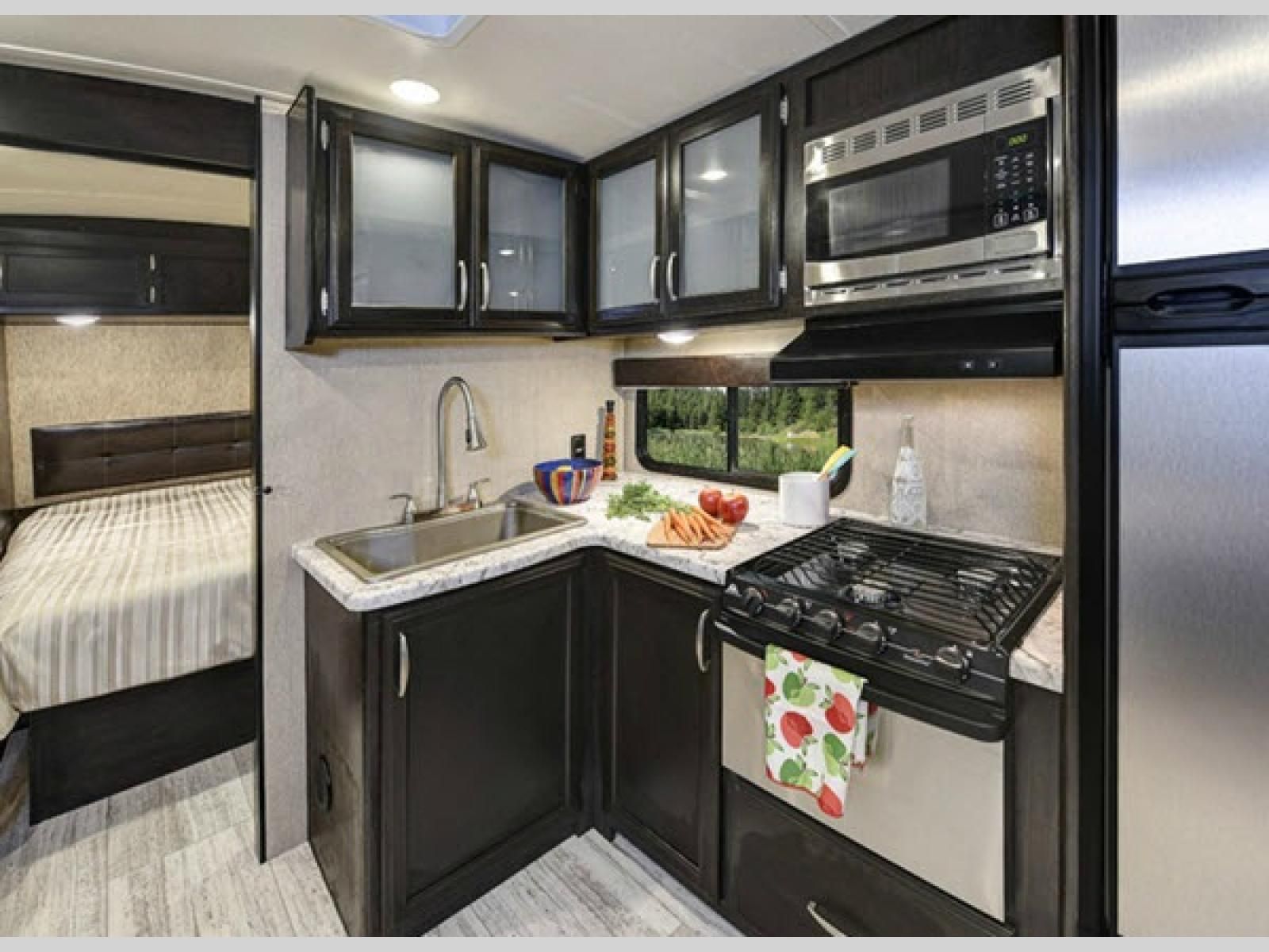 To the right of the entry door find shoe storage and a nice kitchen. The wardrobe and pantry just inside the door are great for clothing storage, plus food items also. There is a 32" LED TV on a swing arm in the entertainment center above. Continuing along this right side you will find a three burner range with overhead microwave oven, and a corner countertop with large single bowl sink along the interior wall. There are even pet dishes underneath the refrigerator that get tucked away when not in use.