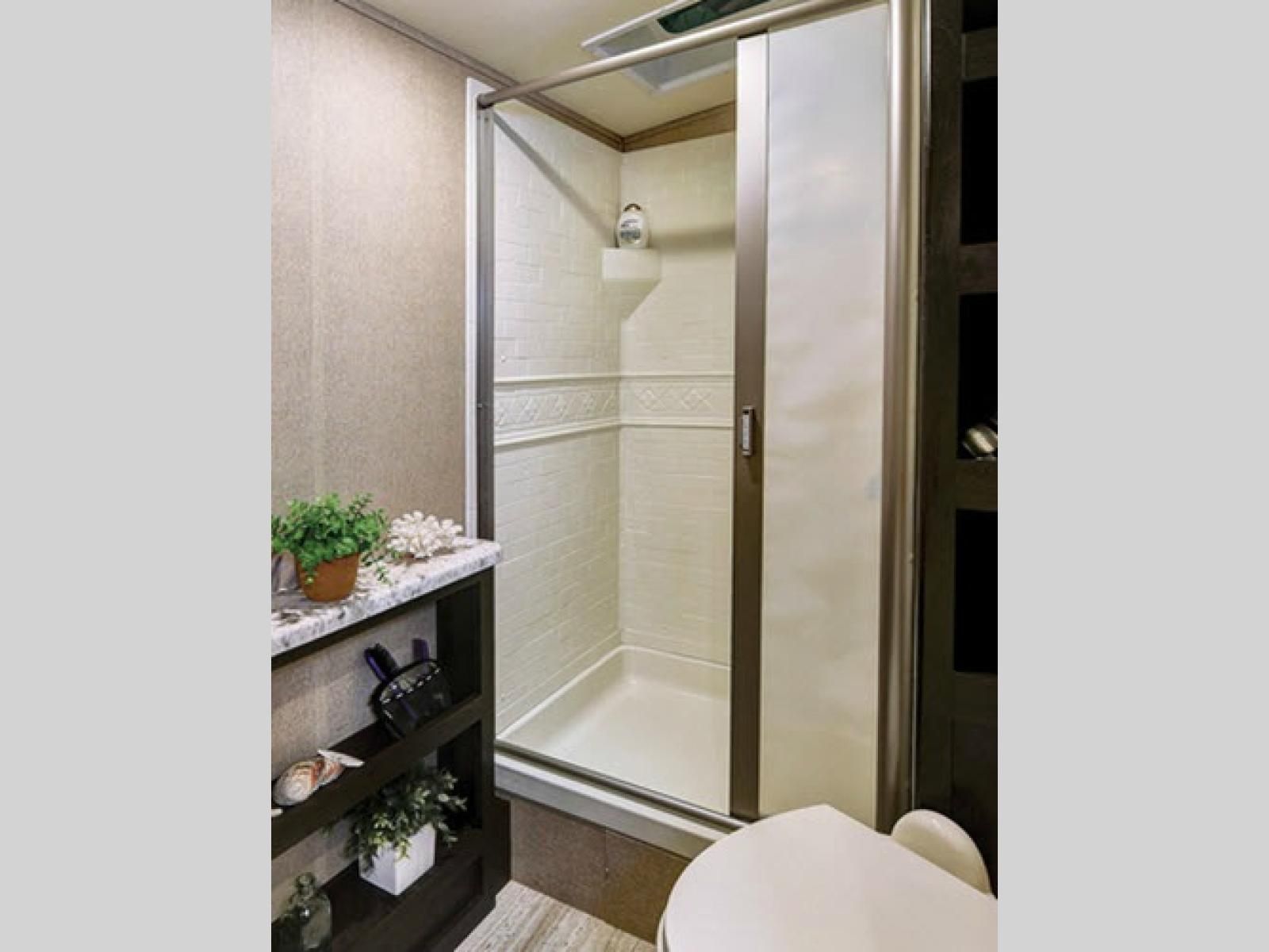 The opposite rear corner features a bathroom with a 30" x 36" shower including skylight. There is also a toilet, and vanity with sink.