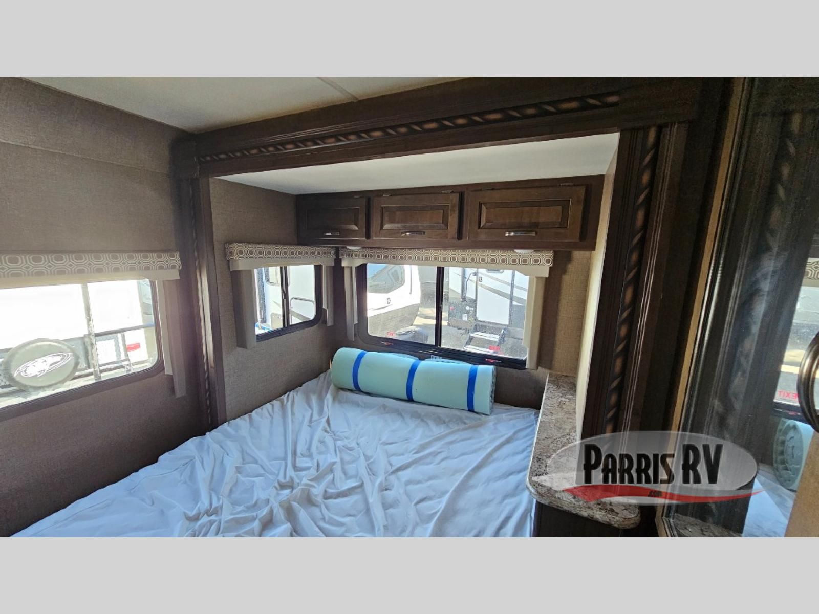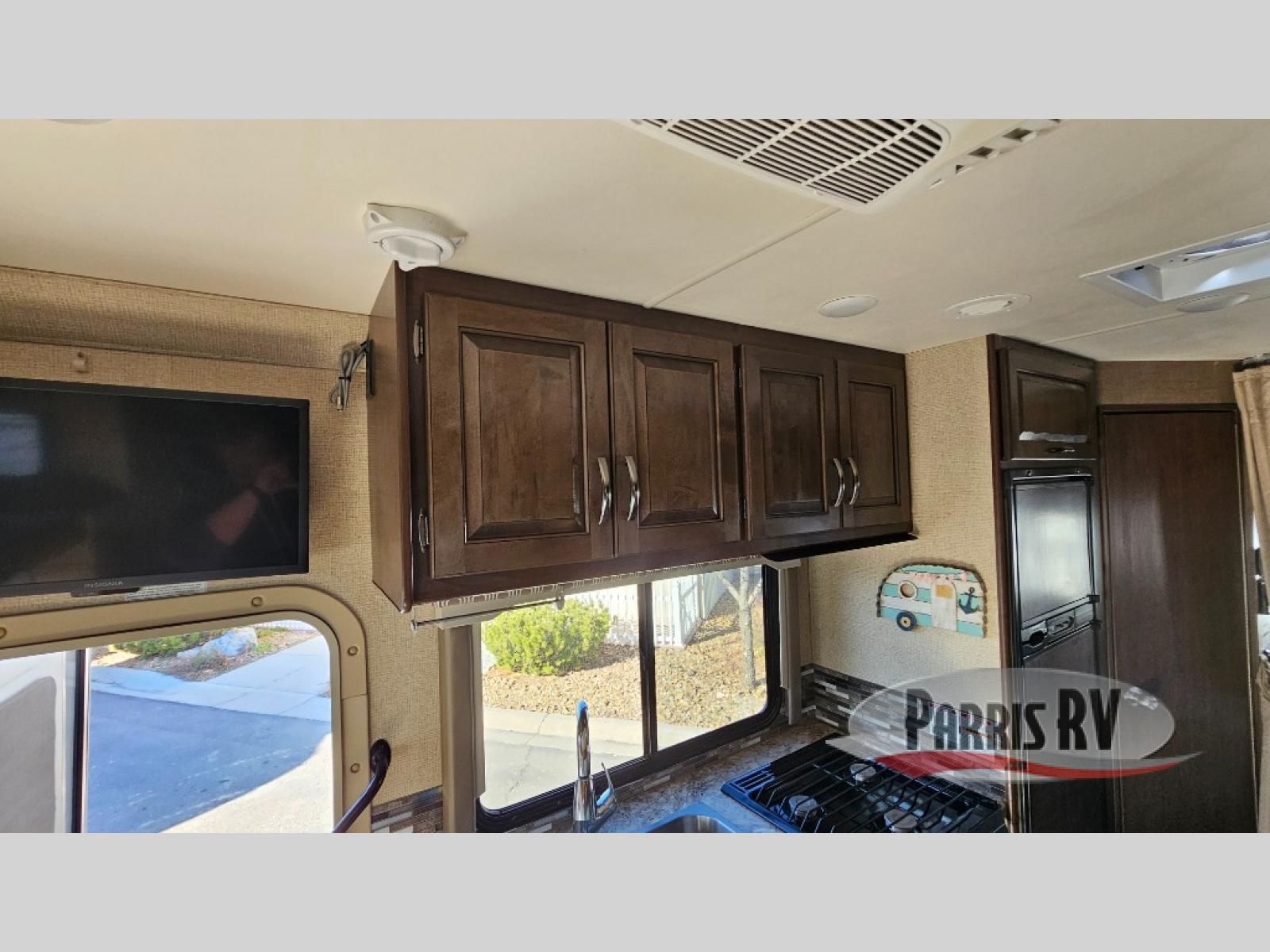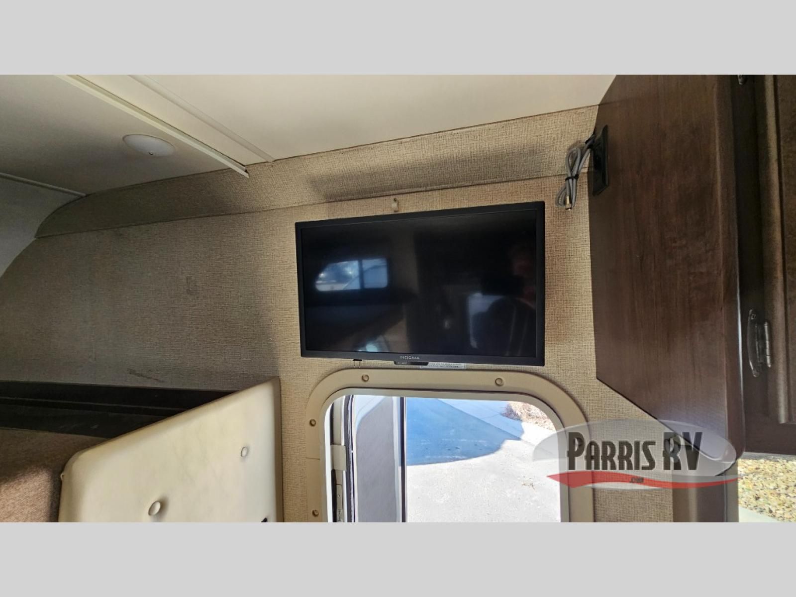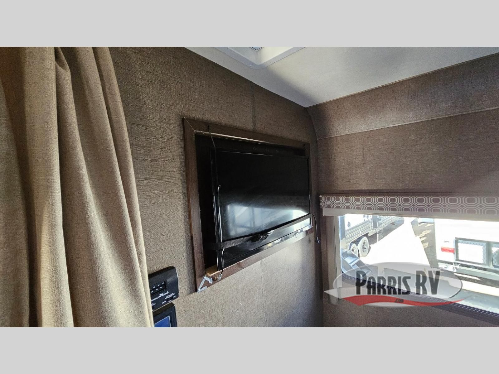 As you enter behind the passenger seat you will see a 32" LED TV overhead, and a cab-over bunk to your right along the front. The bunk provides 52" x 87" of extra sleeping space for the kids or friends.
