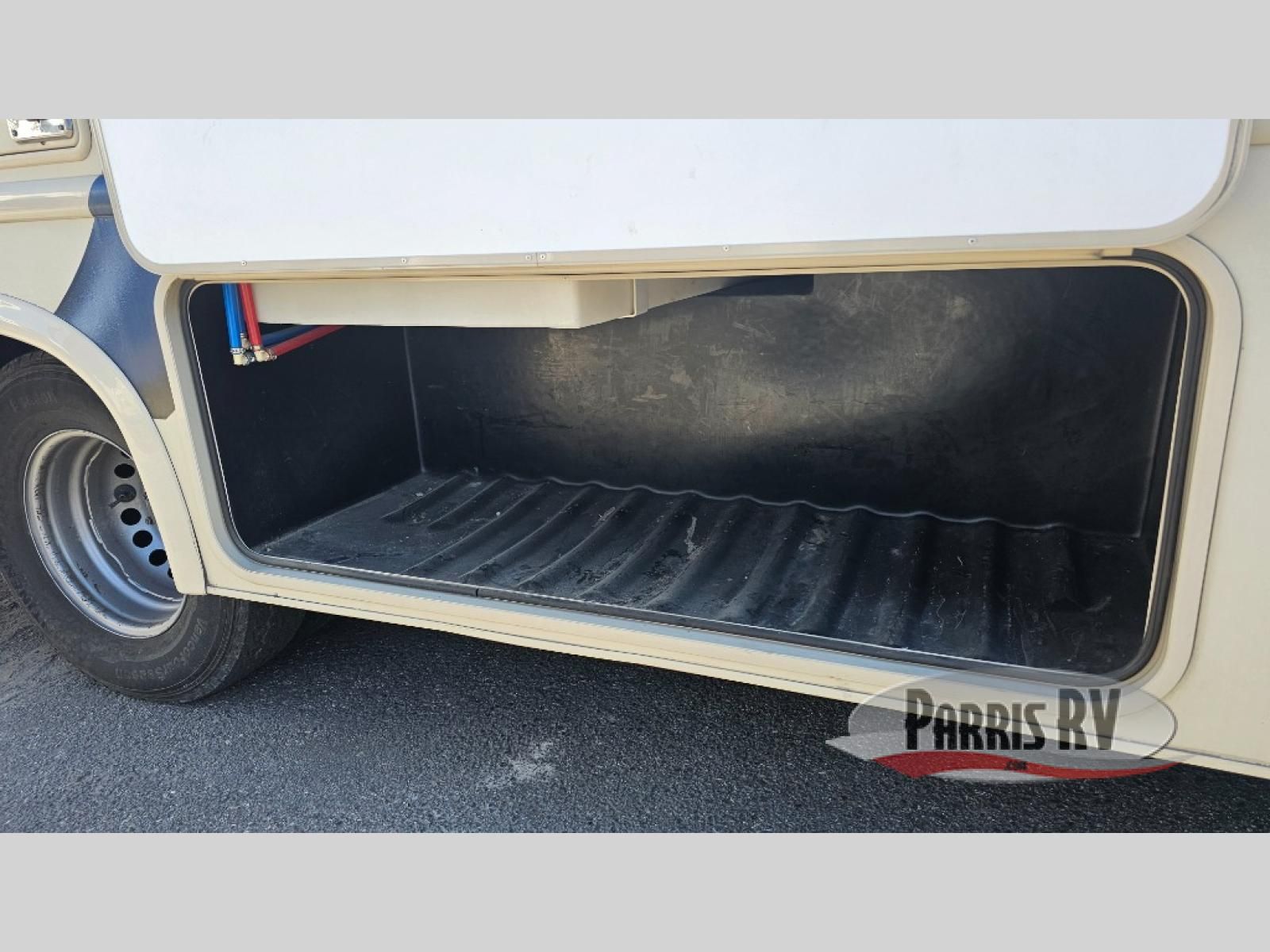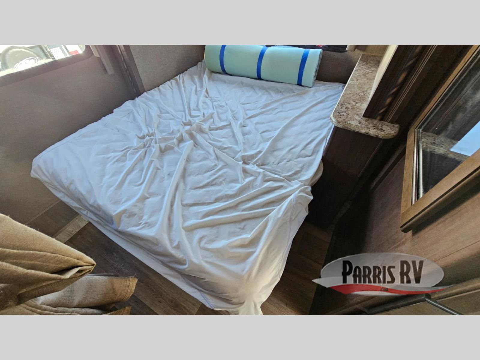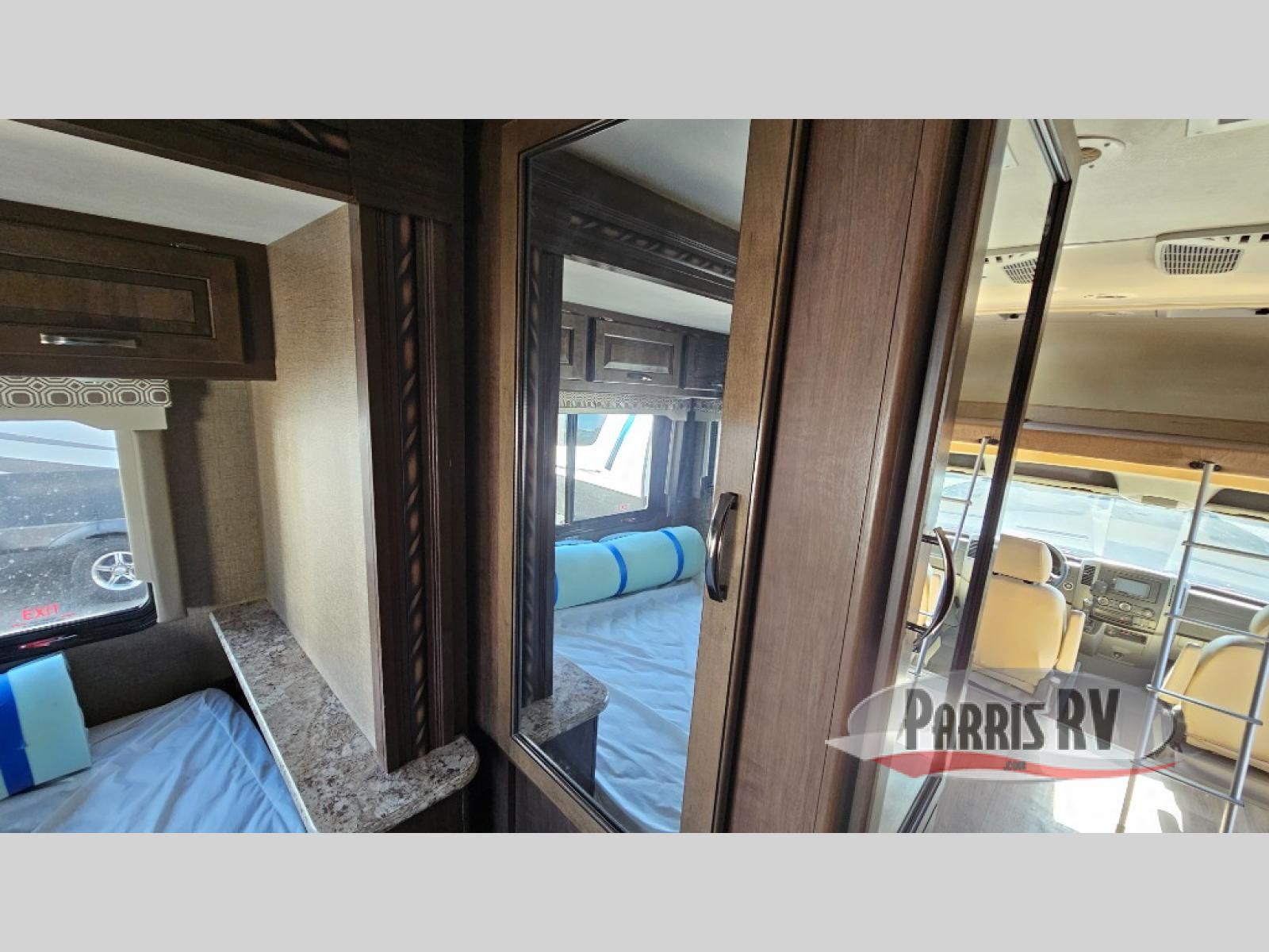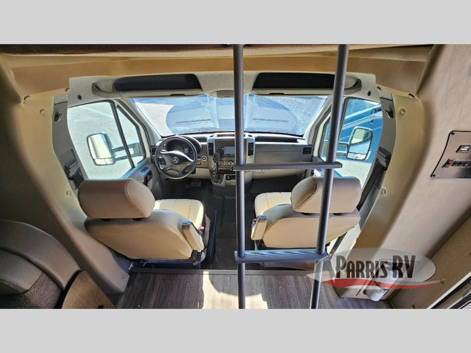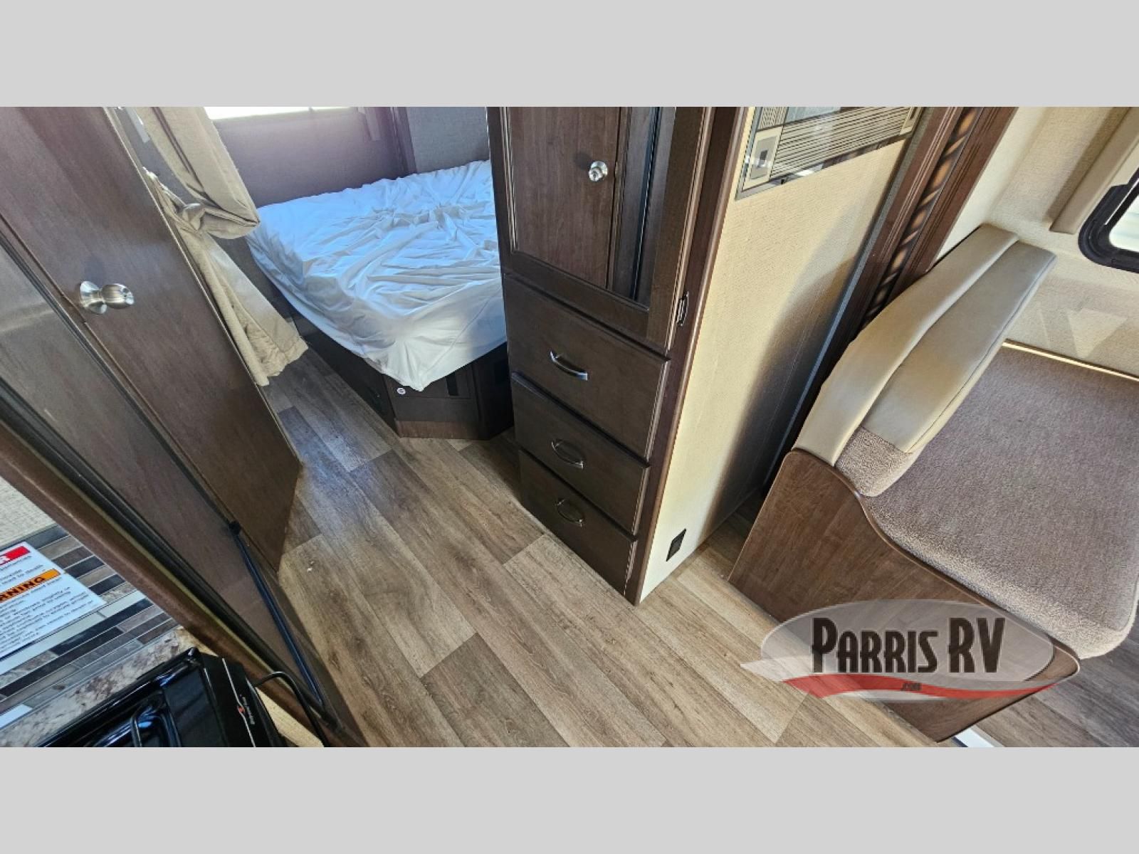 As you enter behind the passenger seat you will see a 32" LED TV overhead, and a cab-over bunk to your right along the front. The bunk provides 52" x 87" of extra sleeping space for the kids or friends.