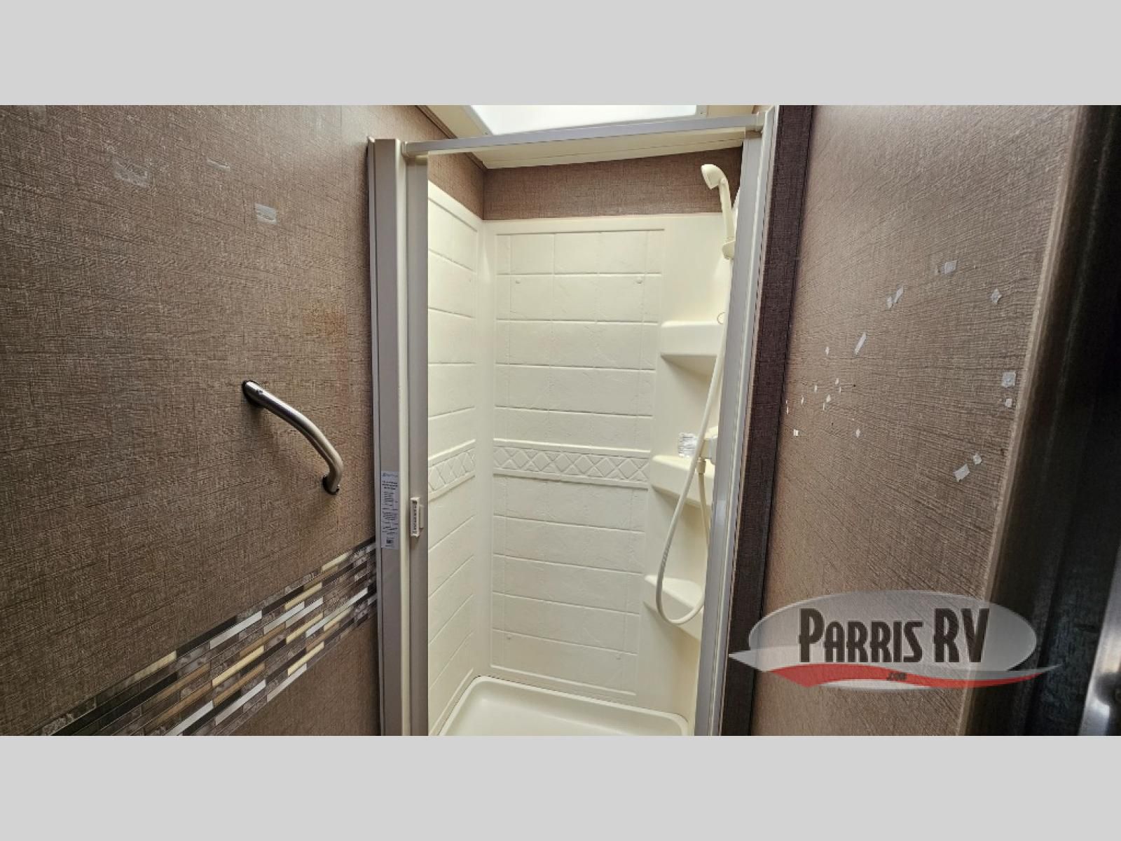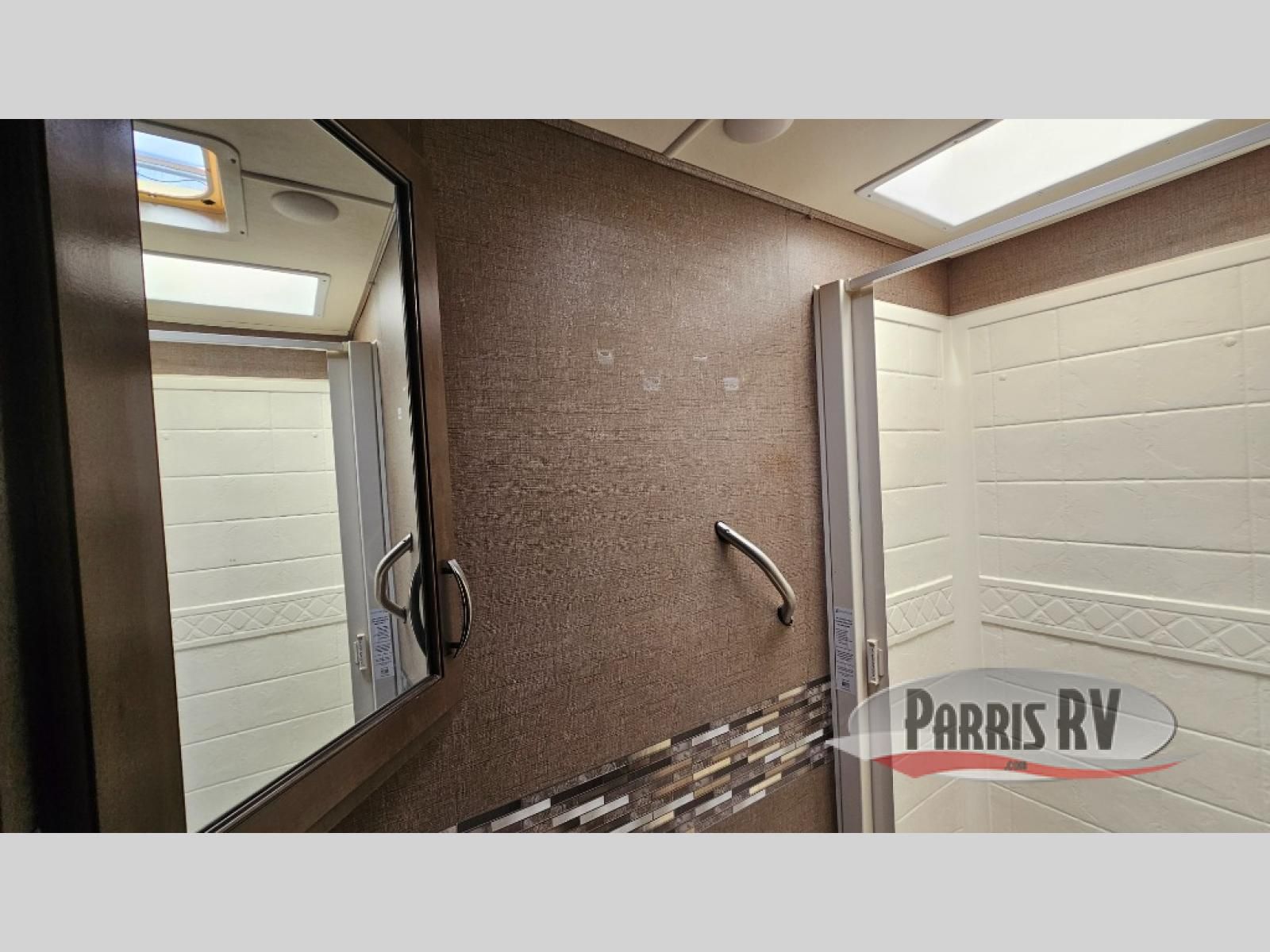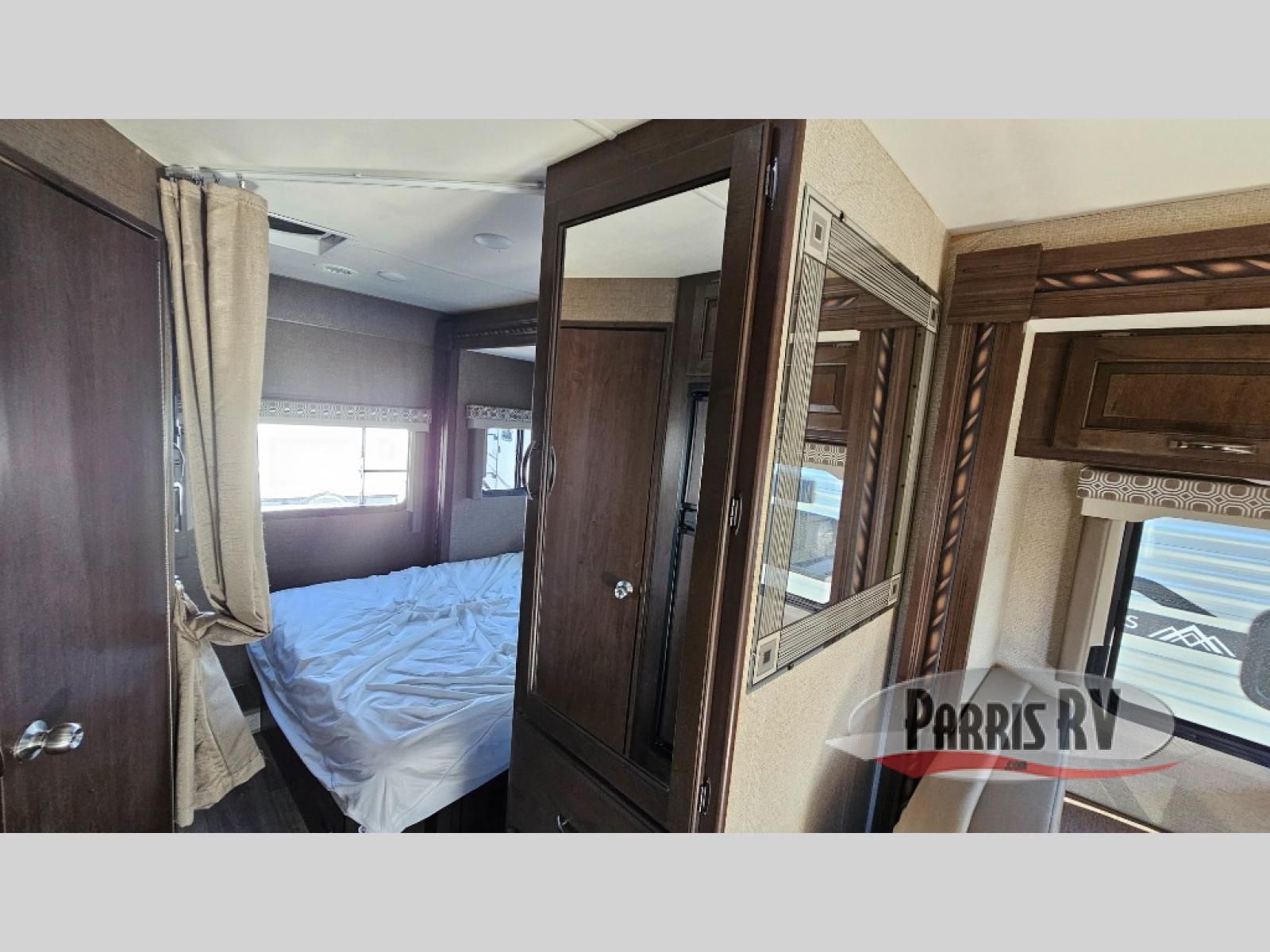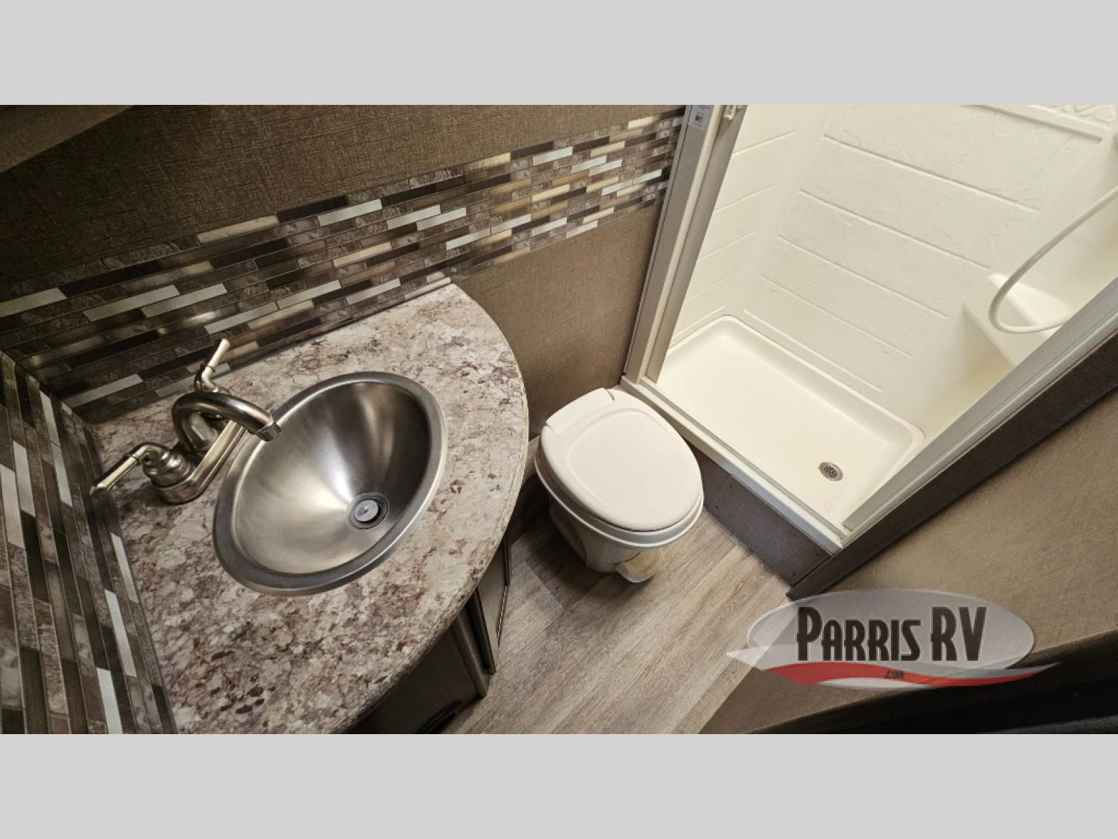 Continue toward the rear to find a full size bed along the left corner including a location for an optional 28" LED TV. Along the right corner there is a private shower and toilet room, plus a vanity with sink just outside the door.