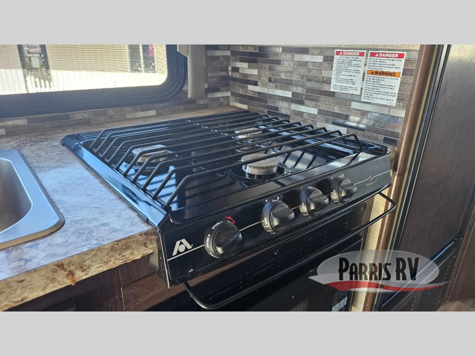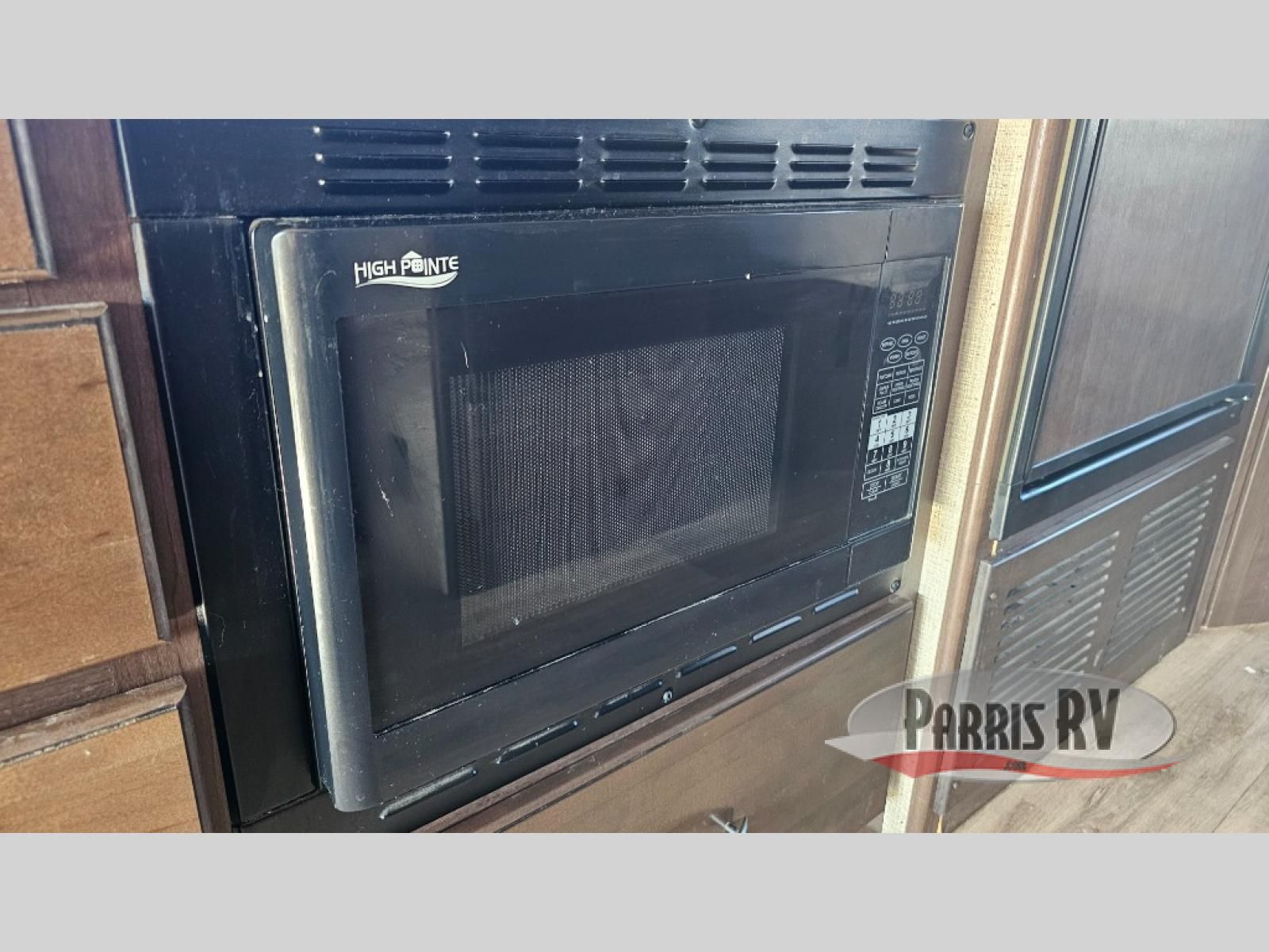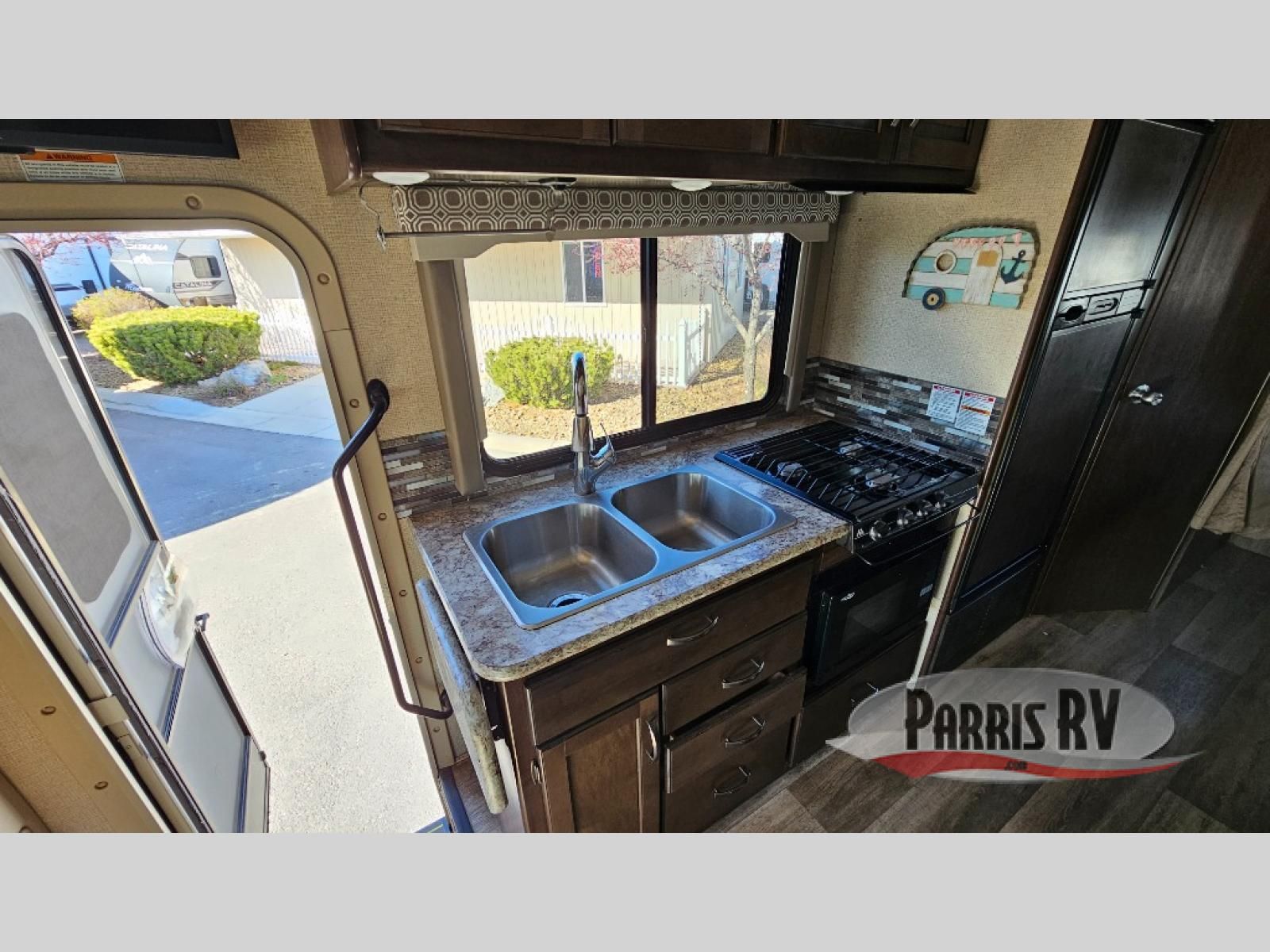 On the opposite side you can make your favorite meals with the three burner range, microwave oven, double kitchen sink, and refrigerator. There is a flip-up countertop and overhead cabinets as well.