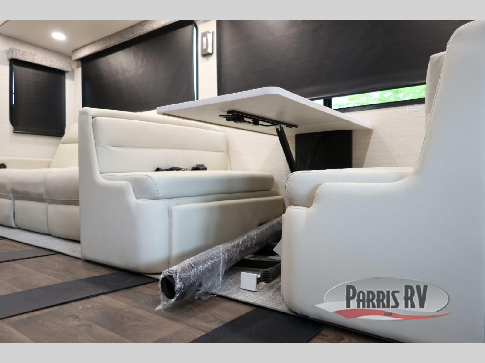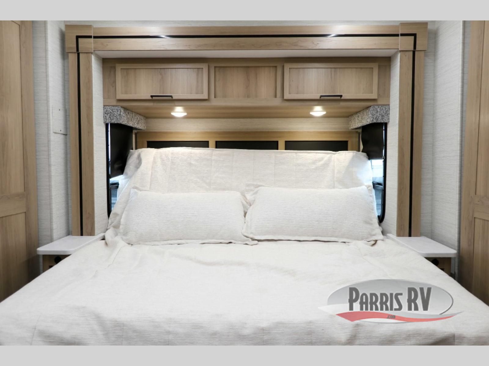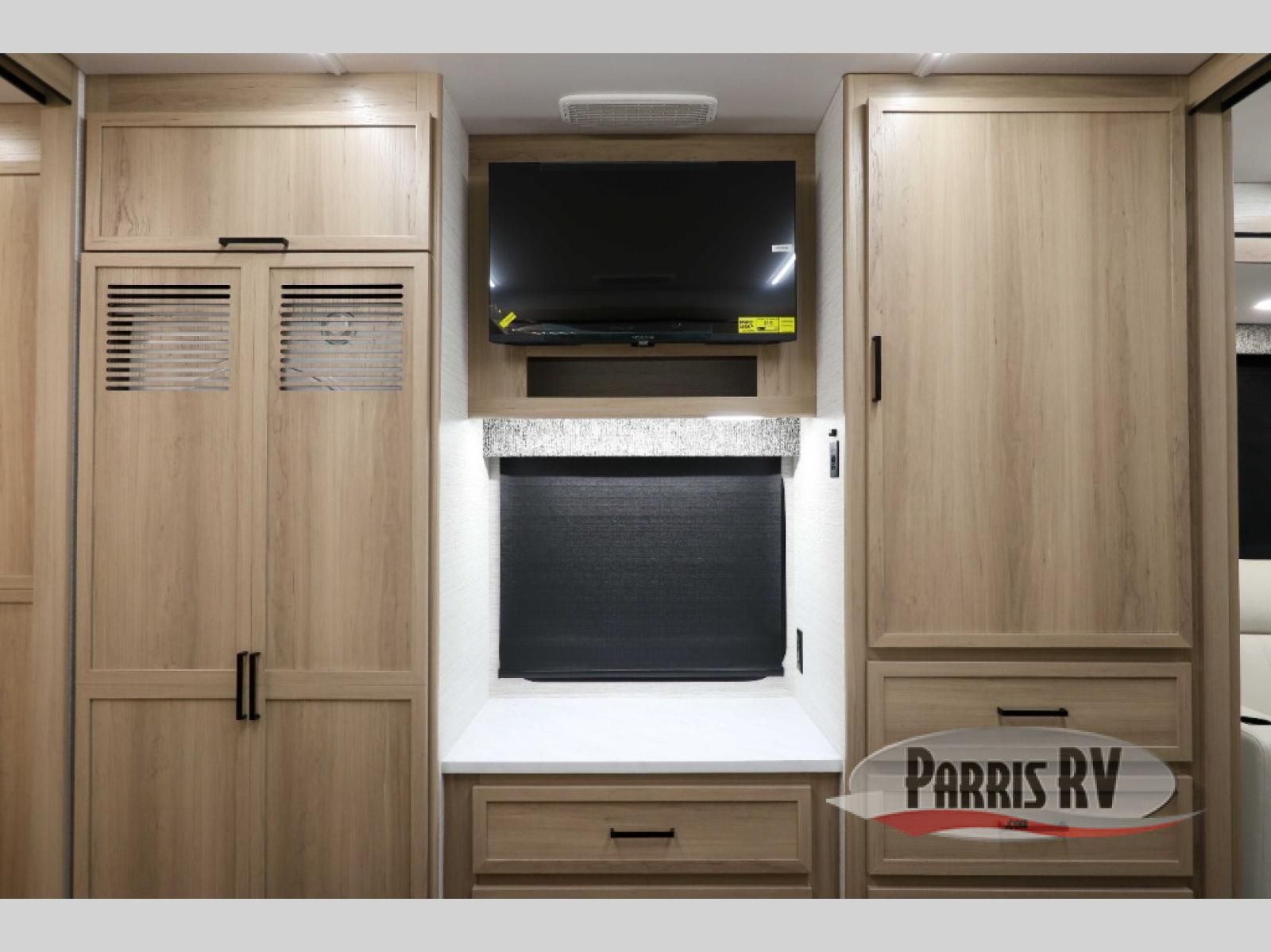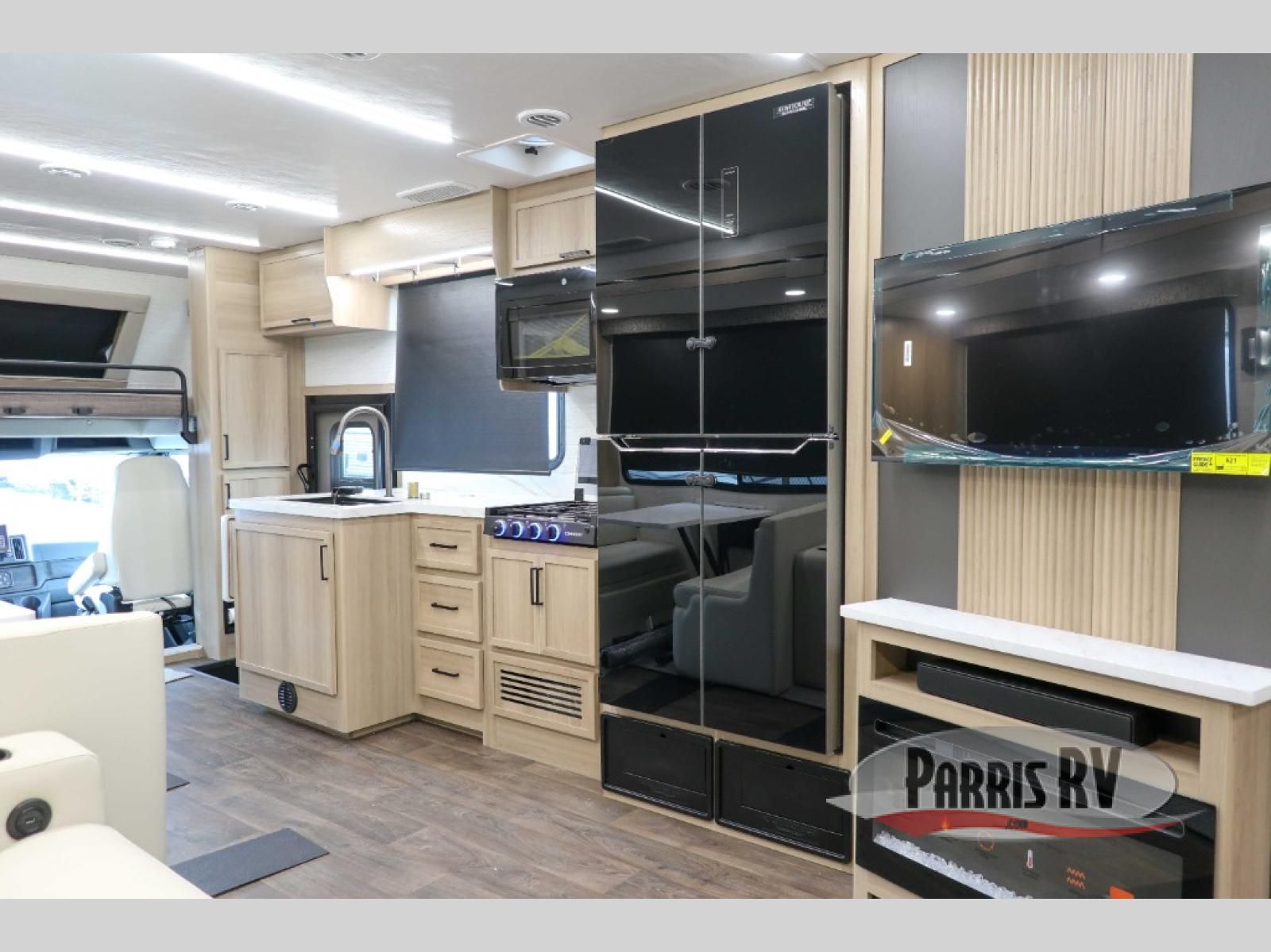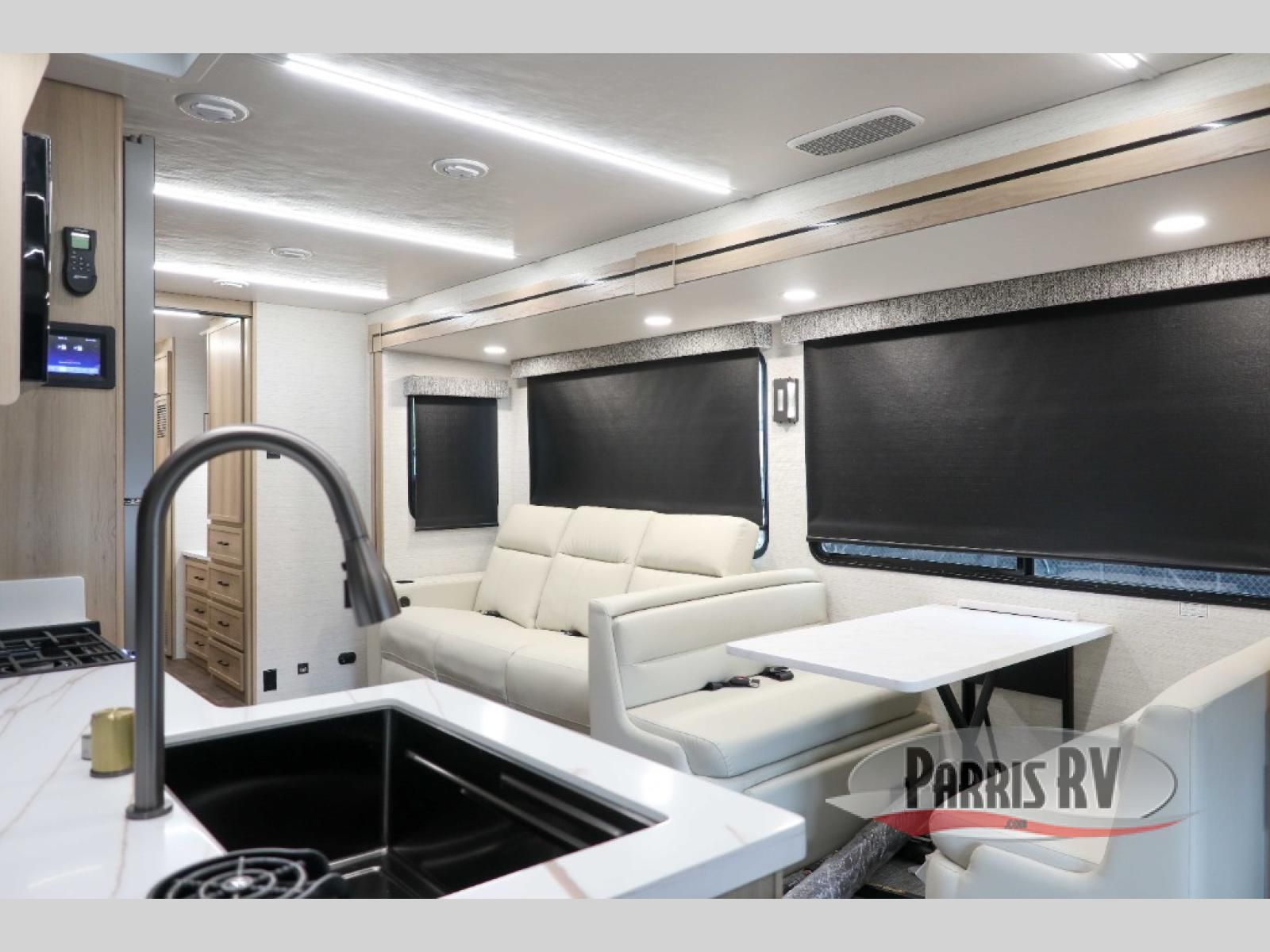 At the front, you're welcomed into the cockpit area with an overhead bunk that adds sleeping space without sacrificing comfort. The spacious living area features a large slideout that houses a tri-fold sleeper sofa, giving you both a cozy place to relax and accommodations for guests. Next to it, the Dream Dinette is perfect for enjoying meals, playing board games, or simply spending quality time together. The slideout also includes a pantry, offering storage for dry goods, while across from it the kitchen features an L-shaped solid surface countertops, a gunmetal steel sink, a sealed glass range with glass cover, and a 15-cu. ft. refrigerator to easily handle all your grocery needs. Multiple TVs, one in the kitchen area and another across from the sofa, make movie nights effortless. A convenient half bath is located mid-coach, while the rear of the motorhome is dedicated to a private bedroom featuring a king bed slideout, nightstands on both sides, dual wardrobes, a dresser, and a centrally located 32" TV. At the very back, the full bathroom completes the layout with a medicine cabinet and an additional wardrobe, delivering comfort, functionality, and abundant storage throughout the coach.