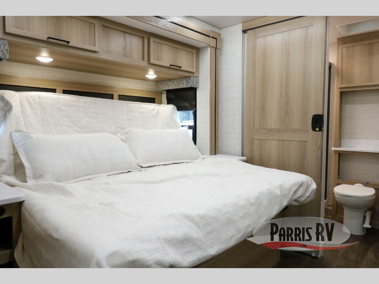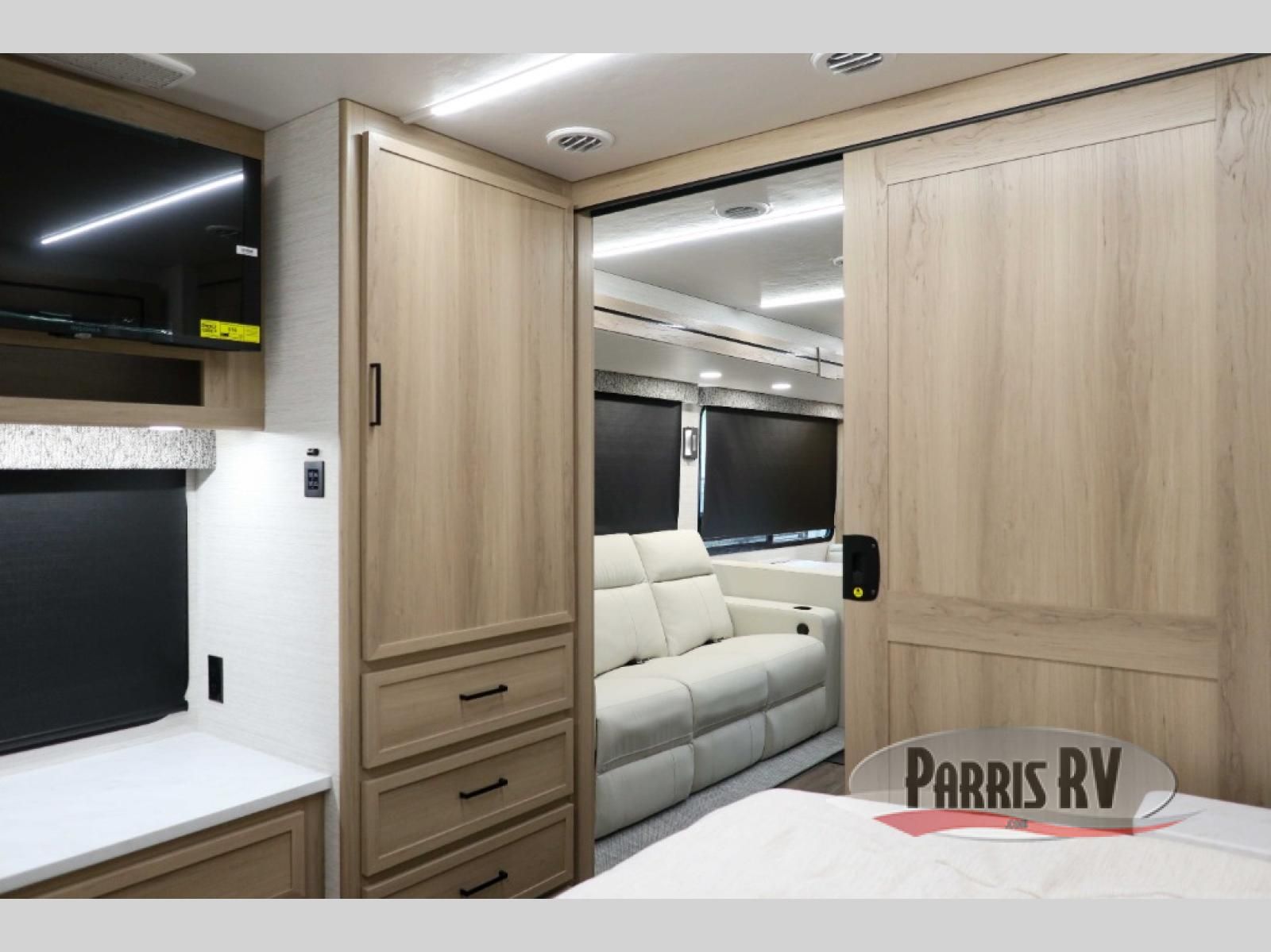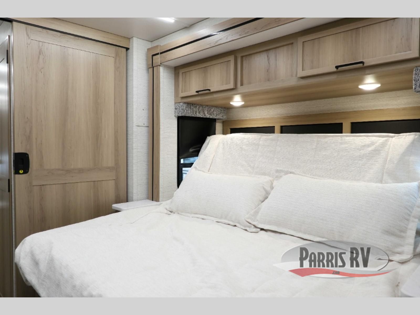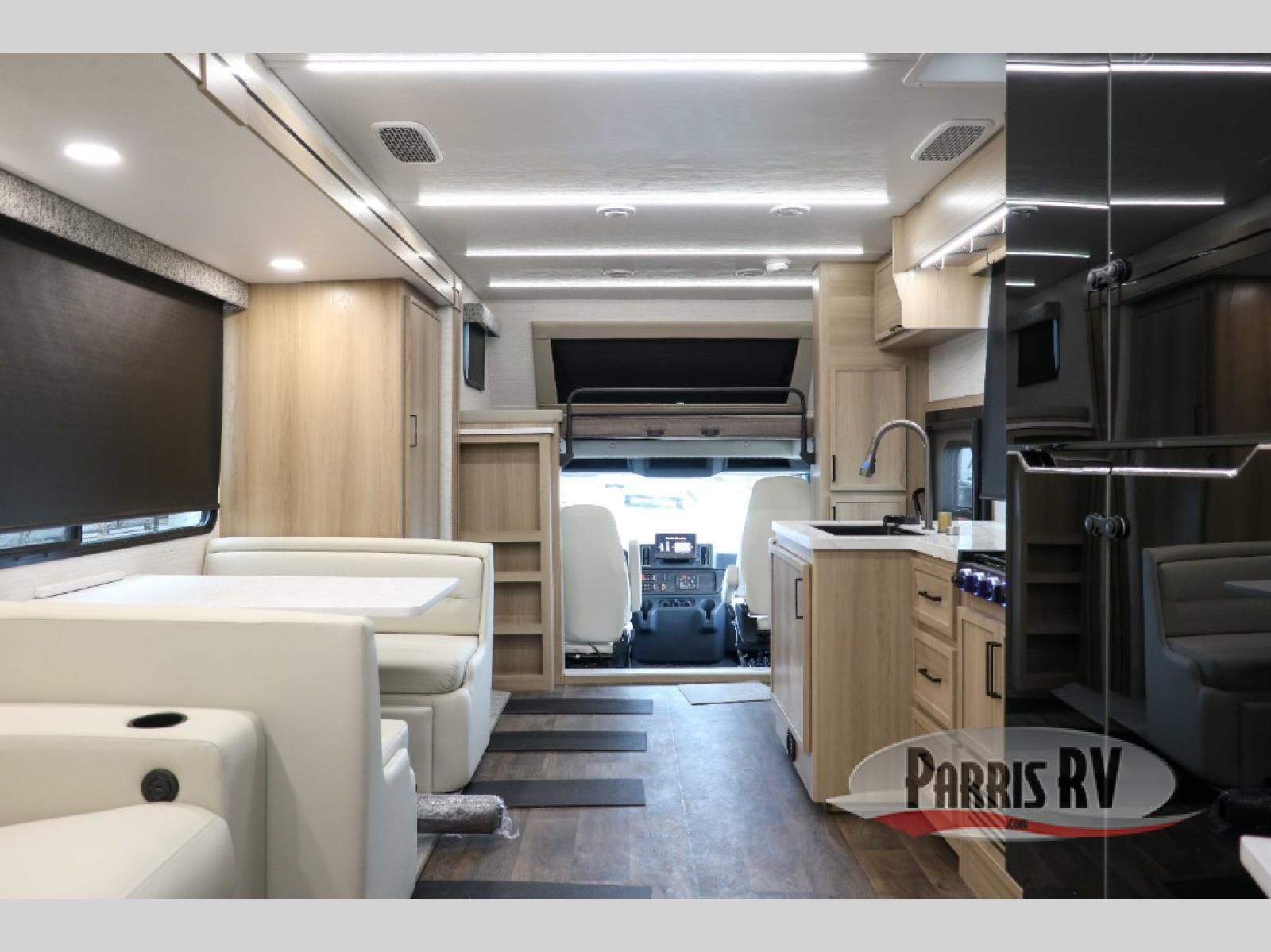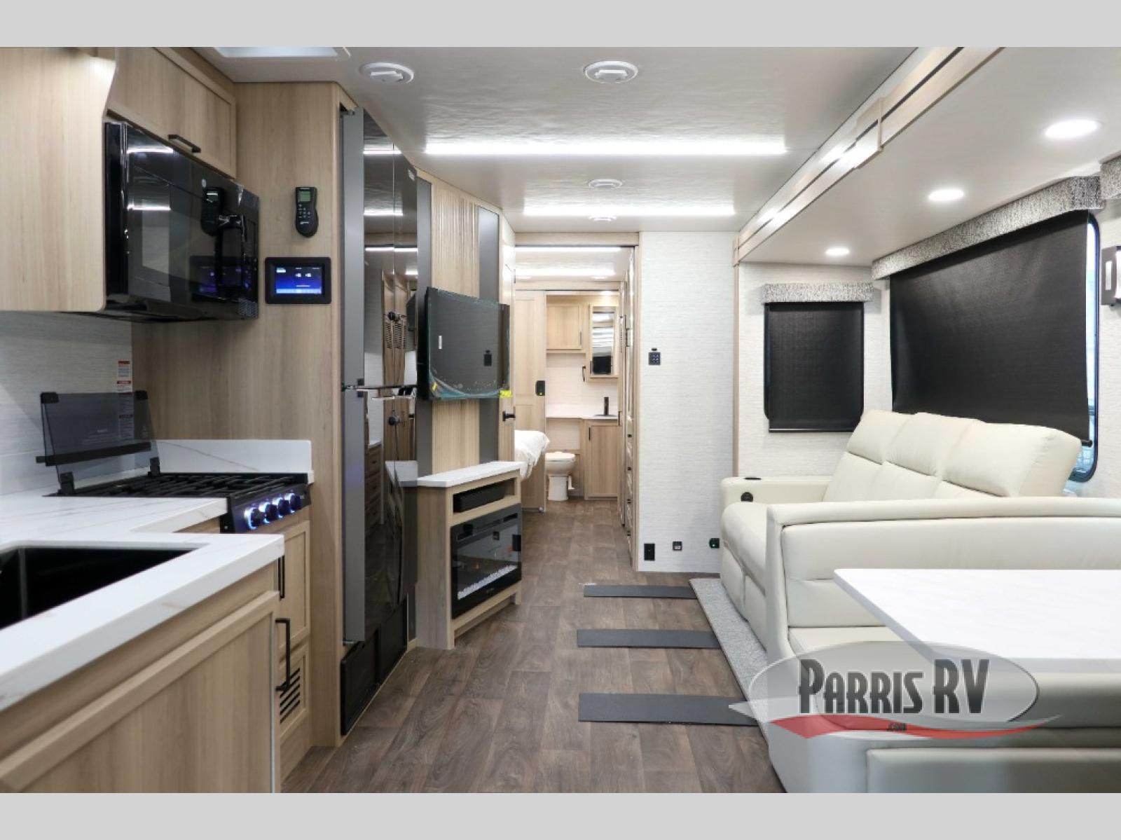 At the front, you're welcomed into the cockpit area with an overhead bunk that adds sleeping space without sacrificing comfort. The spacious living area features a large slideout that houses a tri-fold sleeper sofa, giving you both a cozy place to relax and accommodations for guests. Next to it, the Dream Dinette is perfect for enjoying meals, playing board games, or simply spending quality time together. The slideout also includes a pantry, offering storage for dry goods, while across from it the kitchen features an L-shaped solid surface countertops, a gunmetal steel sink, a sealed glass range with glass cover, and a 15-cu. ft. refrigerator to easily handle all your grocery needs. Multiple TVs, one in the kitchen area and another across from the sofa, make movie nights effortless. A convenient half bath is located mid-coach, while the rear of the motorhome is dedicated to a private bedroom featuring a king bed slideout, nightstands on both sides, dual wardrobes, a dresser, and a centrally located 32" TV. At the very back, the full bathroom completes the layout with a medicine cabinet and an additional wardrobe, delivering comfort, functionality, and abundant storage throughout the coach.