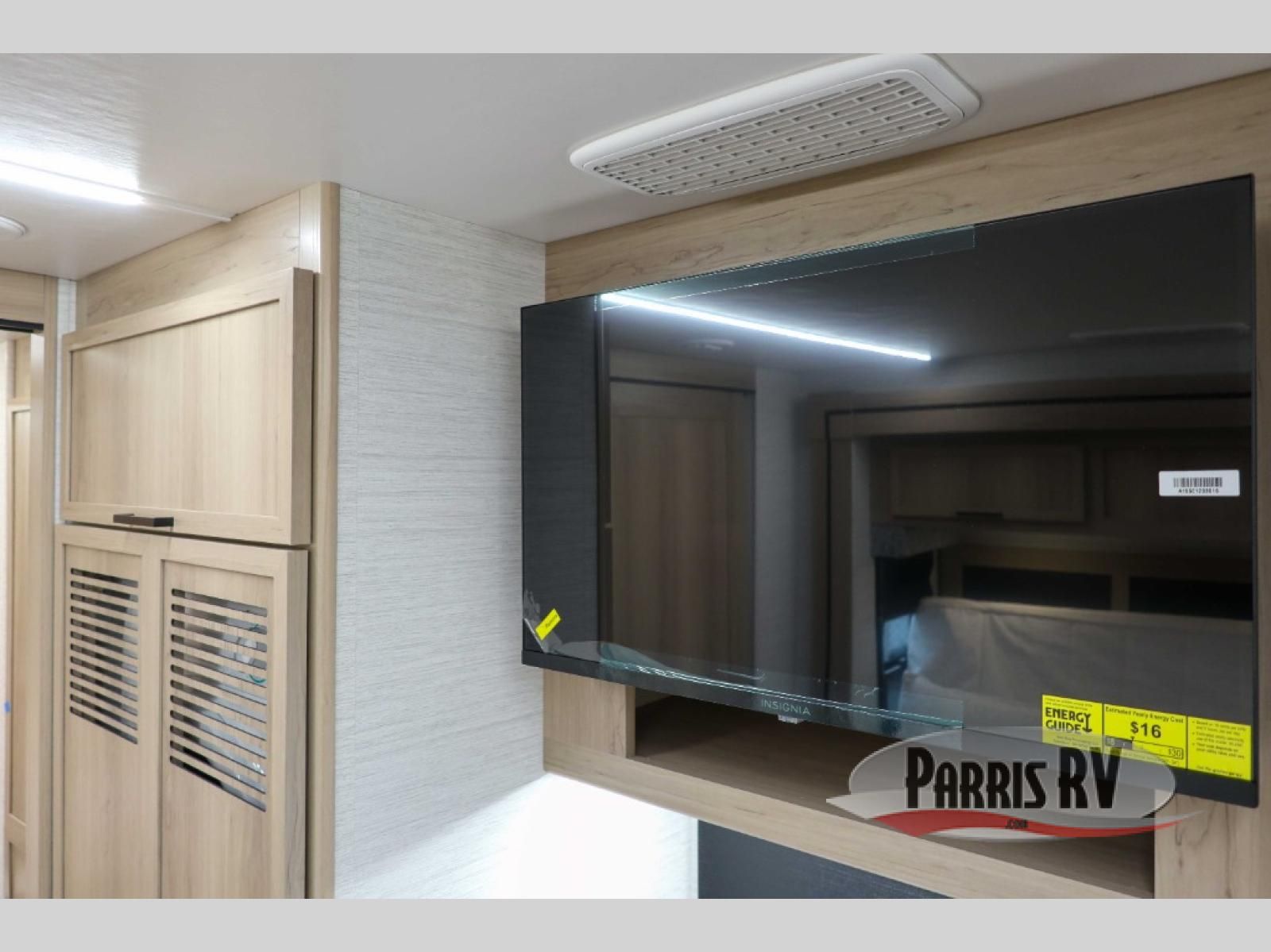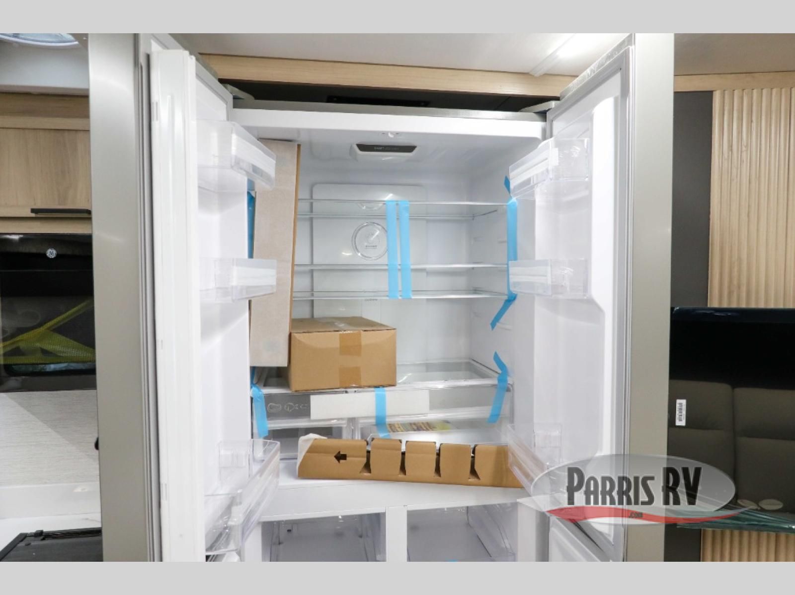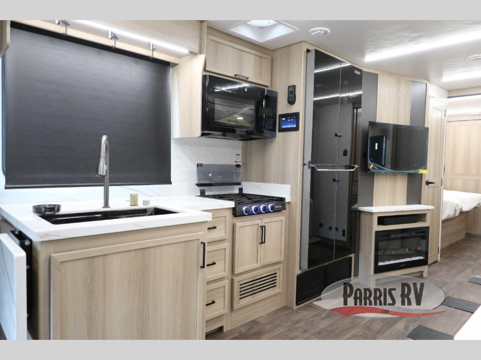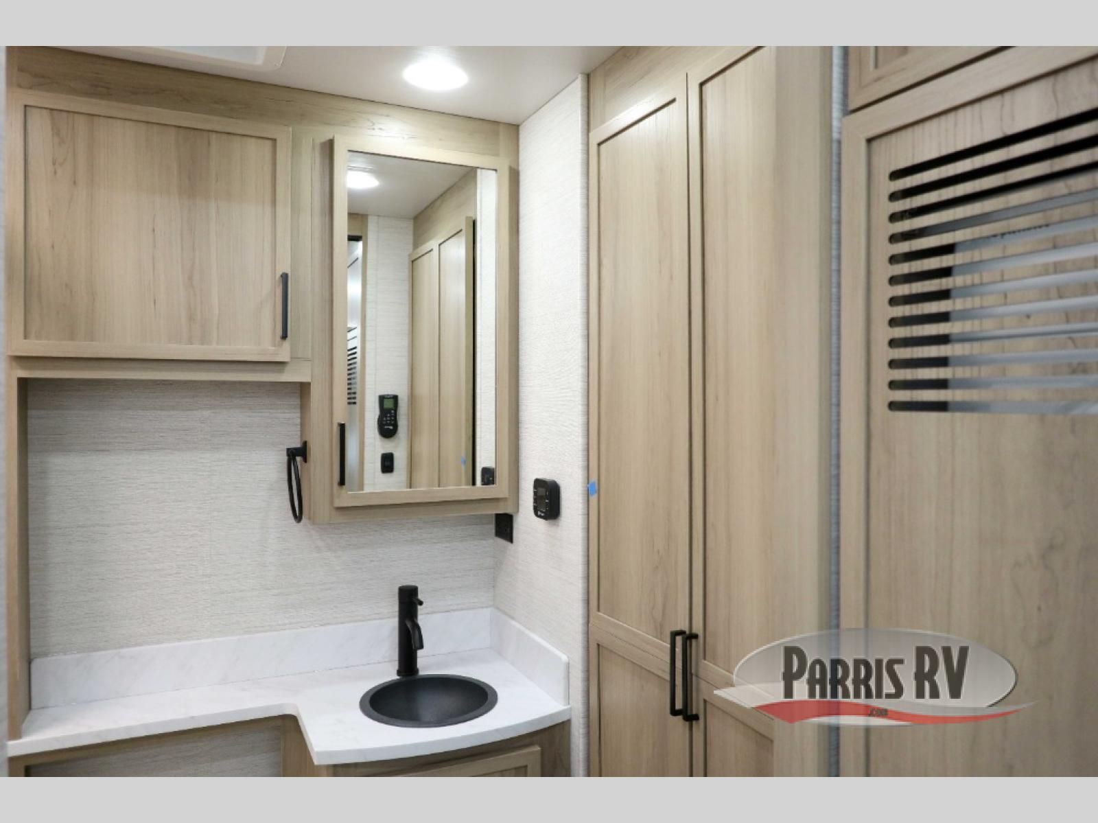 At the front, you're welcomed into the cockpit area with an overhead bunk that adds sleeping space without sacrificing comfort. The spacious living area features a large slideout that houses a tri-fold sleeper sofa, giving you both a cozy place to relax and accommodations for guests. Next to it, the Dream Dinette is perfect for enjoying meals, playing board games, or simply spending quality time together. The slideout also includes a pantry, offering storage for dry goods, while across from it the kitchen features an L-shaped solid surface countertops, a gunmetal steel sink, a sealed glass range with glass cover, and a 15-cu. ft. refrigerator to easily handle all your grocery needs. Multiple TVs, one in the kitchen area and another across from the sofa, make movie nights effortless. A convenient half bath is located mid-coach, while the rear of the motorhome is dedicated to a private bedroom featuring a king bed slideout, nightstands on both sides, dual wardrobes, a dresser, and a centrally located 32" TV. At the very back, the full bathroom completes the layout with a medicine cabinet and an additional wardrobe, delivering comfort, functionality, and abundant storage throughout the coach.