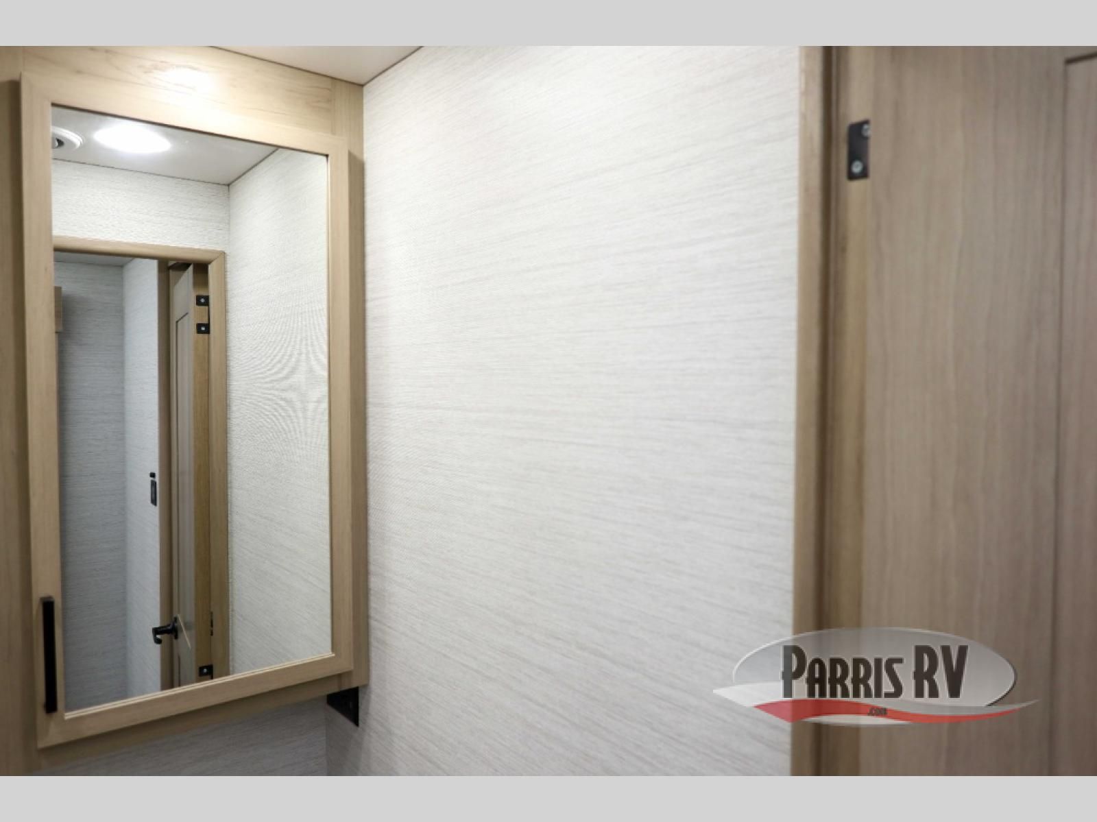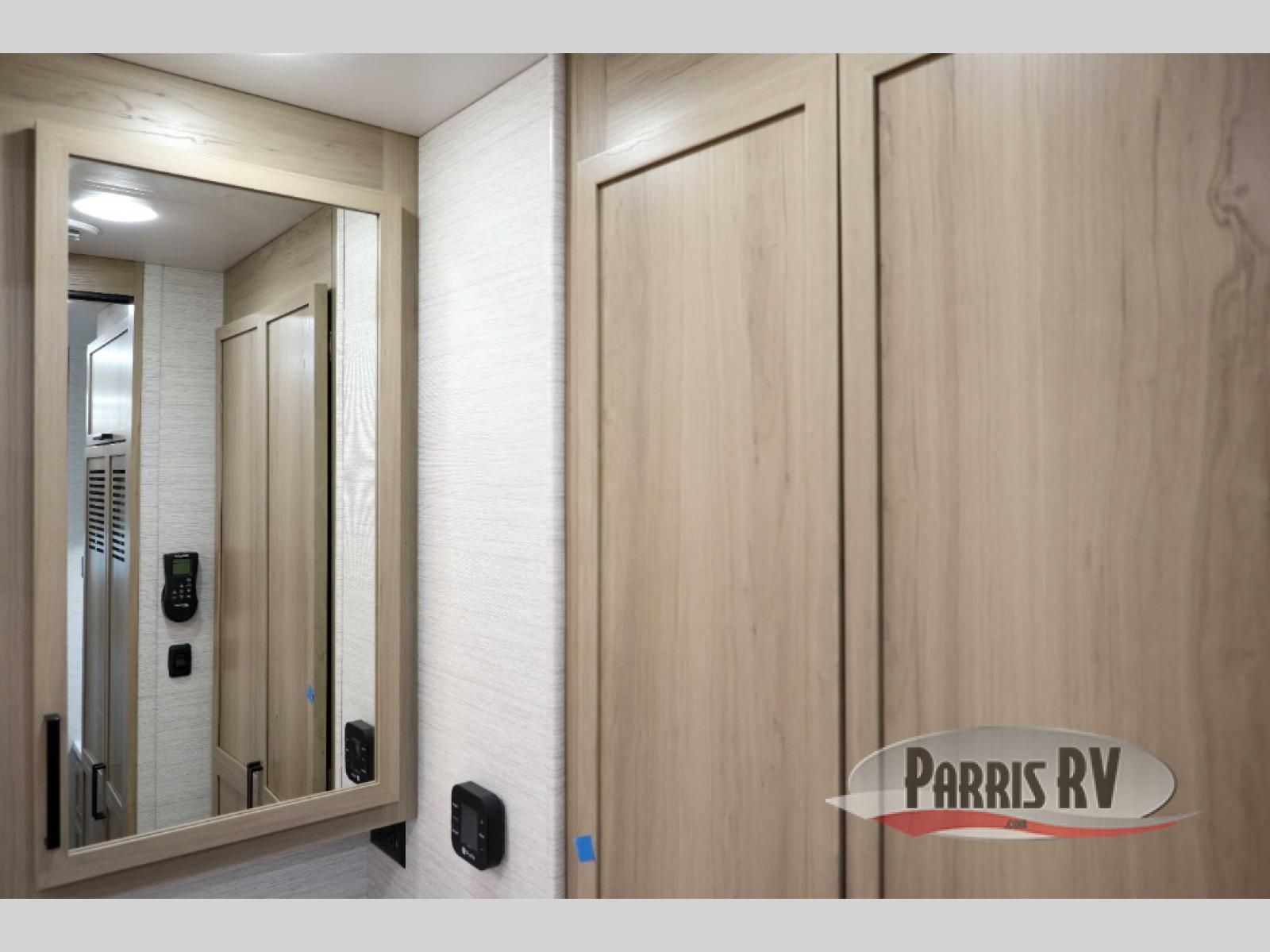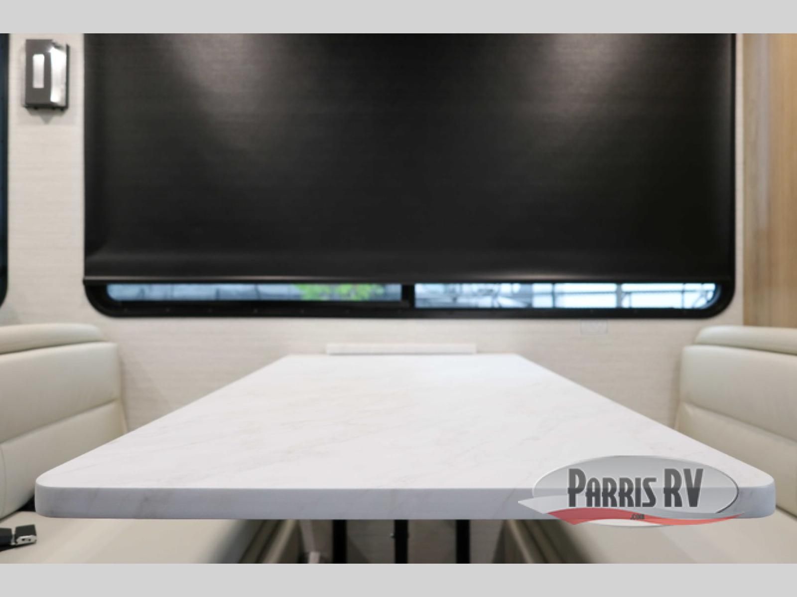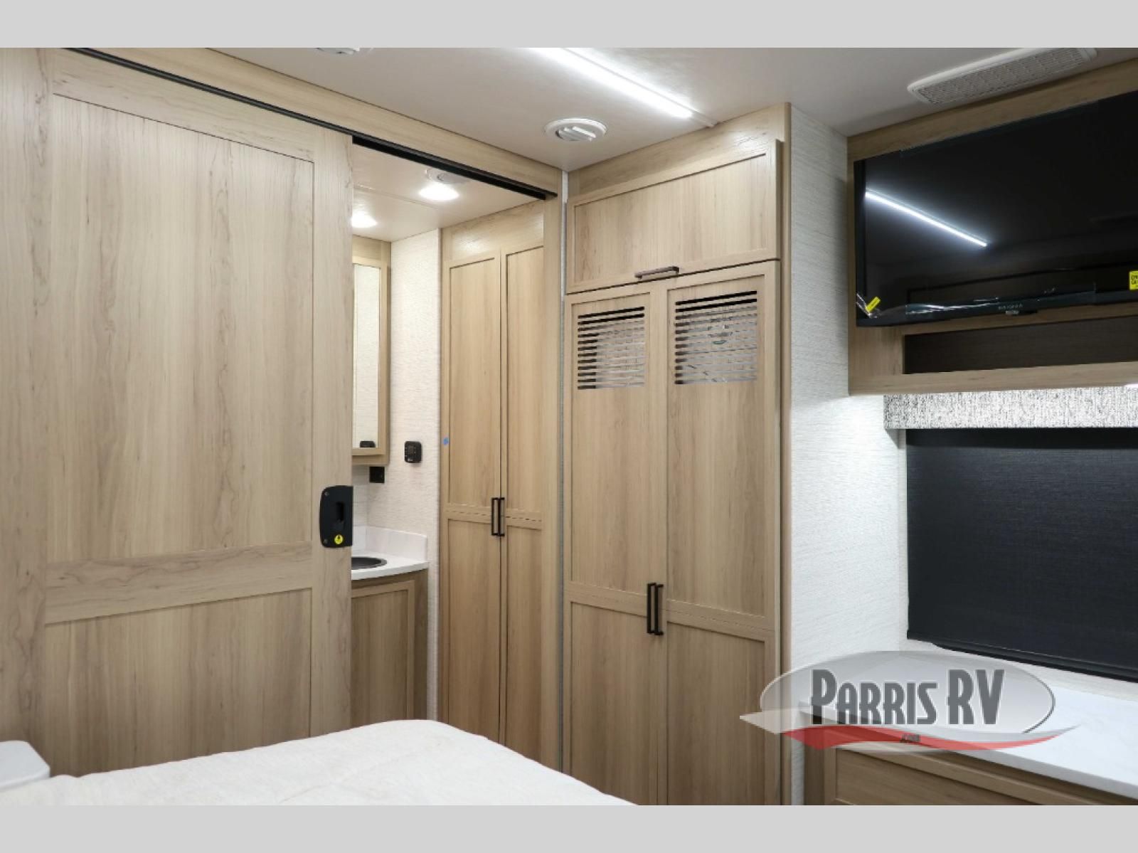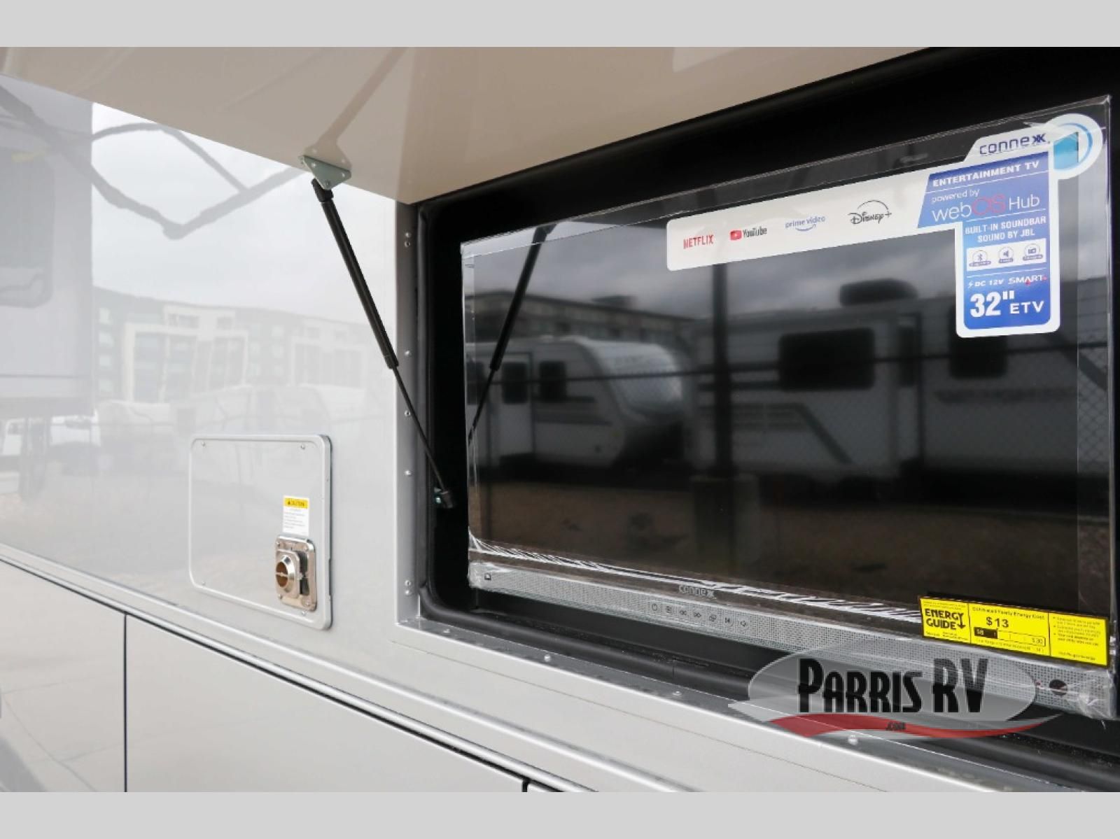 At the front, you're welcomed into the cockpit area with an overhead bunk that adds sleeping space without sacrificing comfort. The spacious living area features a large slideout that houses a tri-fold sleeper sofa, giving you both a cozy place to relax and accommodations for guests. Next to it, the Dream Dinette is perfect for enjoying meals, playing board games, or simply spending quality time together. The slideout also includes a pantry, offering storage for dry goods, while across from it the kitchen features an L-shaped solid surface countertops, a gunmetal steel sink, a sealed glass range with glass cover, and a 15-cu. ft. refrigerator to easily handle all your grocery needs. Multiple TVs, one in the kitchen area and another across from the sofa, make movie nights effortless. A convenient half bath is located mid-coach, while the rear of the motorhome is dedicated to a private bedroom featuring a king bed slideout, nightstands on both sides, dual wardrobes, a dresser, and a centrally located 32" TV. At the very back, the full bathroom completes the layout with a medicine cabinet and an additional wardrobe, delivering comfort, functionality, and abundant storage throughout the coach.