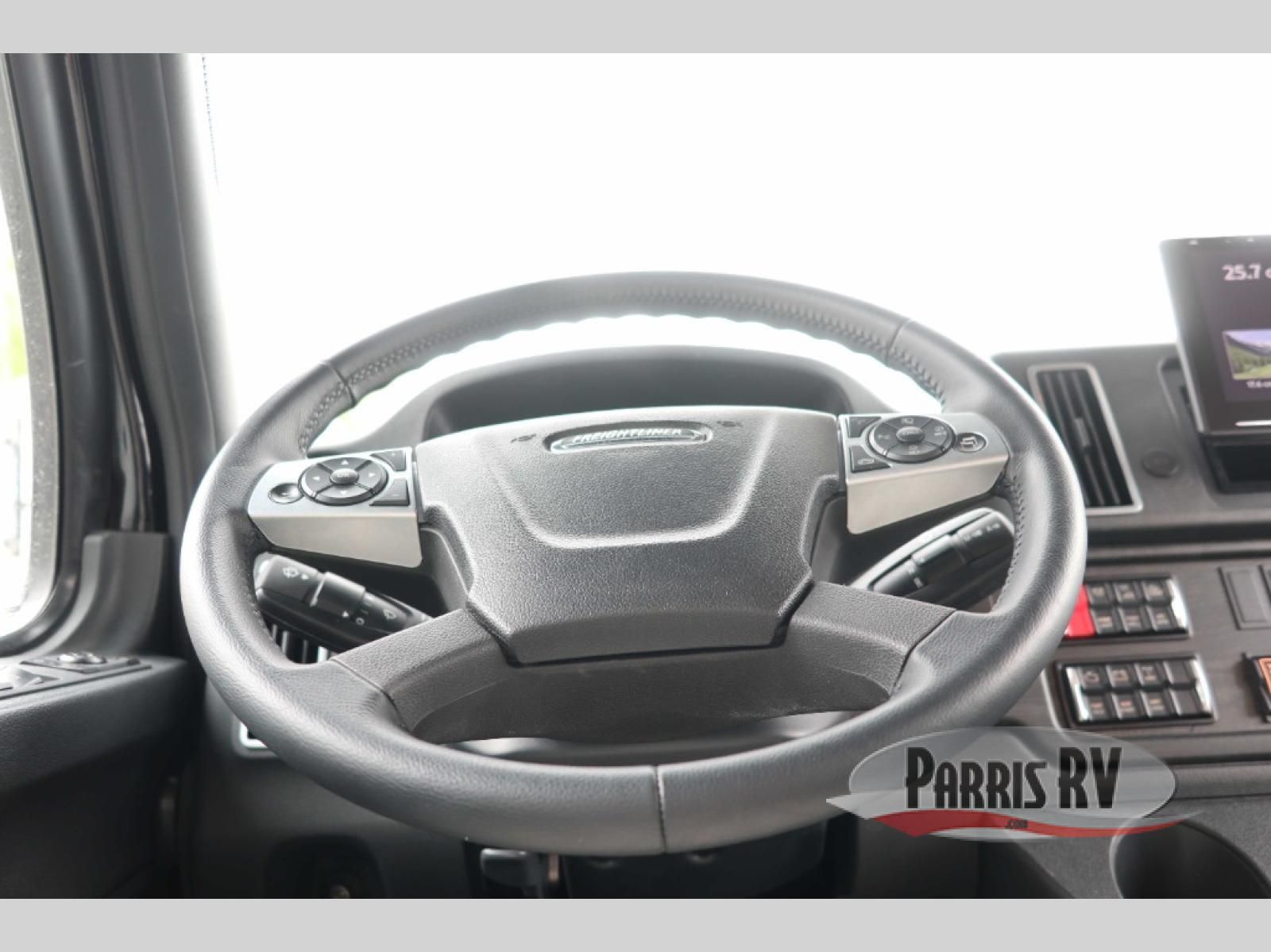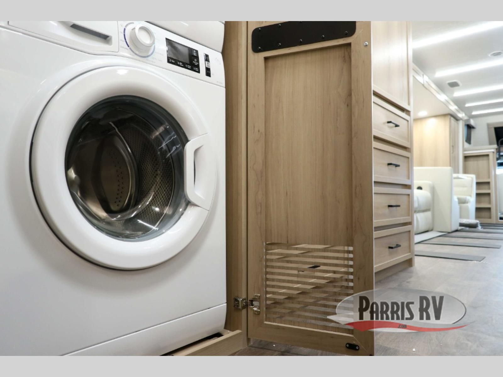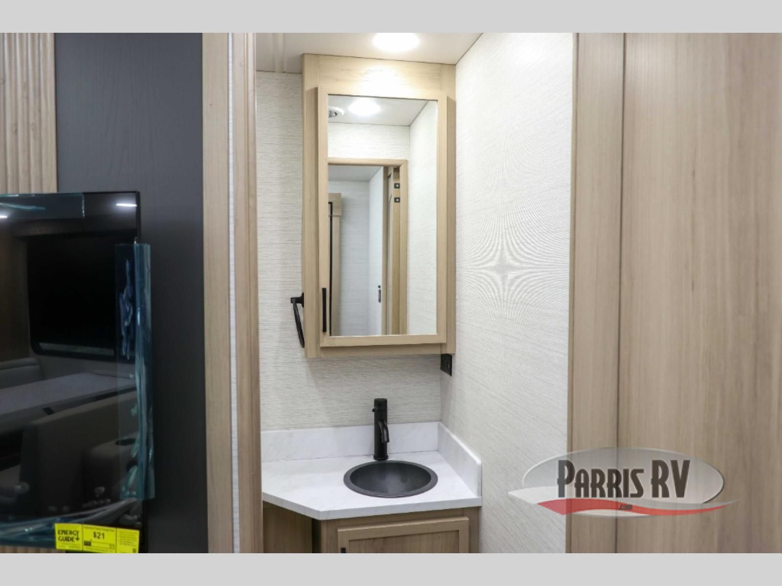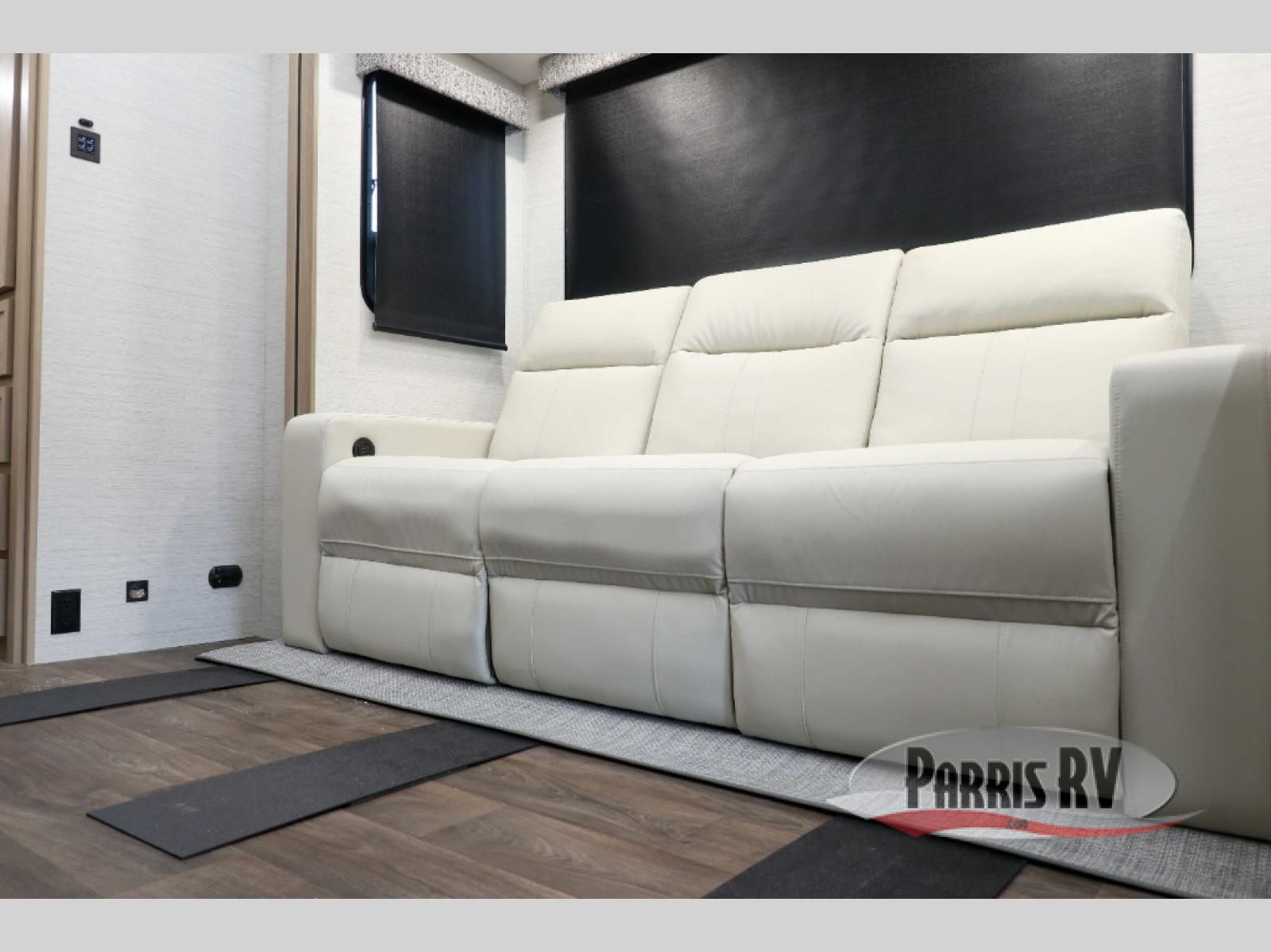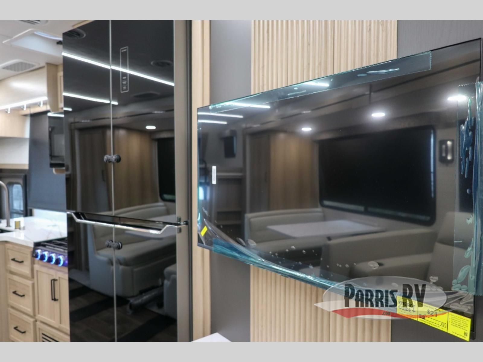 At the front, you're welcomed into the cockpit area with an overhead bunk that adds sleeping space without sacrificing comfort. The spacious living area features a large slideout that houses a tri-fold sleeper sofa, giving you both a cozy place to relax and accommodations for guests. Next to it, the Dream Dinette is perfect for enjoying meals, playing board games, or simply spending quality time together. The slideout also includes a pantry, offering storage for dry goods, while across from it the kitchen features an L-shaped solid surface countertops, a gunmetal steel sink, a sealed glass range with glass cover, and a 15-cu. ft. refrigerator to easily handle all your grocery needs. Multiple TVs, one in the kitchen area and another across from the sofa, make movie nights effortless. A convenient half bath is located mid-coach, while the rear of the motorhome is dedicated to a private bedroom featuring a king bed slideout, nightstands on both sides, dual wardrobes, a dresser, and a centrally located 32" TV. At the very back, the full bathroom completes the layout with a medicine cabinet and an additional wardrobe, delivering comfort, functionality, and abundant storage throughout the coach.