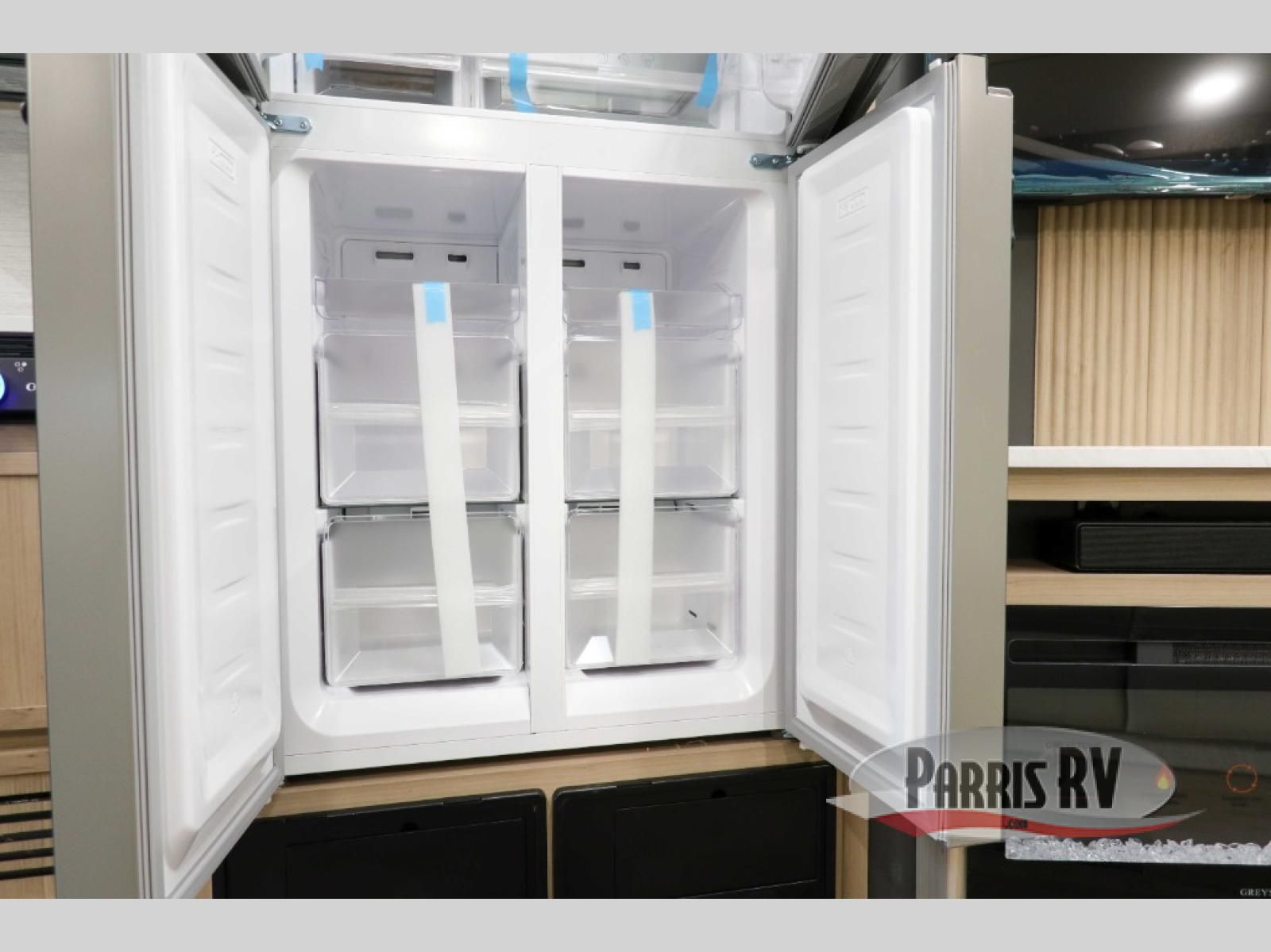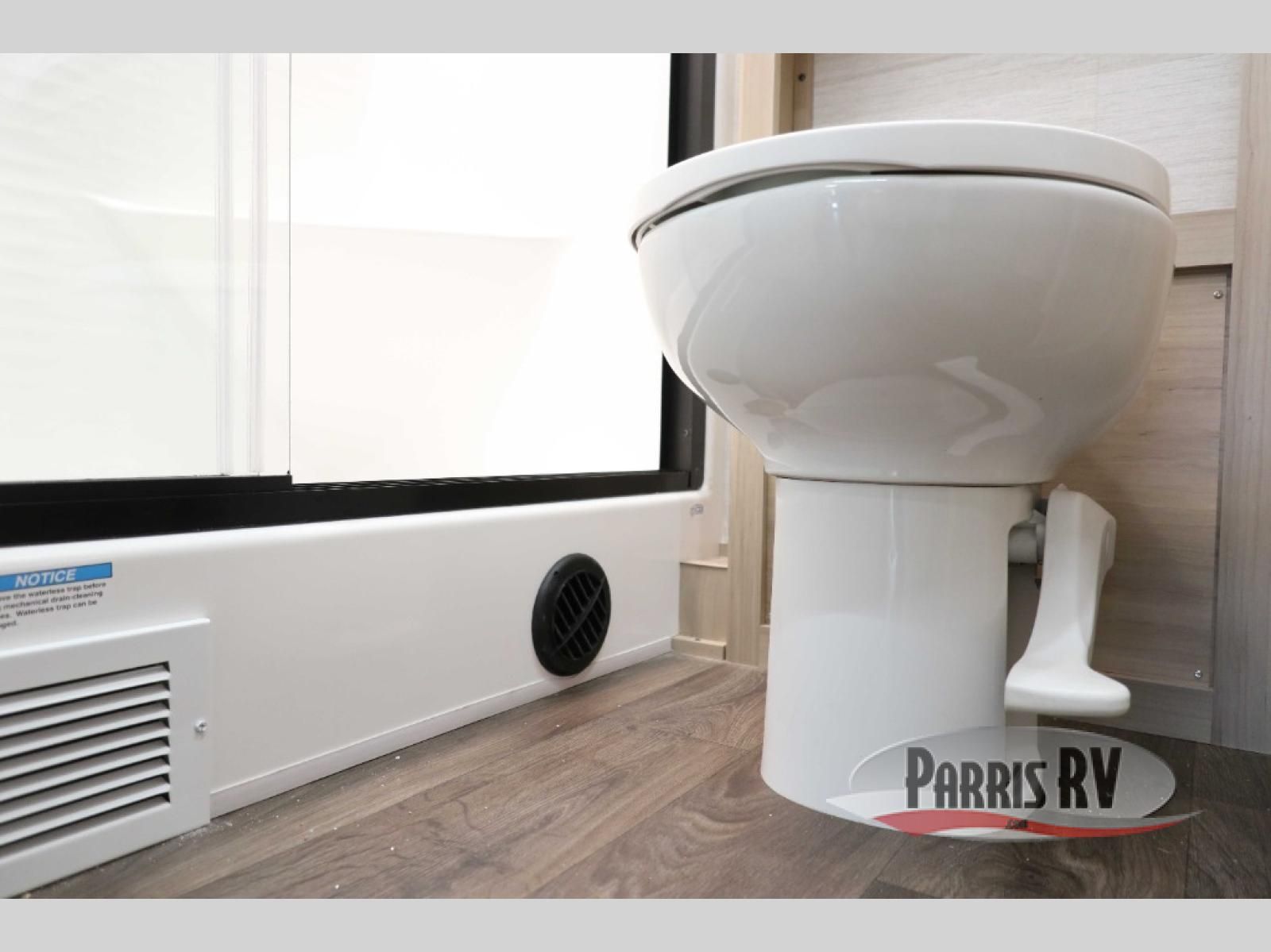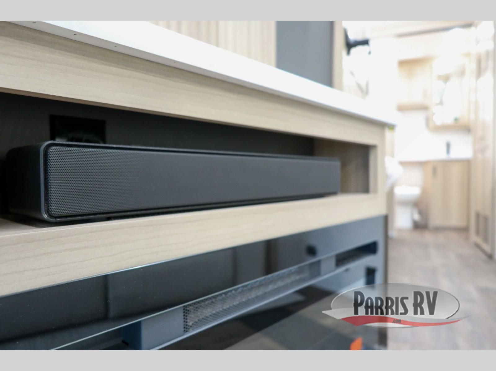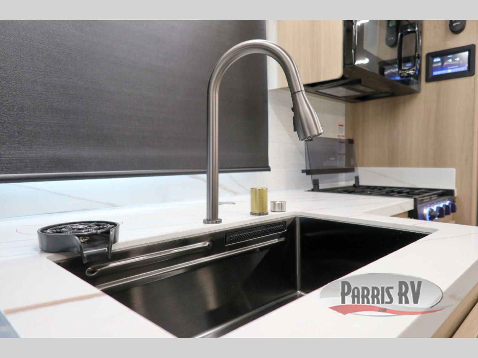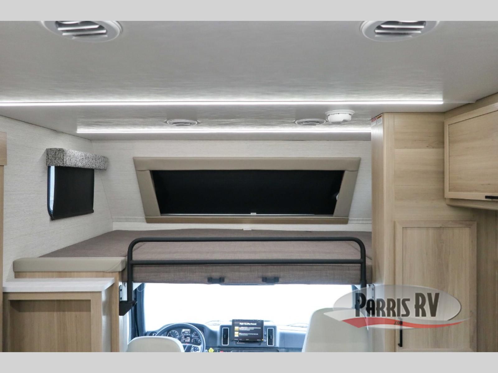 At the front, you're welcomed into the cockpit area with an overhead bunk that adds sleeping space without sacrificing comfort. The spacious living area features a large slideout that houses a tri-fold sleeper sofa, giving you both a cozy place to relax and accommodations for guests. Next to it, the Dream Dinette is perfect for enjoying meals, playing board games, or simply spending quality time together. The slideout also includes a pantry, offering storage for dry goods, while across from it the kitchen features an L-shaped solid surface countertops, a gunmetal steel sink, a sealed glass range with glass cover, and a 15-cu. ft. refrigerator to easily handle all your grocery needs. Multiple TVs, one in the kitchen area and another across from the sofa, make movie nights effortless. A convenient half bath is located mid-coach, while the rear of the motorhome is dedicated to a private bedroom featuring a king bed slideout, nightstands on both sides, dual wardrobes, a dresser, and a centrally located 32" TV. At the very back, the full bathroom completes the layout with a medicine cabinet and an additional wardrobe, delivering comfort, functionality, and abundant storage throughout the coach.