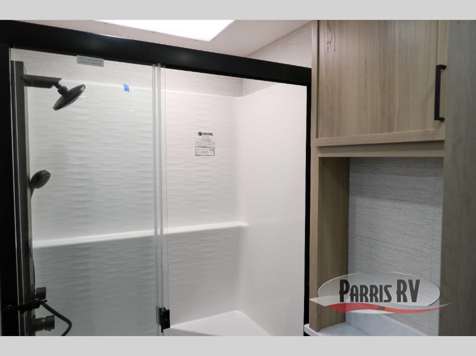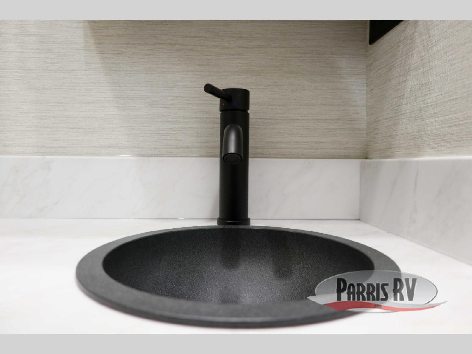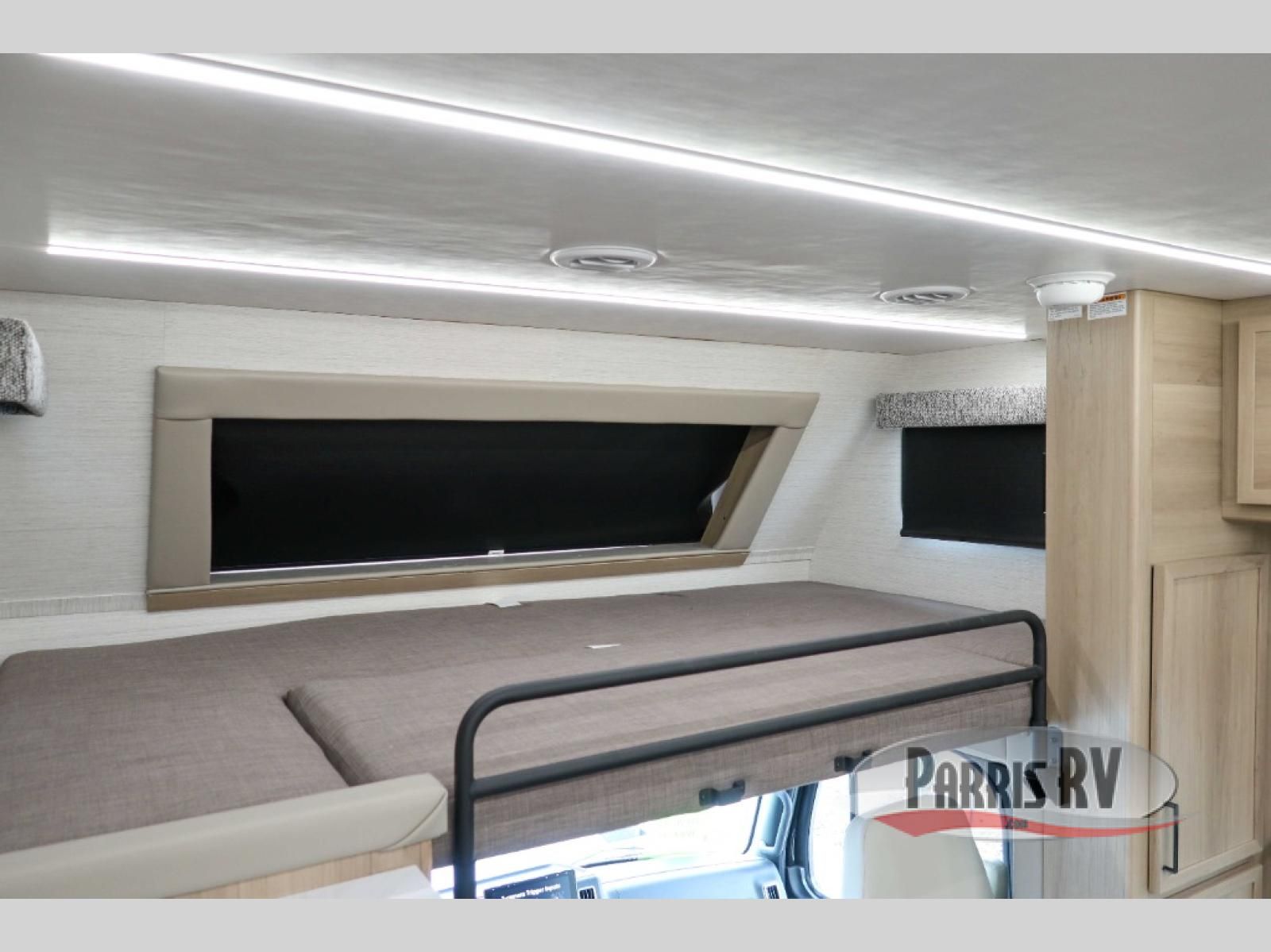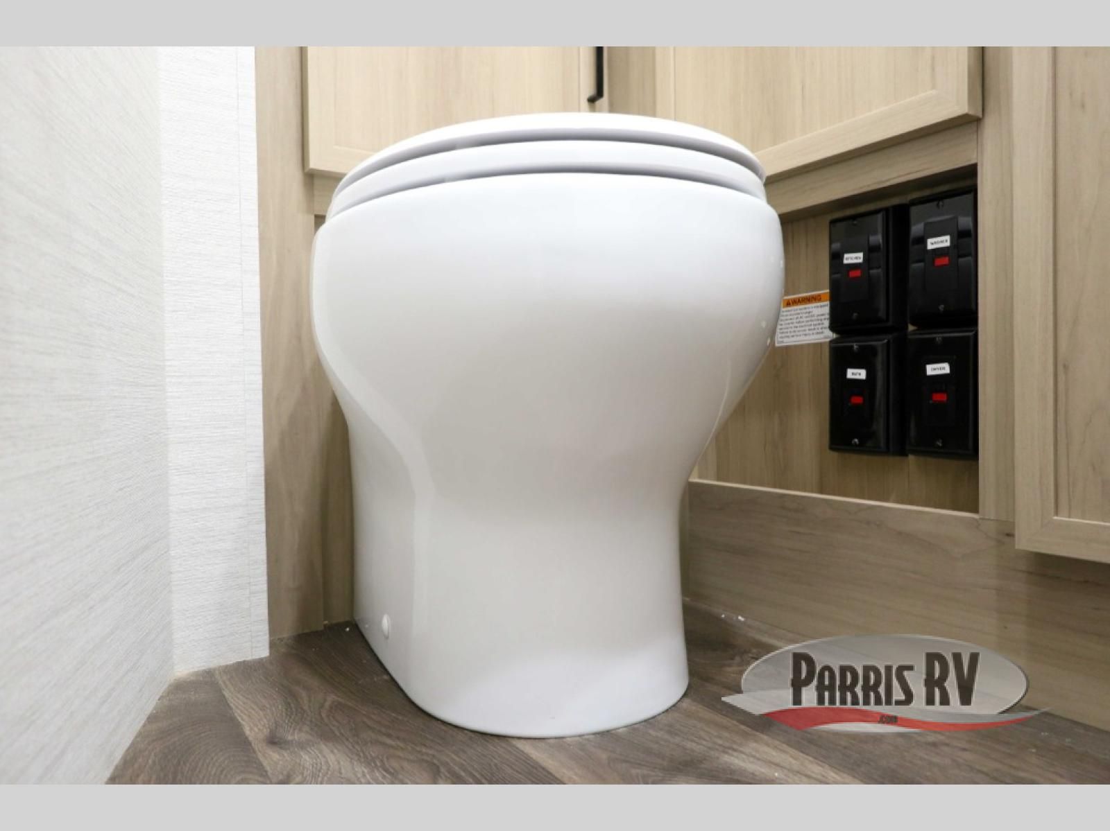 At the front, you're welcomed into the cockpit area with an overhead bunk that adds sleeping space without sacrificing comfort. The spacious living area features a large slideout that houses a tri-fold sleeper sofa, giving you both a cozy place to relax and accommodations for guests. Next to it, the Dream Dinette is perfect for enjoying meals, playing board games, or simply spending quality time together. The slideout also includes a pantry, offering storage for dry goods, while across from it the kitchen features an L-shaped solid surface countertops, a gunmetal steel sink, a sealed glass range with glass cover, and a 15-cu. ft. refrigerator to easily handle all your grocery needs. Multiple TVs, one in the kitchen area and another across from the sofa, make movie nights effortless. A convenient half bath is located mid-coach, while the rear of the motorhome is dedicated to a private bedroom featuring a king bed slideout, nightstands on both sides, dual wardrobes, a dresser, and a centrally located 32" TV. At the very back, the full bathroom completes the layout with a medicine cabinet and an additional wardrobe, delivering comfort, functionality, and abundant storage throughout the coach.