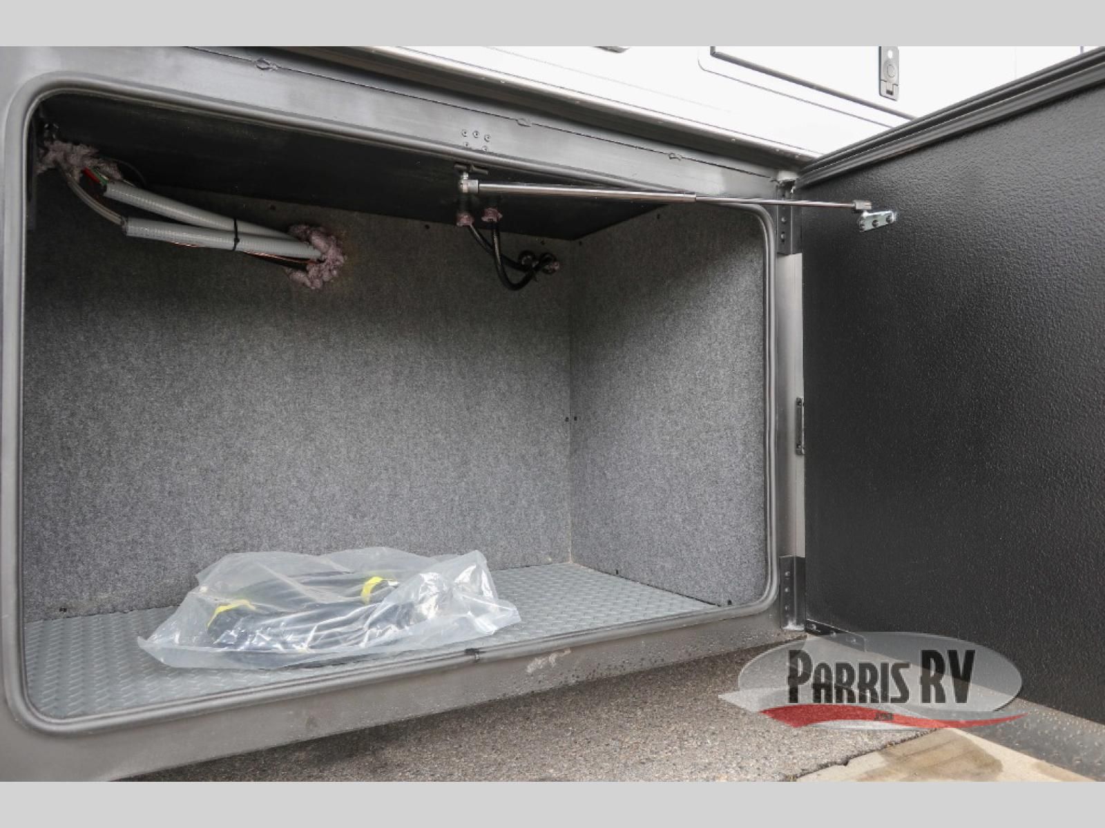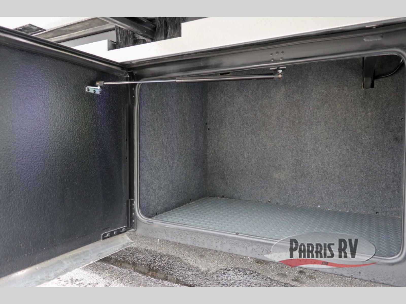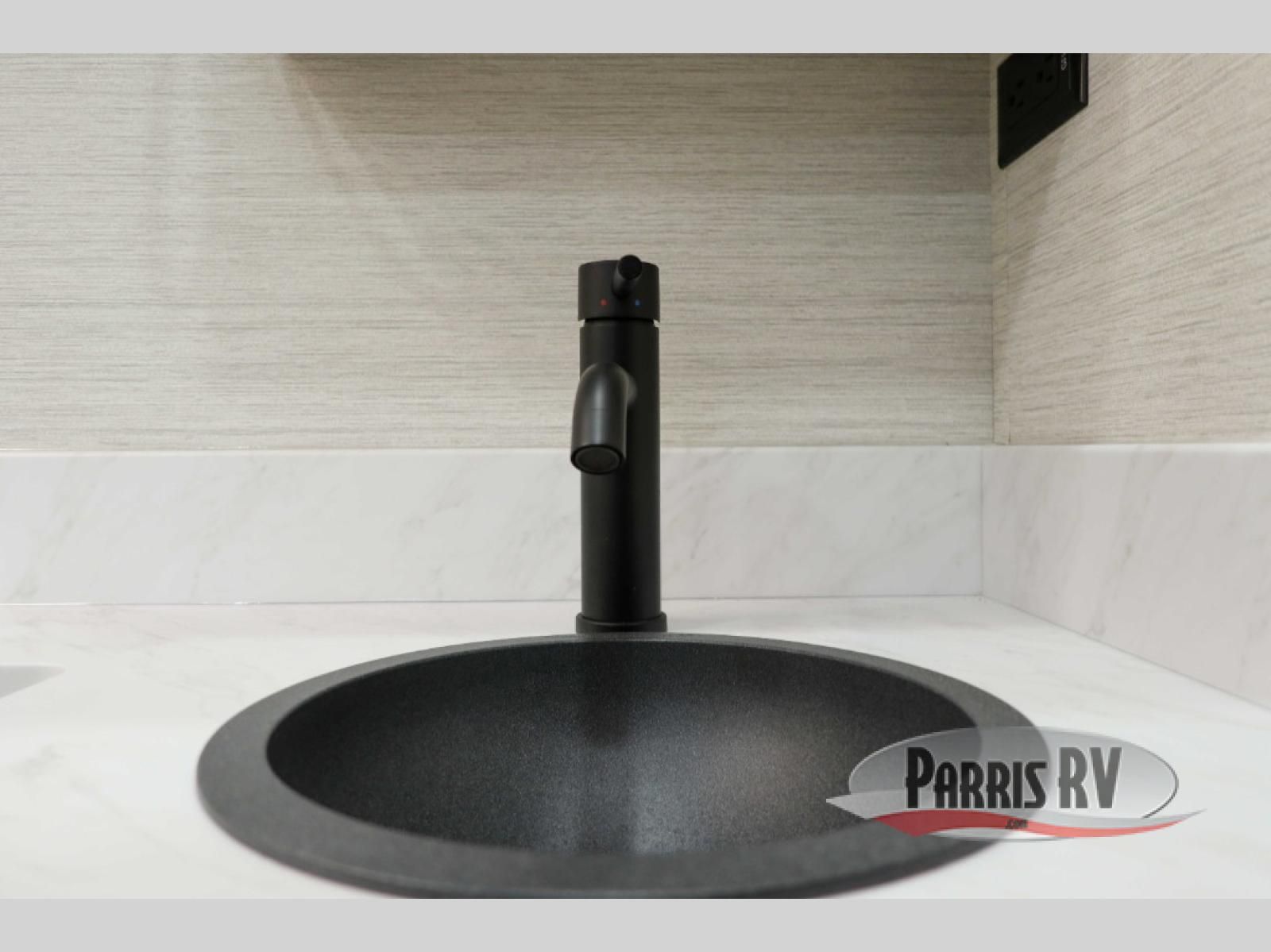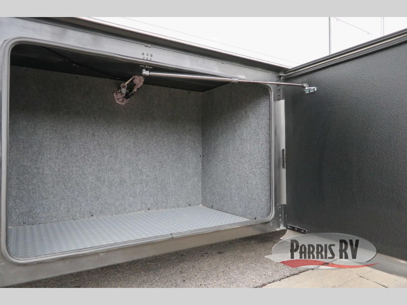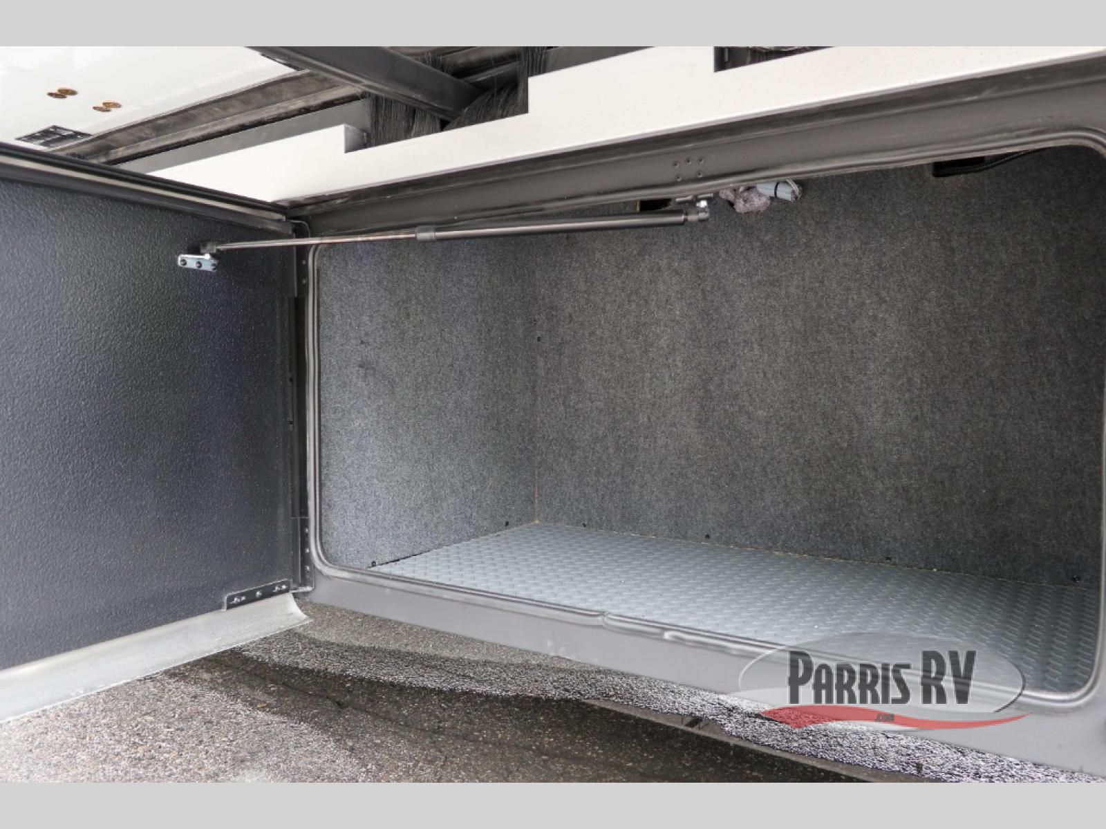 At the front, you're welcomed into the cockpit area with an overhead bunk that adds sleeping space without sacrificing comfort. The spacious living area features a large slideout that houses a tri-fold sleeper sofa, giving you both a cozy place to relax and accommodations for guests. Next to it, the Dream Dinette is perfect for enjoying meals, playing board games, or simply spending quality time together. The slideout also includes a pantry, offering storage for dry goods, while across from it the kitchen features an L-shaped solid surface countertops, a gunmetal steel sink, a sealed glass range with glass cover, and a 15-cu. ft. refrigerator to easily handle all your grocery needs. Multiple TVs, one in the kitchen area and another across from the sofa, make movie nights effortless. A convenient half bath is located mid-coach, while the rear of the motorhome is dedicated to a private bedroom featuring a king bed slideout, nightstands on both sides, dual wardrobes, a dresser, and a centrally located 32" TV. At the very back, the full bathroom completes the layout with a medicine cabinet and an additional wardrobe, delivering comfort, functionality, and abundant storage throughout the coach.