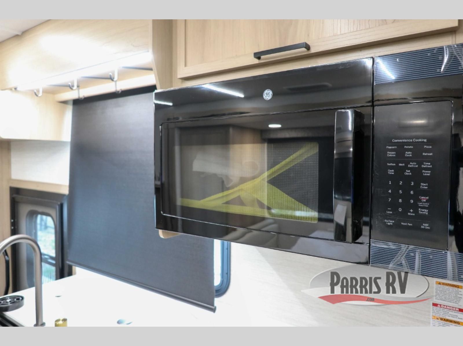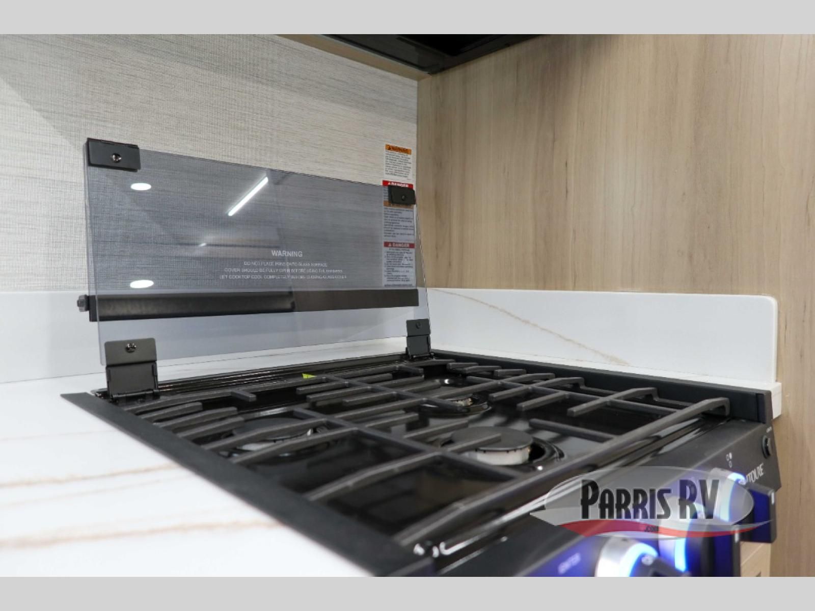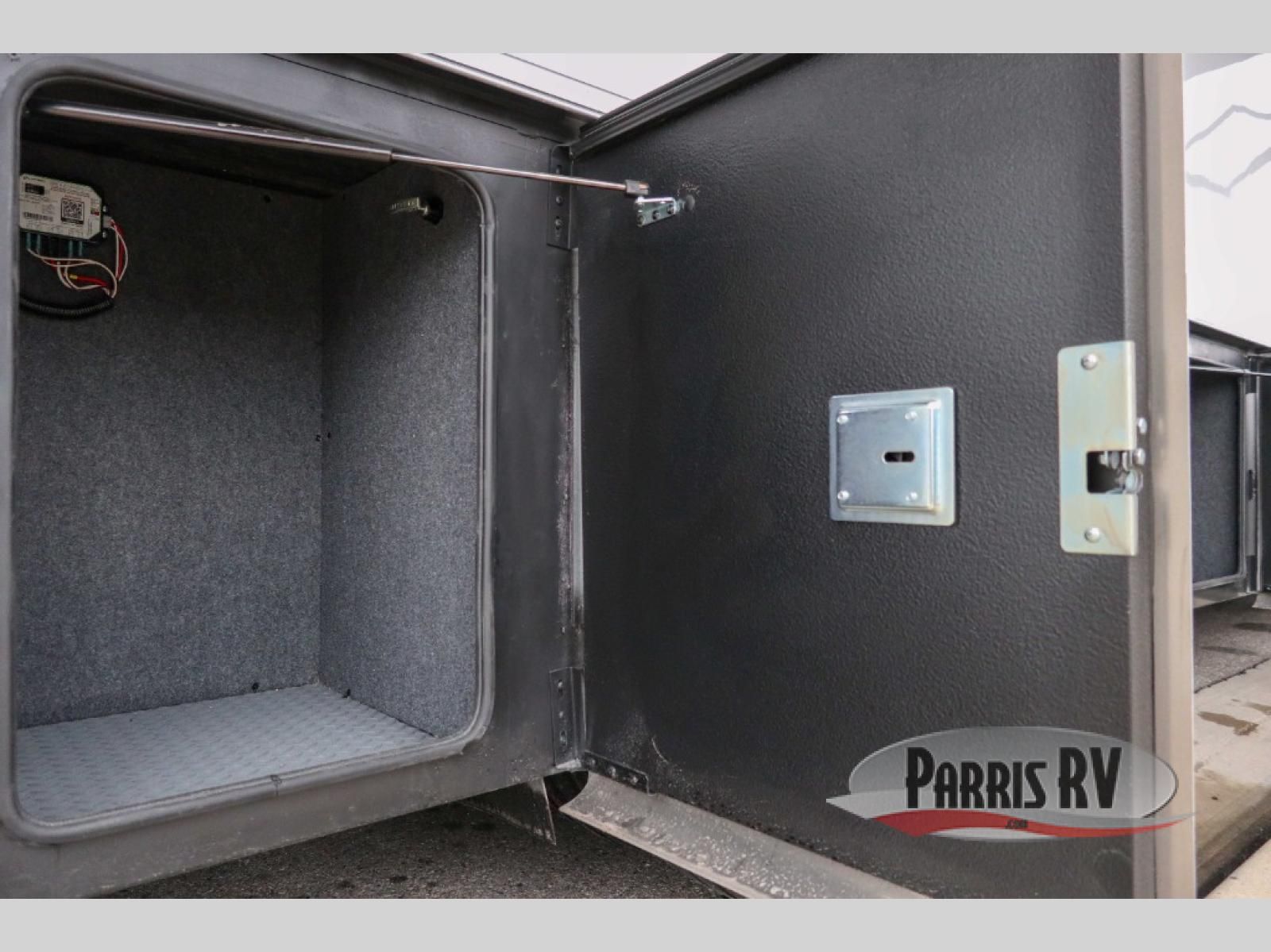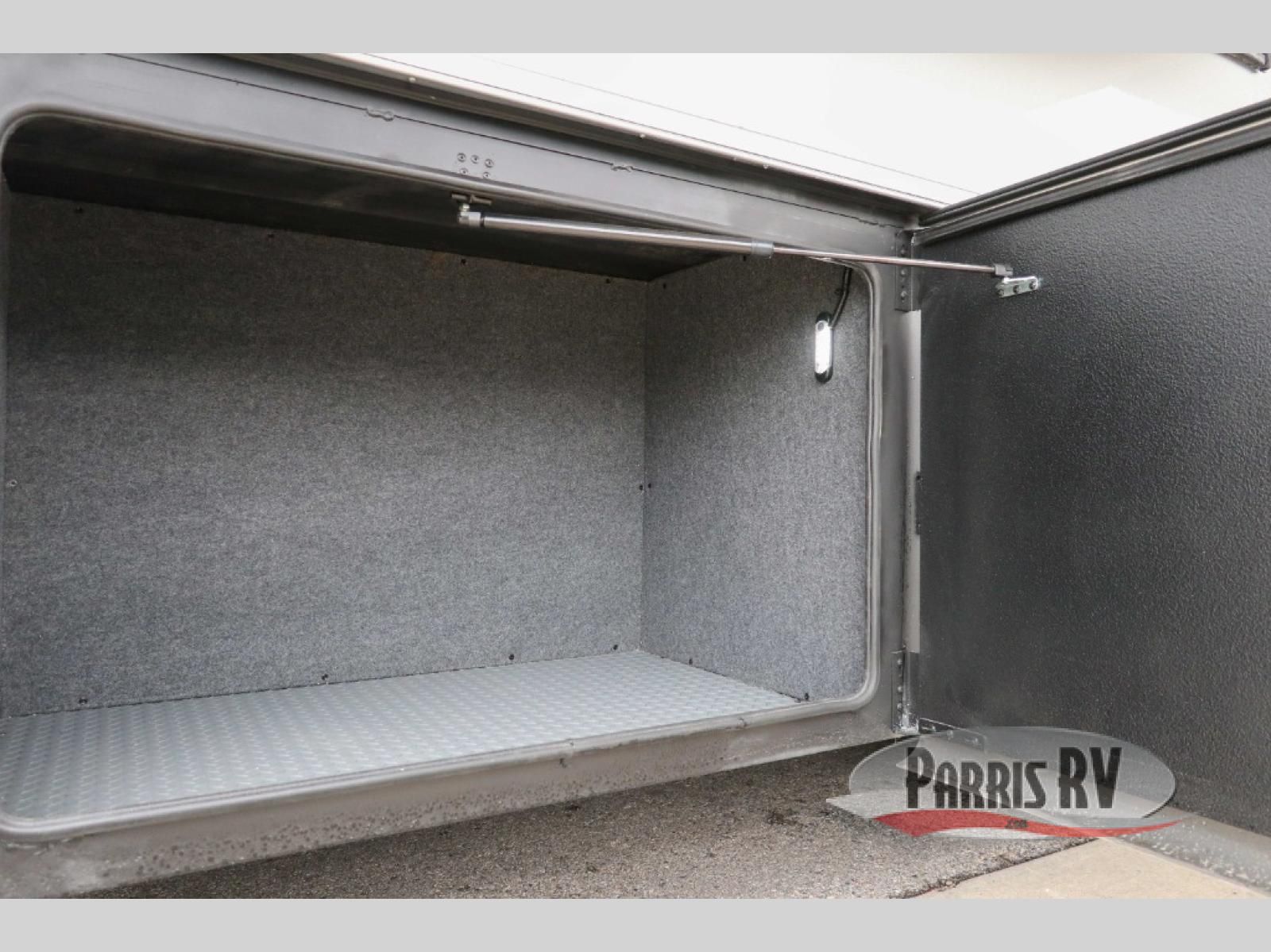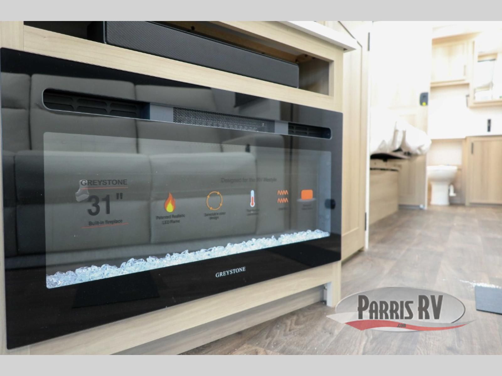 At the front, you're welcomed into the cockpit area with an overhead bunk that adds sleeping space without sacrificing comfort. The spacious living area features a large slideout that houses a tri-fold sleeper sofa, giving you both a cozy place to relax and accommodations for guests. Next to it, the Dream Dinette is perfect for enjoying meals, playing board games, or simply spending quality time together. The slideout also includes a pantry, offering storage for dry goods, while across from it the kitchen features an L-shaped solid surface countertops, a gunmetal steel sink, a sealed glass range with glass cover, and a 15-cu. ft. refrigerator to easily handle all your grocery needs. Multiple TVs, one in the kitchen area and another across from the sofa, make movie nights effortless. A convenient half bath is located mid-coach, while the rear of the motorhome is dedicated to a private bedroom featuring a king bed slideout, nightstands on both sides, dual wardrobes, a dresser, and a centrally located 32" TV. At the very back, the full bathroom completes the layout with a medicine cabinet and an additional wardrobe, delivering comfort, functionality, and abundant storage throughout the coach.