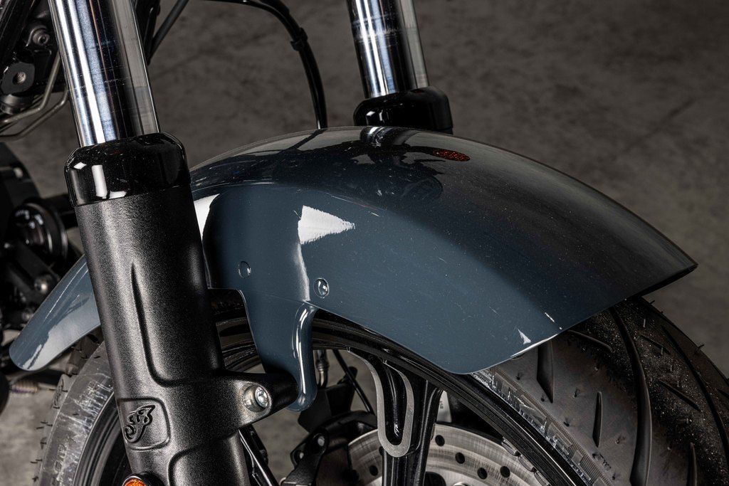 Loaded with attitude and blacked-out premium gloss black finishes with bobbed fenders. A welded steel tube frame, large headlight bucket with nacelle, and covered forks and rear shocks give a nod to traditional bobber style and deliver a visually striking experience.