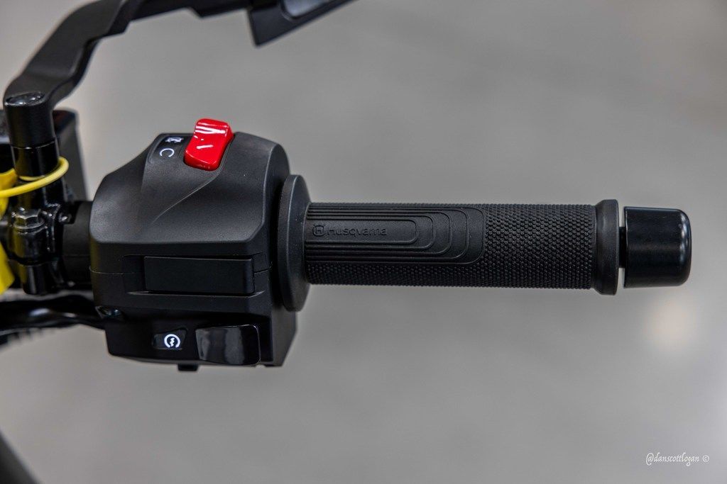 Clip-on handlebars attach to forged aluminium triple clamps, a central focal point to the Vitpilen 401. In keeping with the minimalistic look and authentic design, the control zone is not obstructed by any fairings and features a digital display unit with the necessary information.