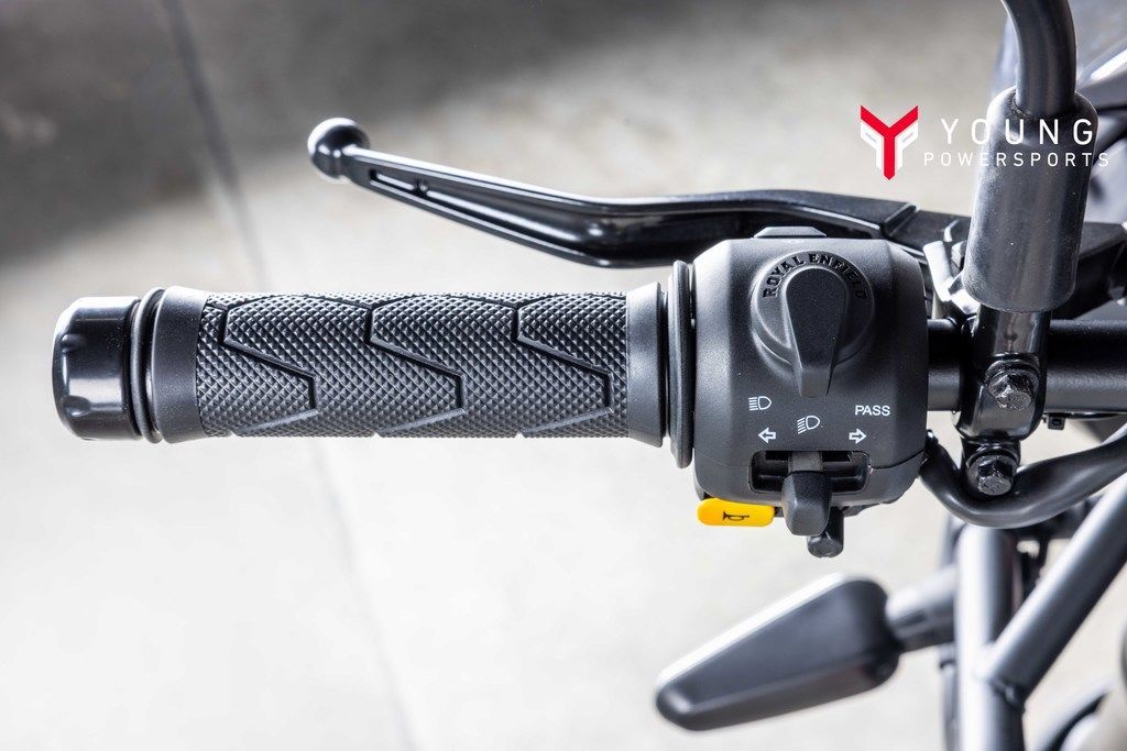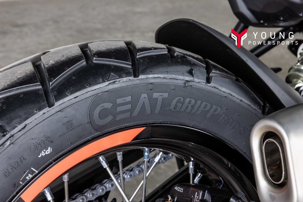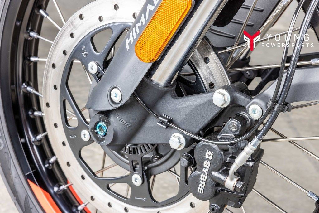 The steel twin-spar frame is stronger, stiffer and narrower between the legs for improved comfort while riding in a standing position. Better handling, better stability and better balance.