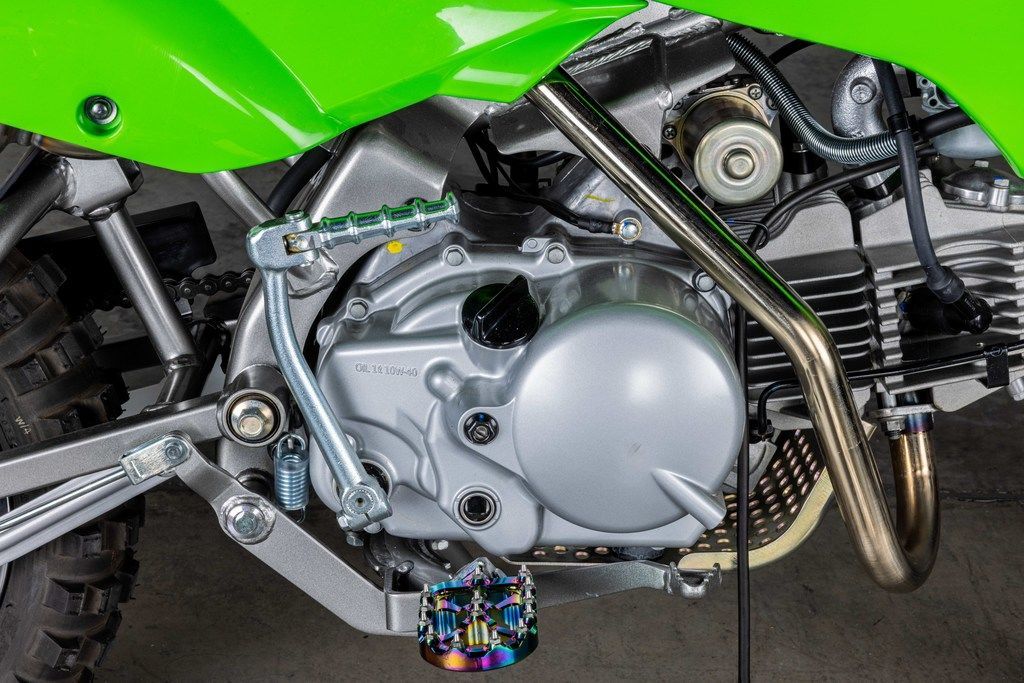 KLX®110R motorcycles are powered by a 112cc air-cooled 4-stroke engine. The KLX110R features a 4-speed transmission with automatic clutch while the KLX®110R L offers a manual clutch to learn big bike shifting techniques.