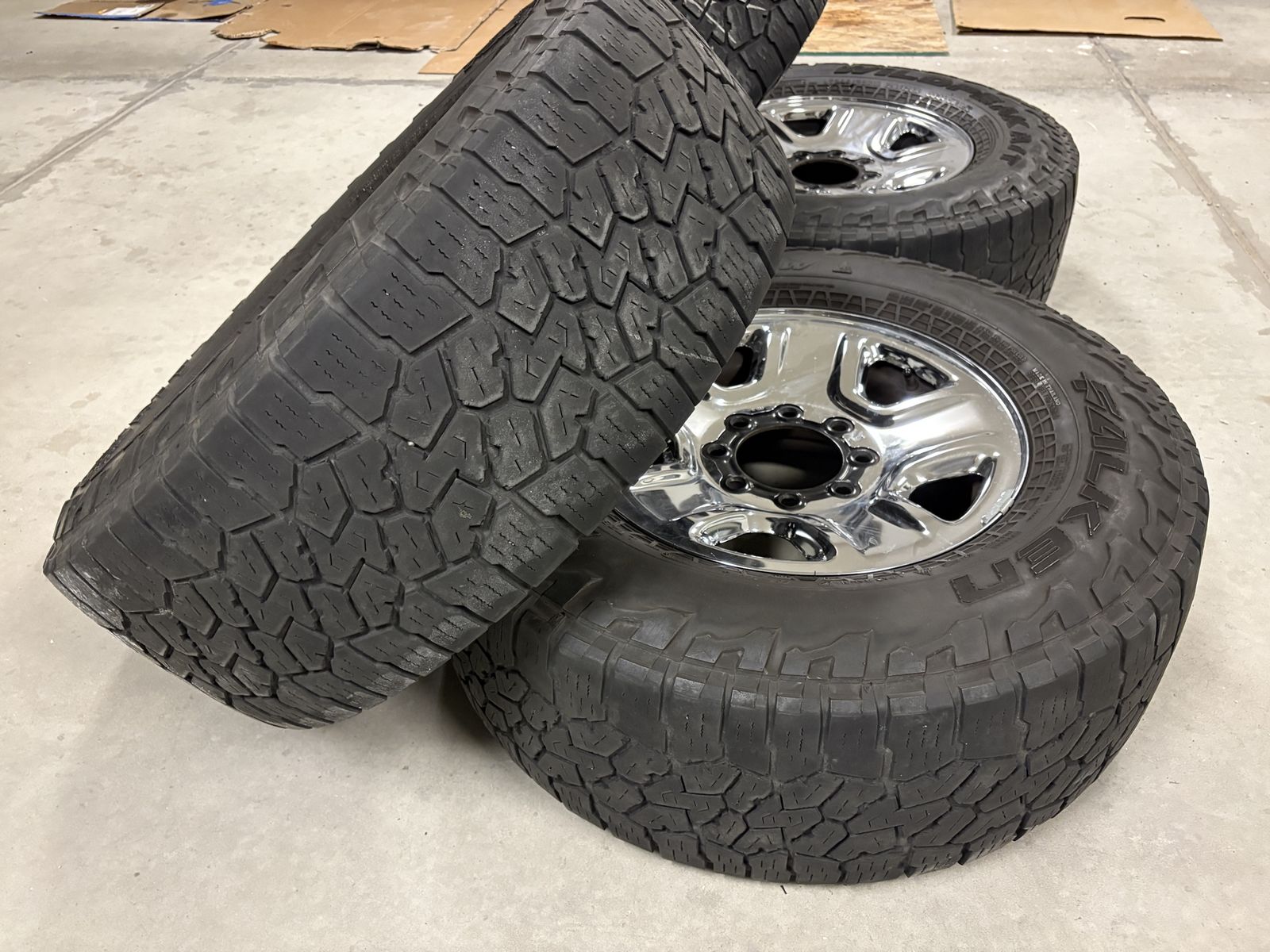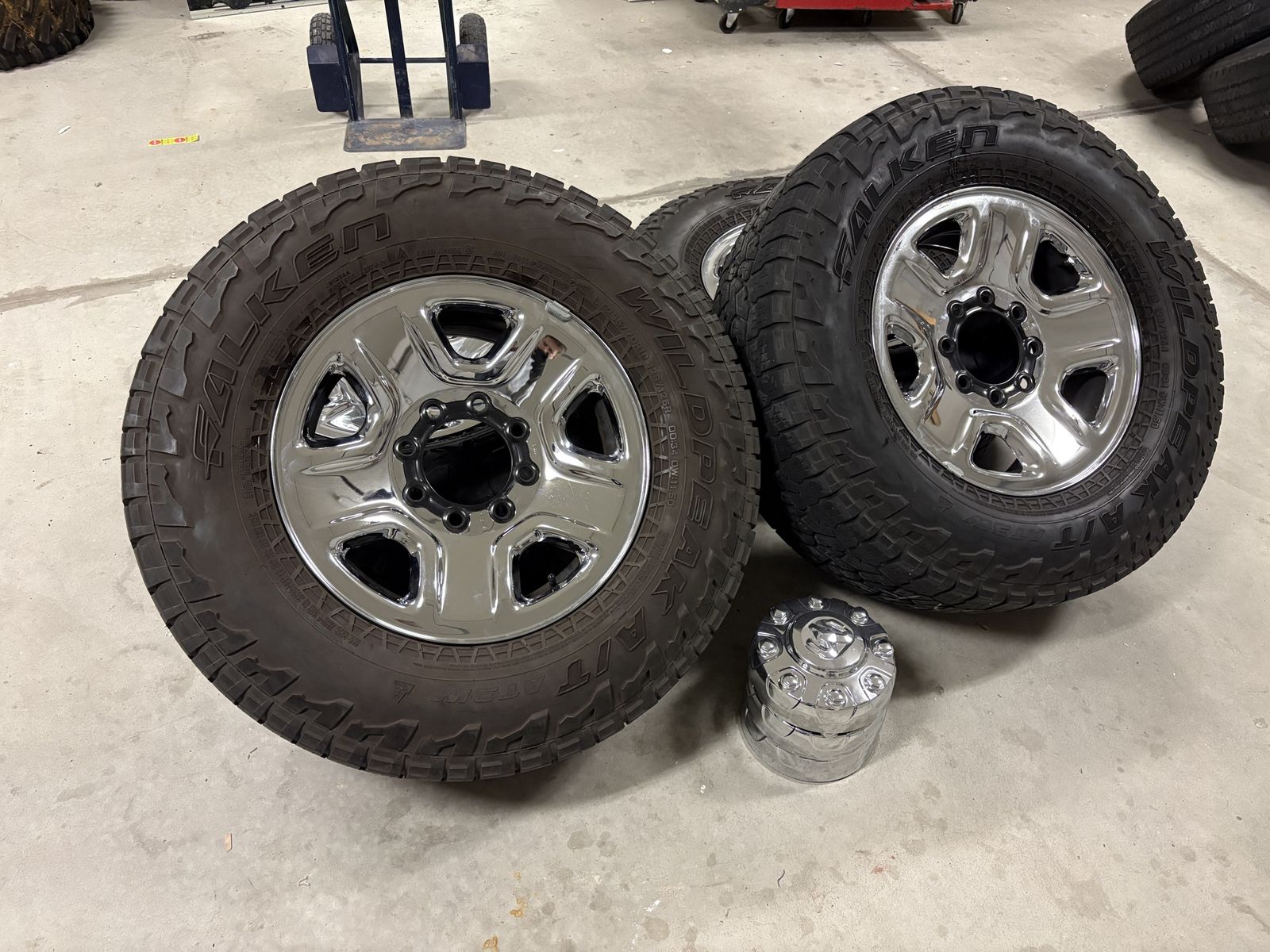 8x6.5 Ram 2500 wheels 295/70r18 Falken Wildpeak AT3W tires (34”) Good shape, tires are 30-40% tread and evenly worn. Center caps included, only have 3. Message if interested, thanks
