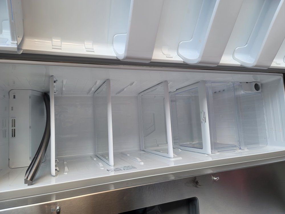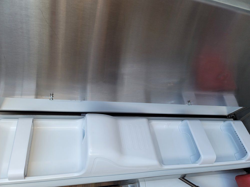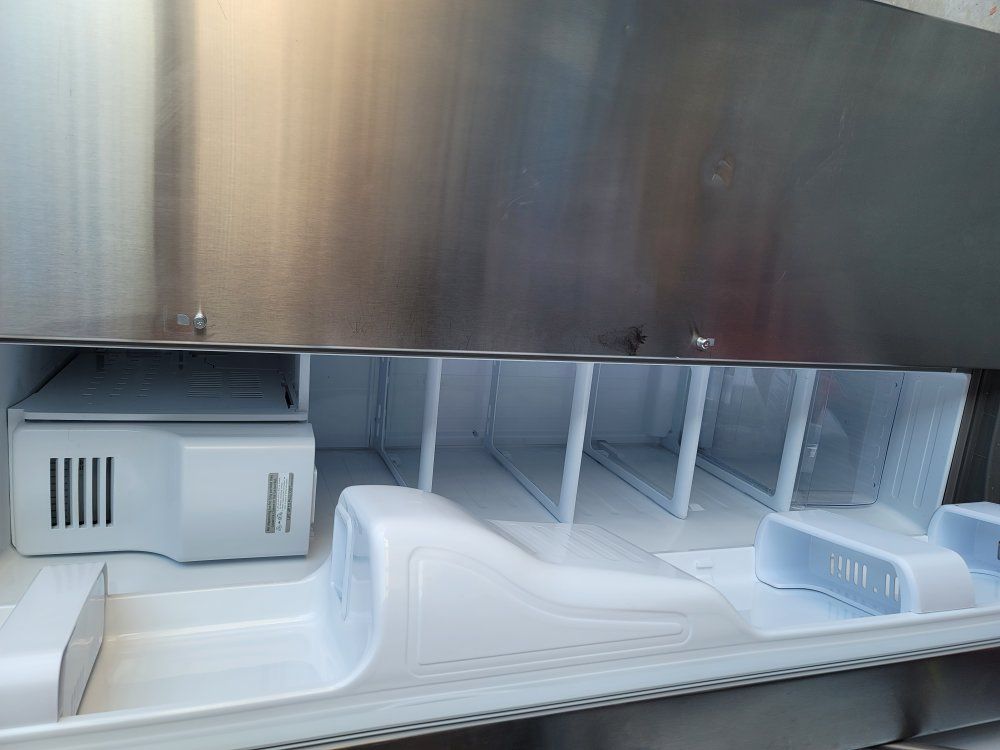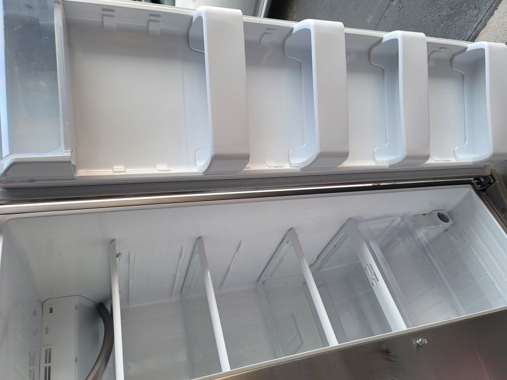 French doors only used a year, moved to a place that had a fridge so don't need it anymore. has a icemaker and all. love this fridge. has few dents and scratches from moving it.