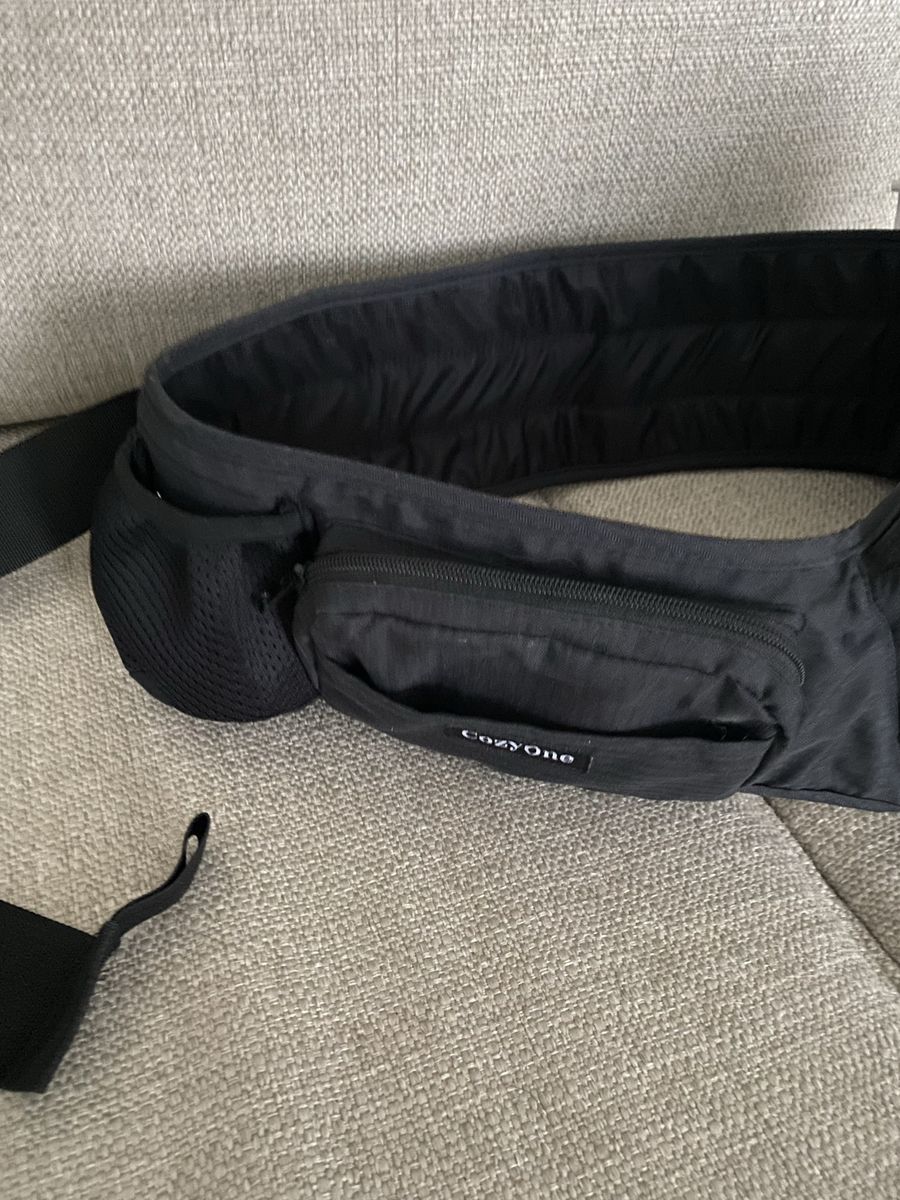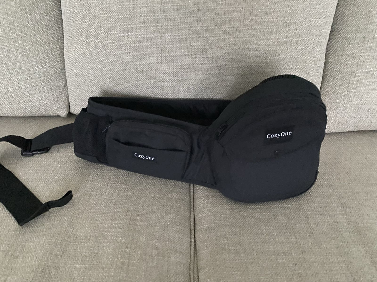 Black Cozy One Certified Bench Design Hip Seat Baby Carrier with Plenty Zipper Pockets. Like New Smoke Free Home Lightly Used at Grandparents House