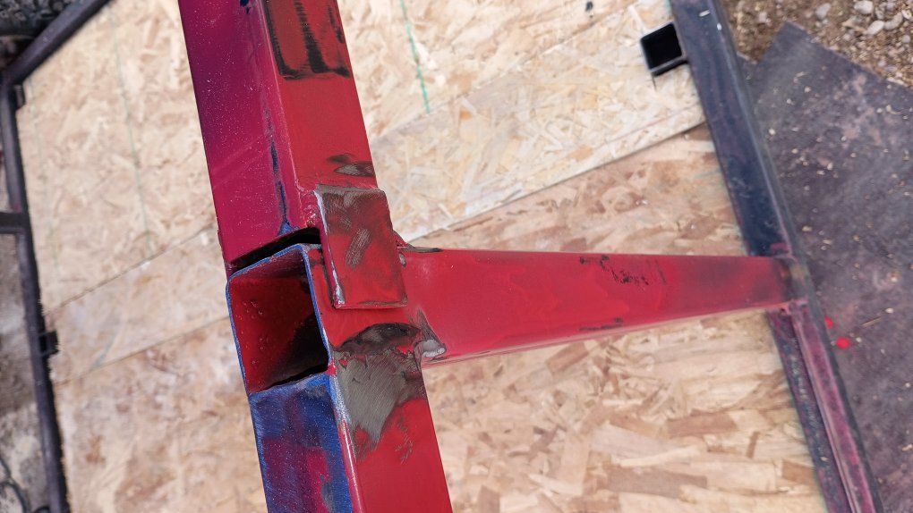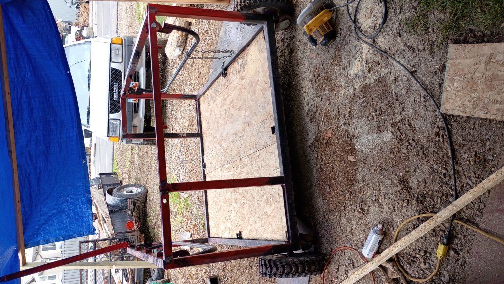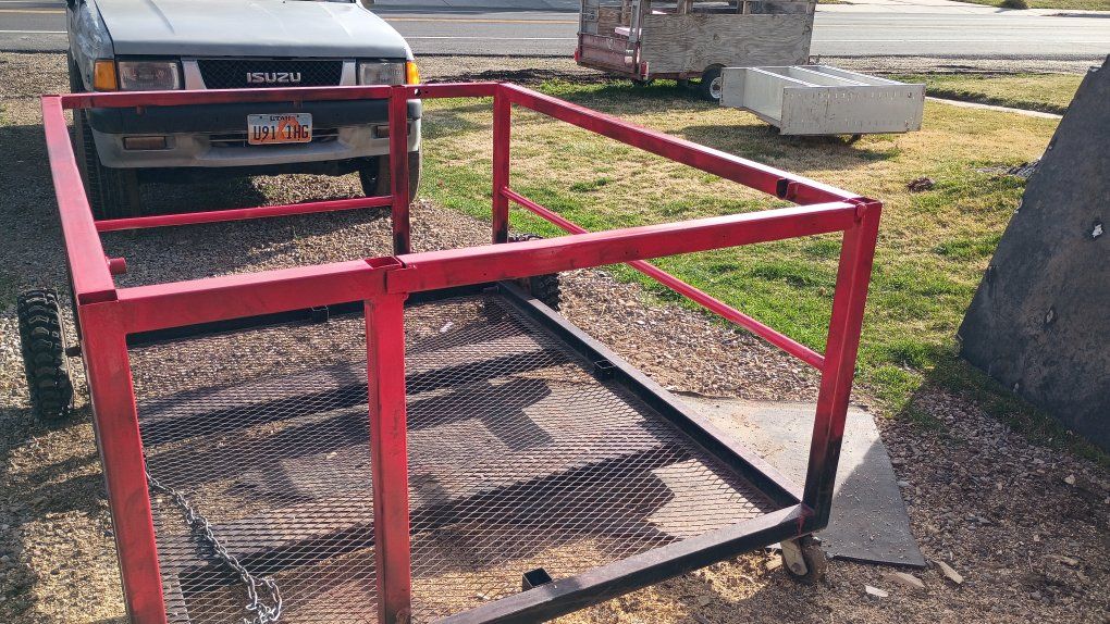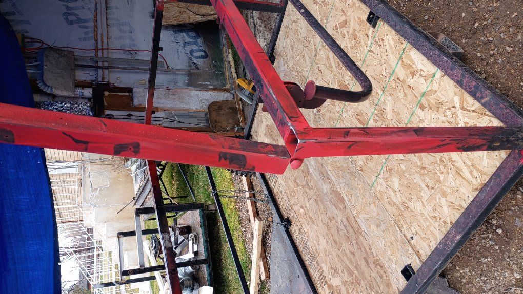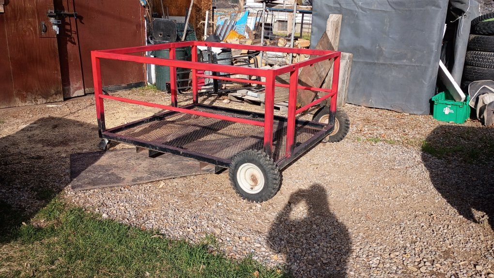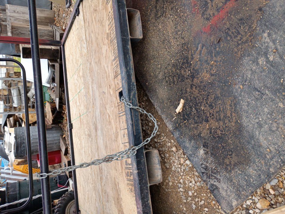 CashApphas a wiremesh bottom and a plywood floor that has been painted with crushed walnut shells for good traction the big tires are removable and it also has 4 casters that are welded on it's easier to move in gravel or dirt with the big back wheels the fork tubes span the full width and can be used from either side and the cage chain can be attached to either side