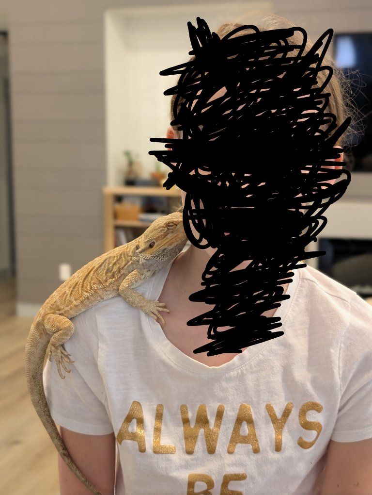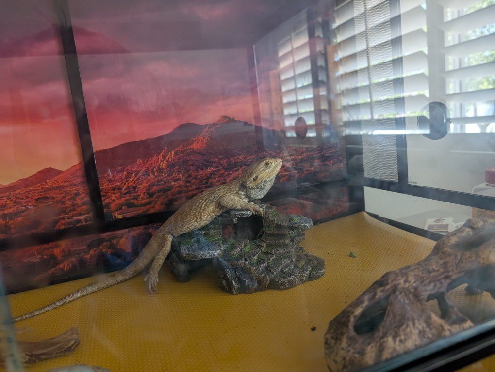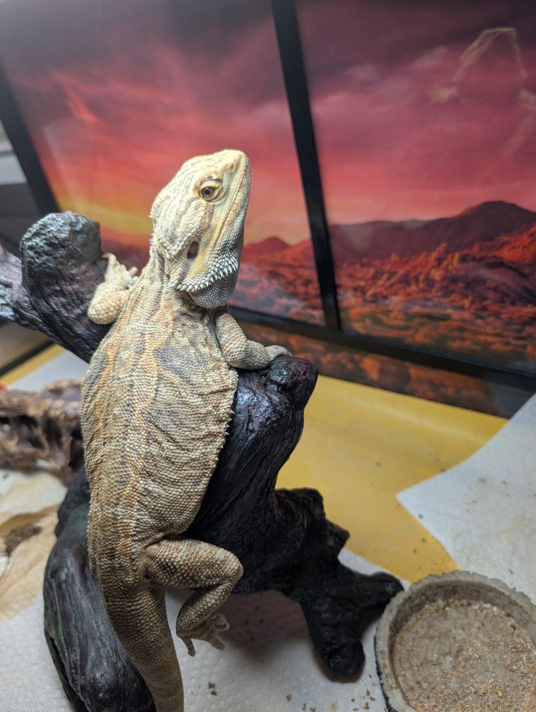 He likes his head being stroked, salad, hunting live crickets and roaches, long soaks in a shallow bath, and basking in the heat from his tree.