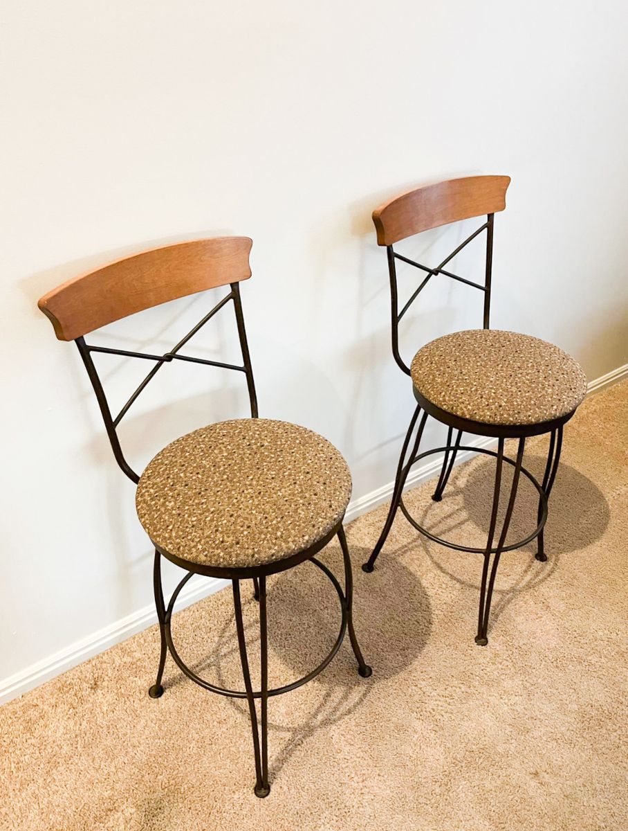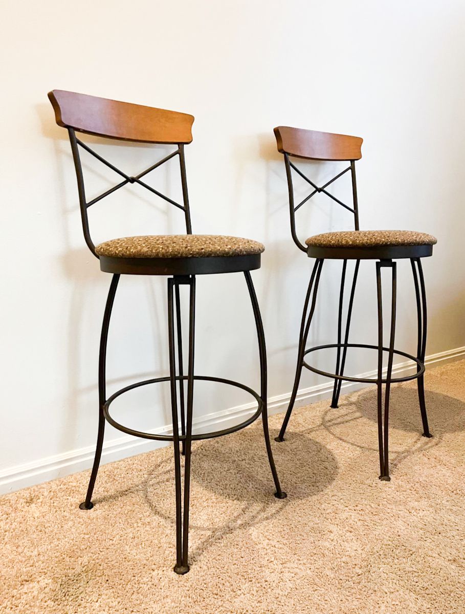 Key Features: • 30” seat height, perfect for standard counters. • fully welded heavy-duty steel frames • Swivel bases for easy mobility. • Fabric seats and hardwood backs. • new condition: no imperfections • originally retailed around $800 per pair.
