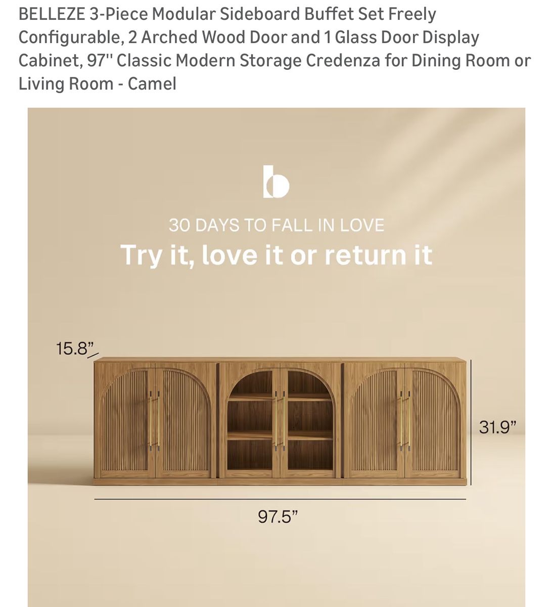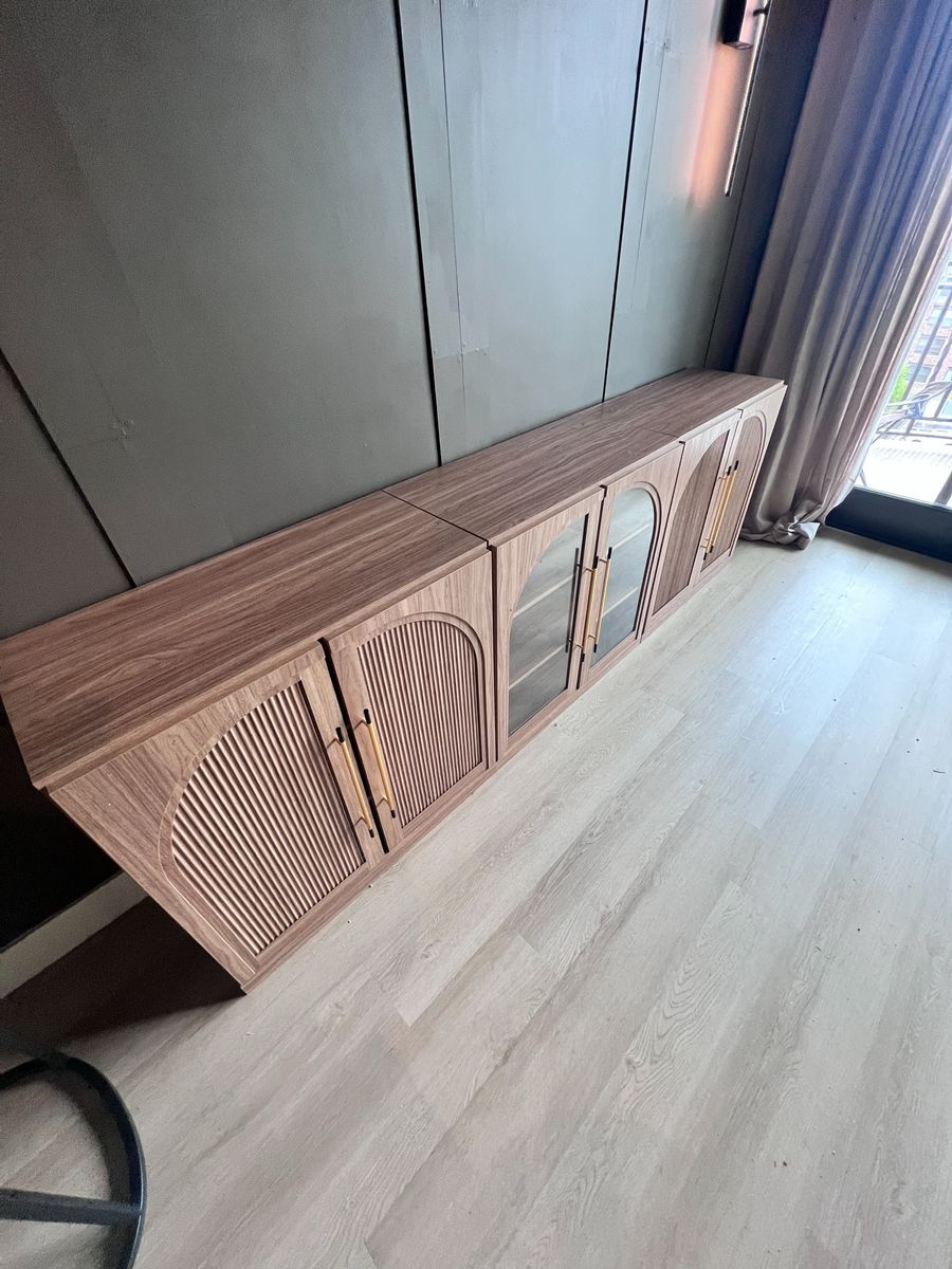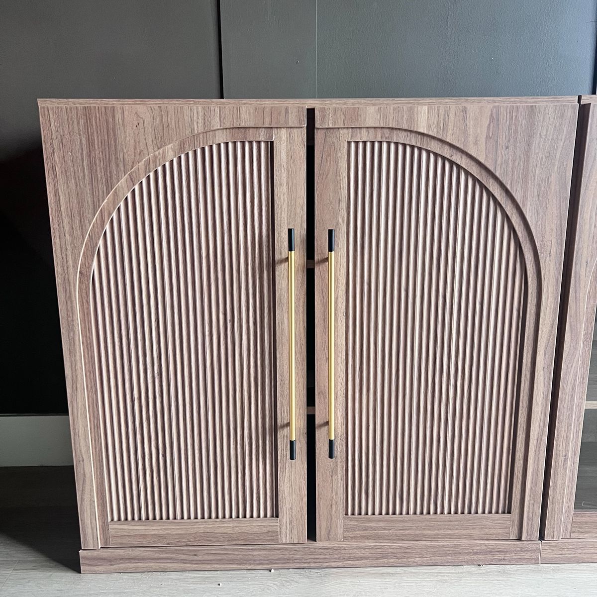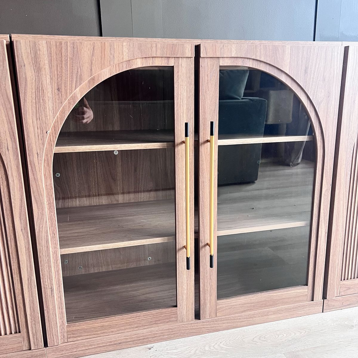 This is a beautiful, modern set with arched glass doors and warm wood tones. Super versatile layout, can be used together as a long statement piece or separated across a space.