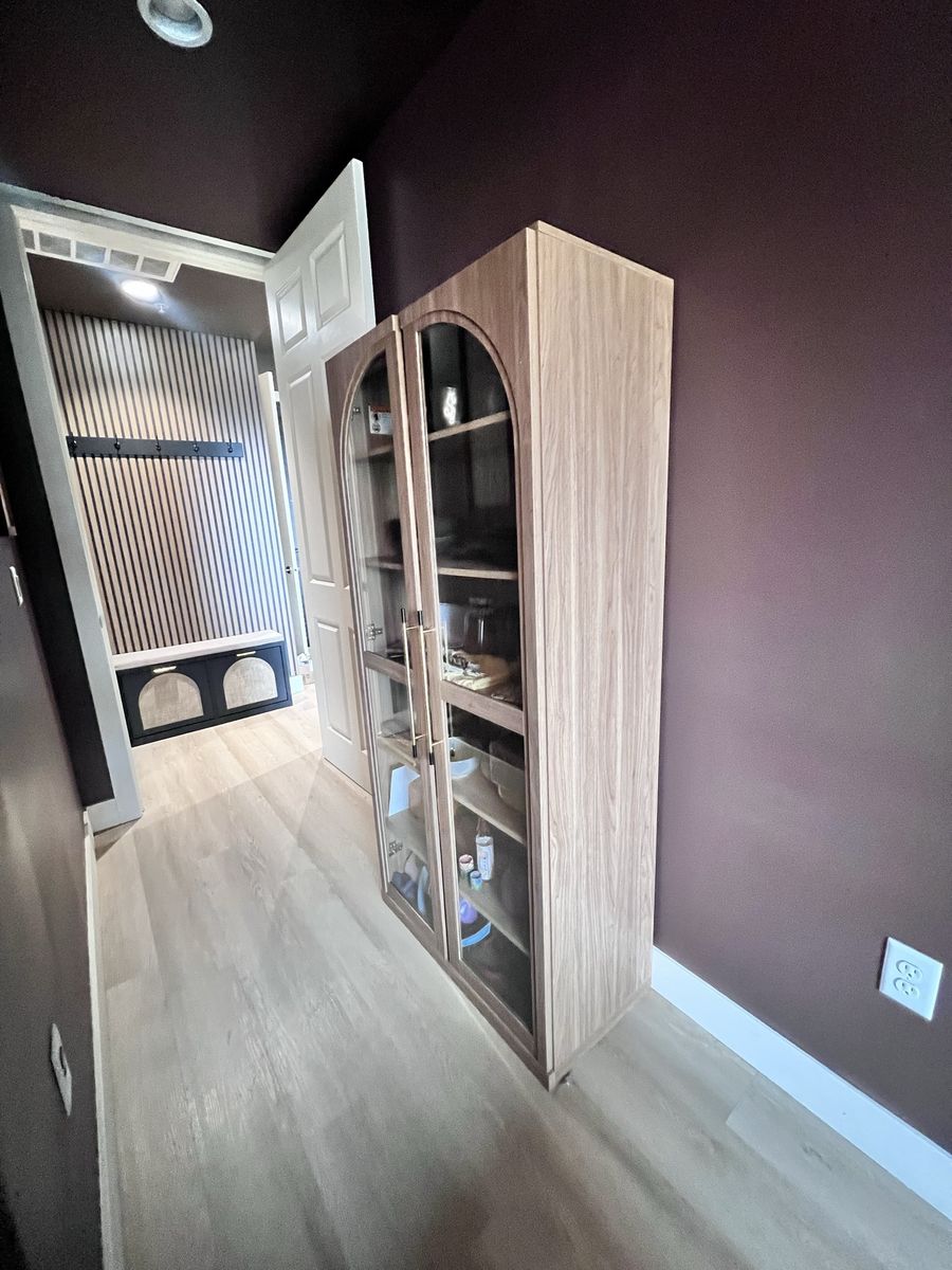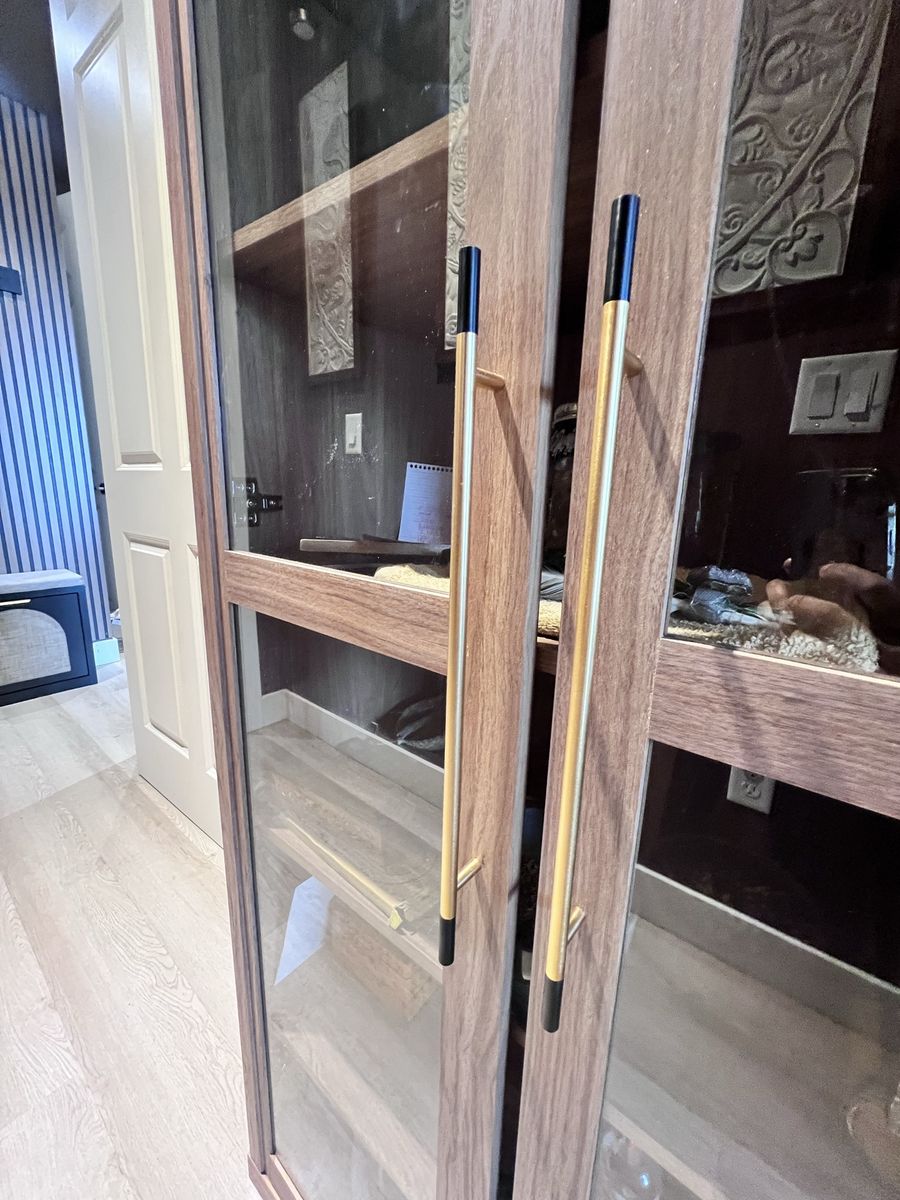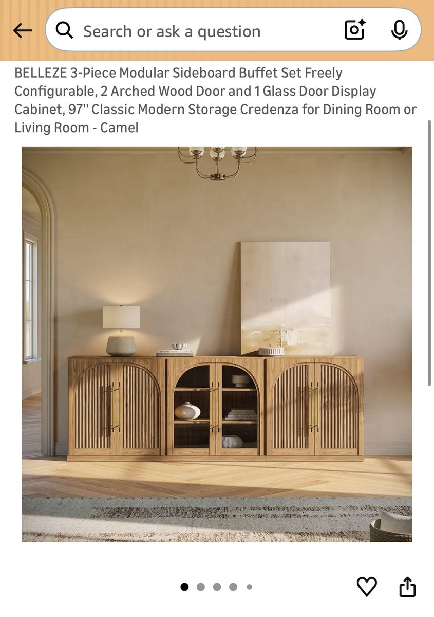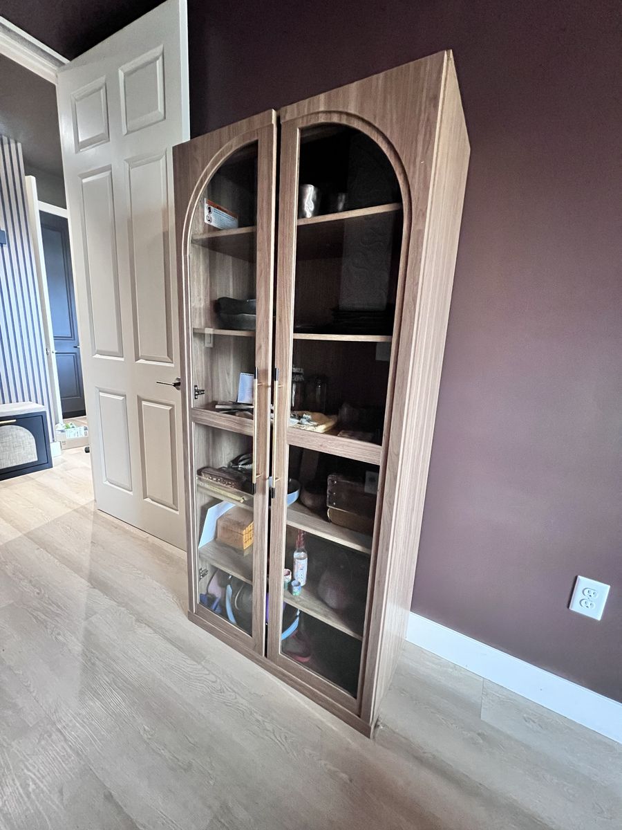 This is a beautiful, modern set with arched glass doors and warm wood tones. Super versatile layout, can be used together as a long statement piece or separated across a space.