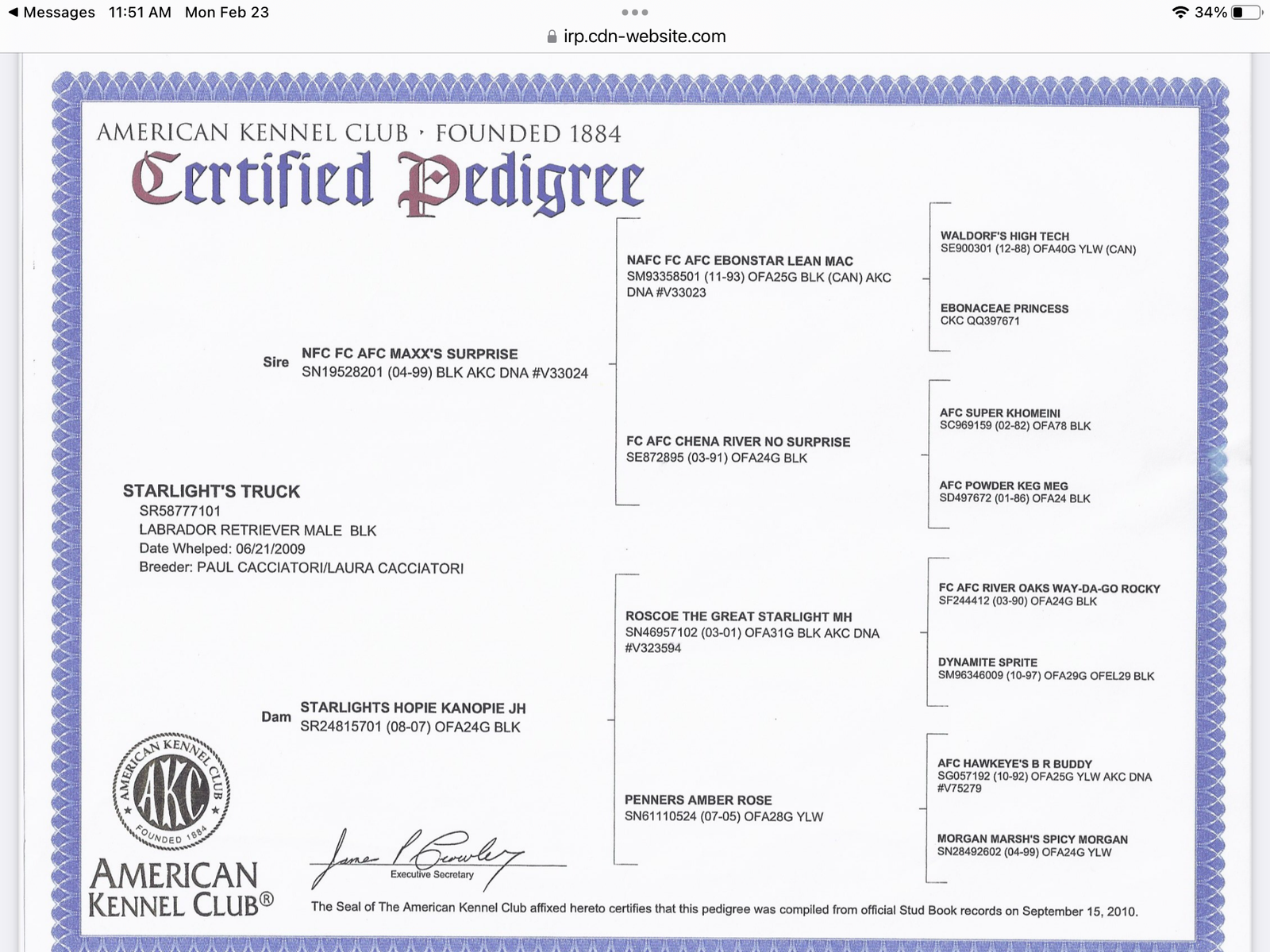 Trucks pedigree is nothing but remarkable with greats like 2xNAFC, 2xCNAFC, AFC, FC Lean Mac & NFC, FC, AFC Maxx’s Surprise his pedigree is filled with proven performances and power. Truck achieved 72 master passes and 2 national passes during his career. Truck was Paul Cacciatori’s personal hunting companion retrieving 1000’s & 1000’s of ducks and geese in his career.