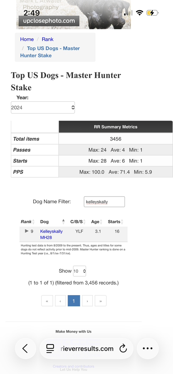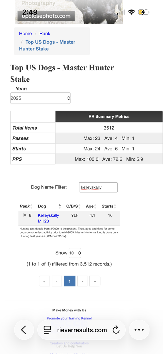 Kally also has proven performance in the agility ring, obedience ring and the rally ring with a total of 10 AKC titles (TNK, BN, RA, CGC, SHU MH) Along with securing her first national pass at the age of three years old. and 28 master pass by 3.5 years old. In 2025 Kally ran four quals and placed in three of the four with a reserve jam, a fourth place and a third place. In 2024 at 3 yrs old she was ranked 9th out of 3456 US dogs master hunter stake & in 2025 at 4 yrs old ranked 8th out of 3512 US dogs. Qualified in 2025 & 26 for MAN’s and 2024 & 25 for the MN’s.