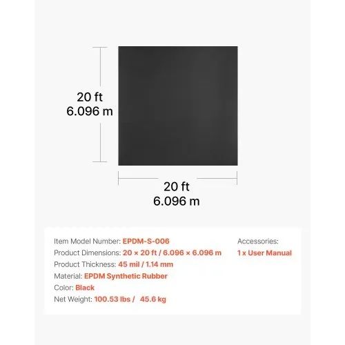 VEVOR Roll Roofing, 20 x 20 ft, 45 mil EPDM Rubber Roofing, Long Lifespan & Weather-resistant, Withstands Harsh Temperatures, Flexible & Easy Installation, Roof Underlayment for RVs, Roofs, Ponds.