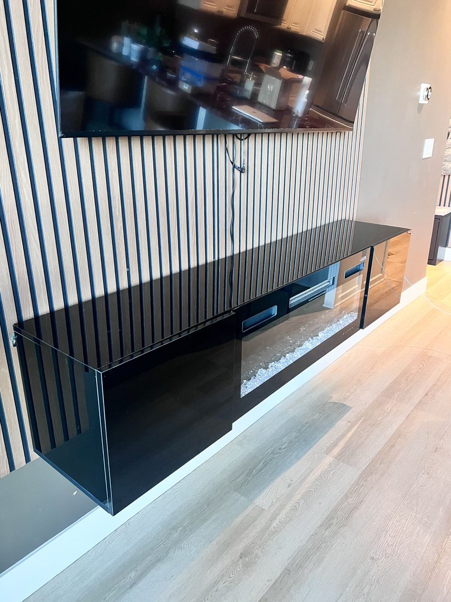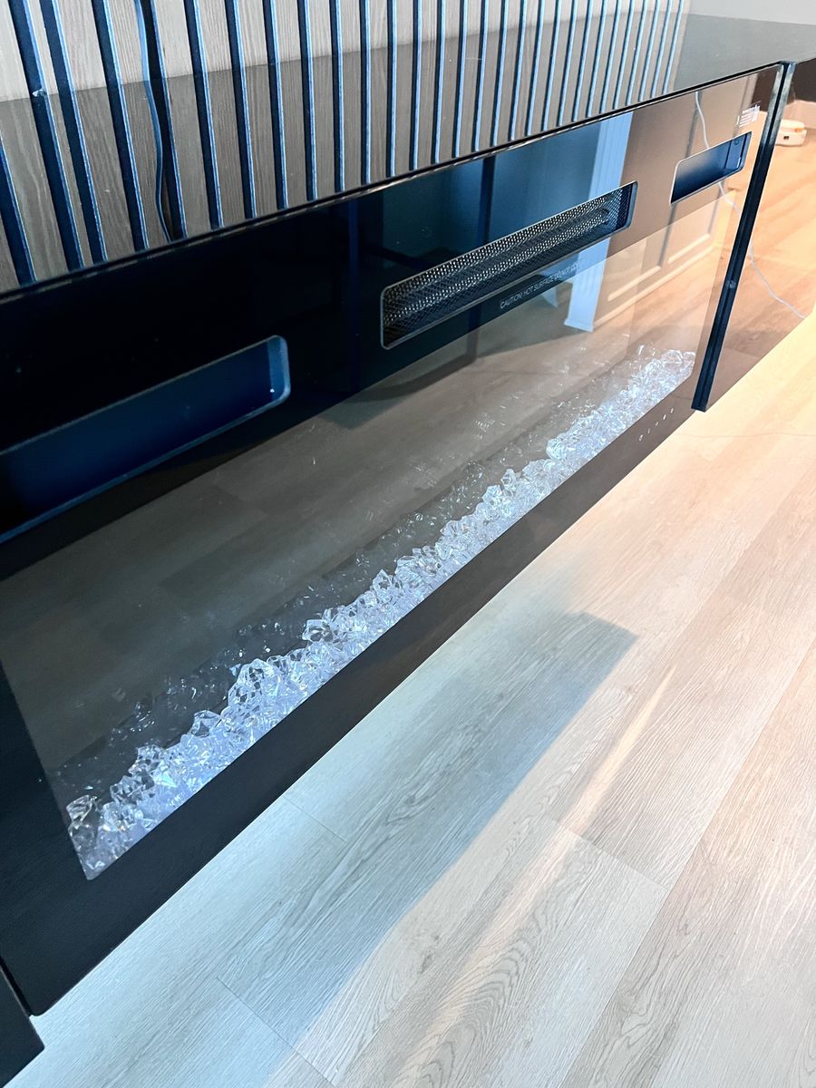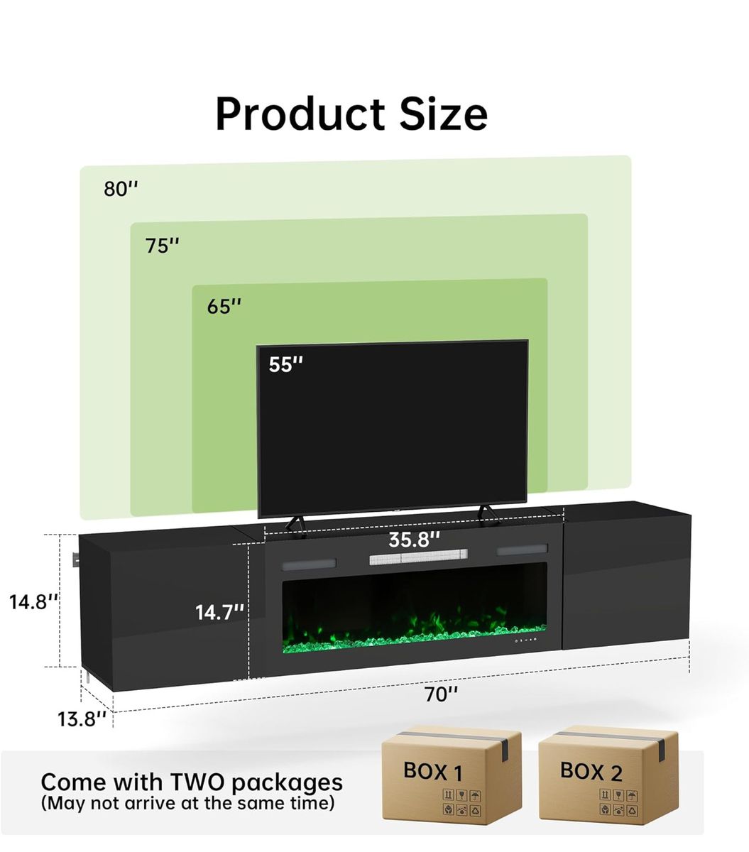 ApplePaySleek, modern floating TV stand with built-in electric fireplace, designed to instantly elevate your space.