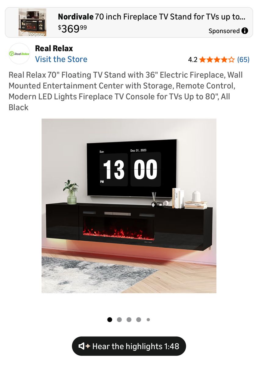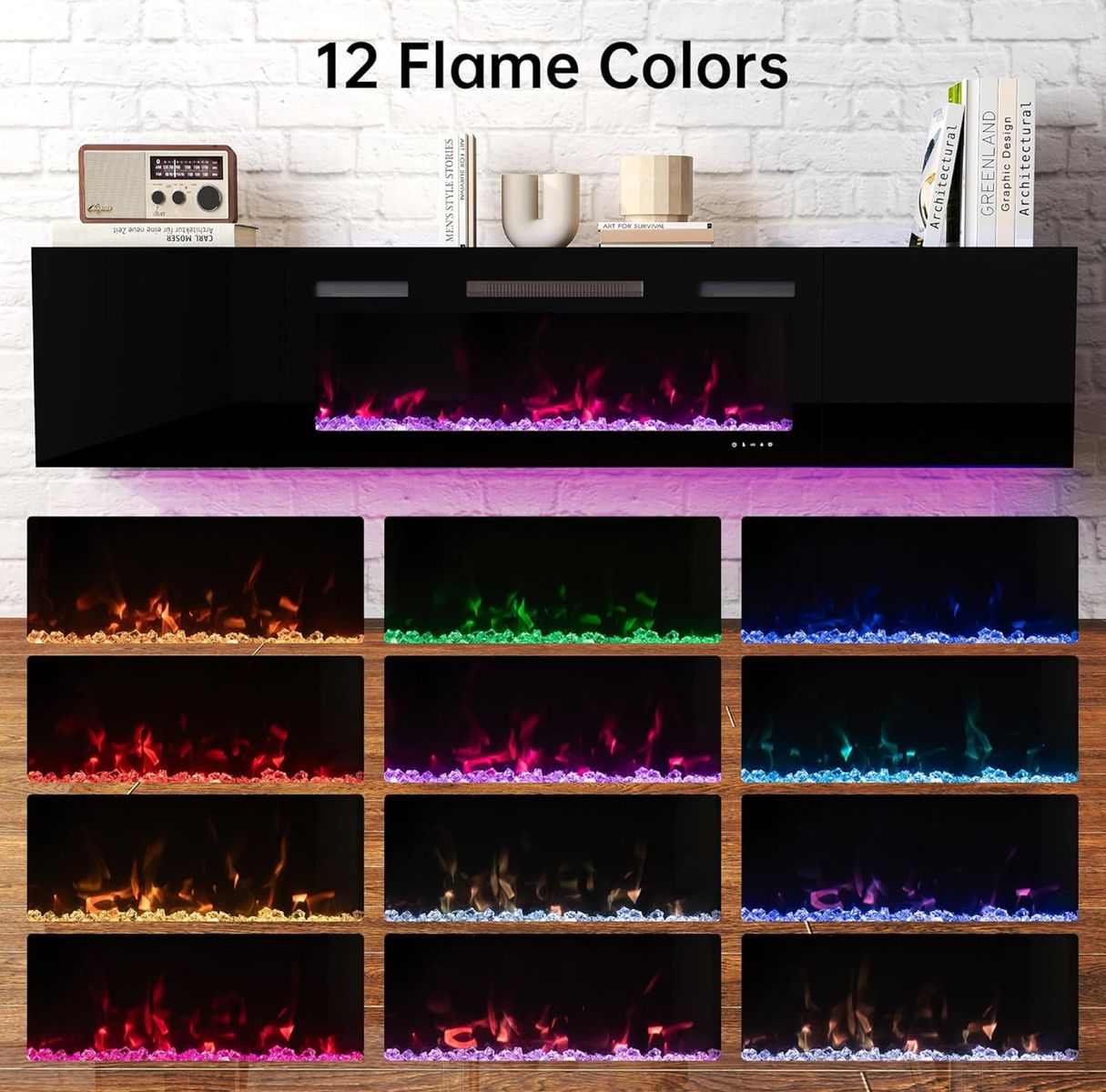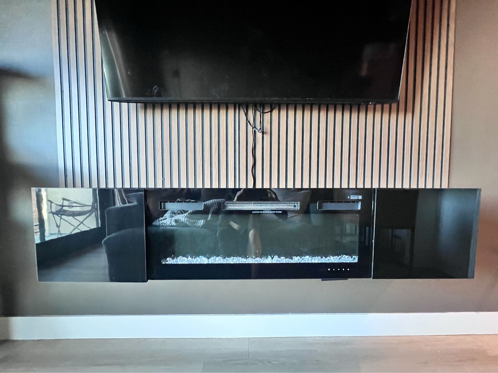 ApplePaySleek, modern floating TV stand with built-in electric fireplace, designed to instantly elevate your space.