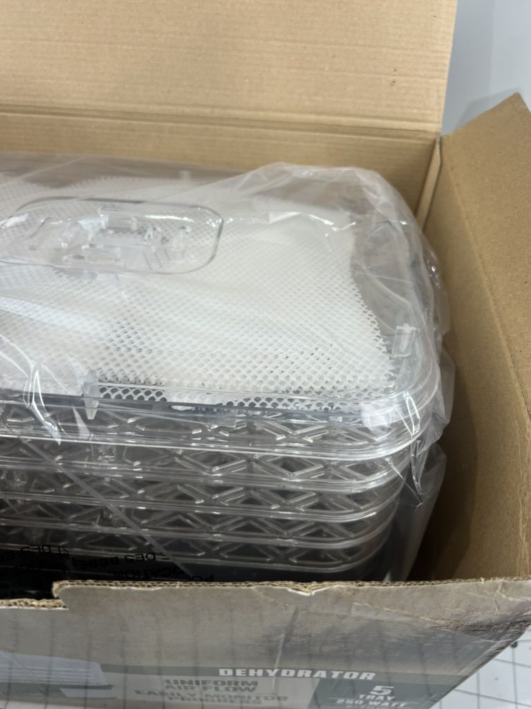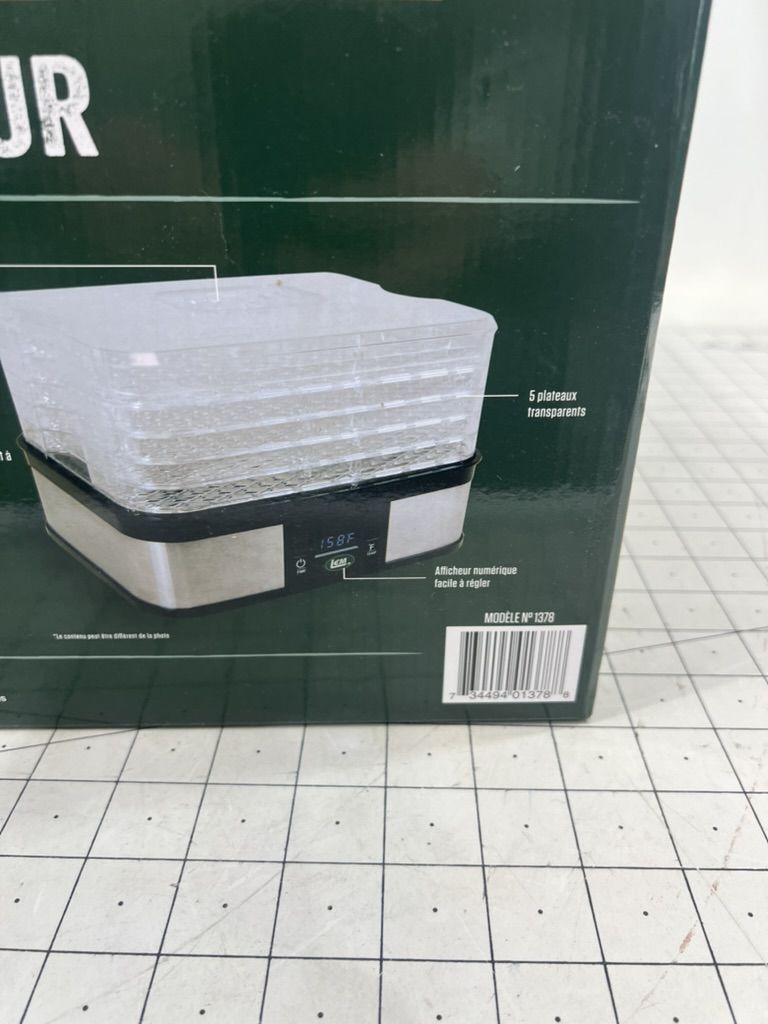 • Digital temperature display • 250 watts of power • Includes 5 transparent trays • 1-year warranty • Compact design for countertop use