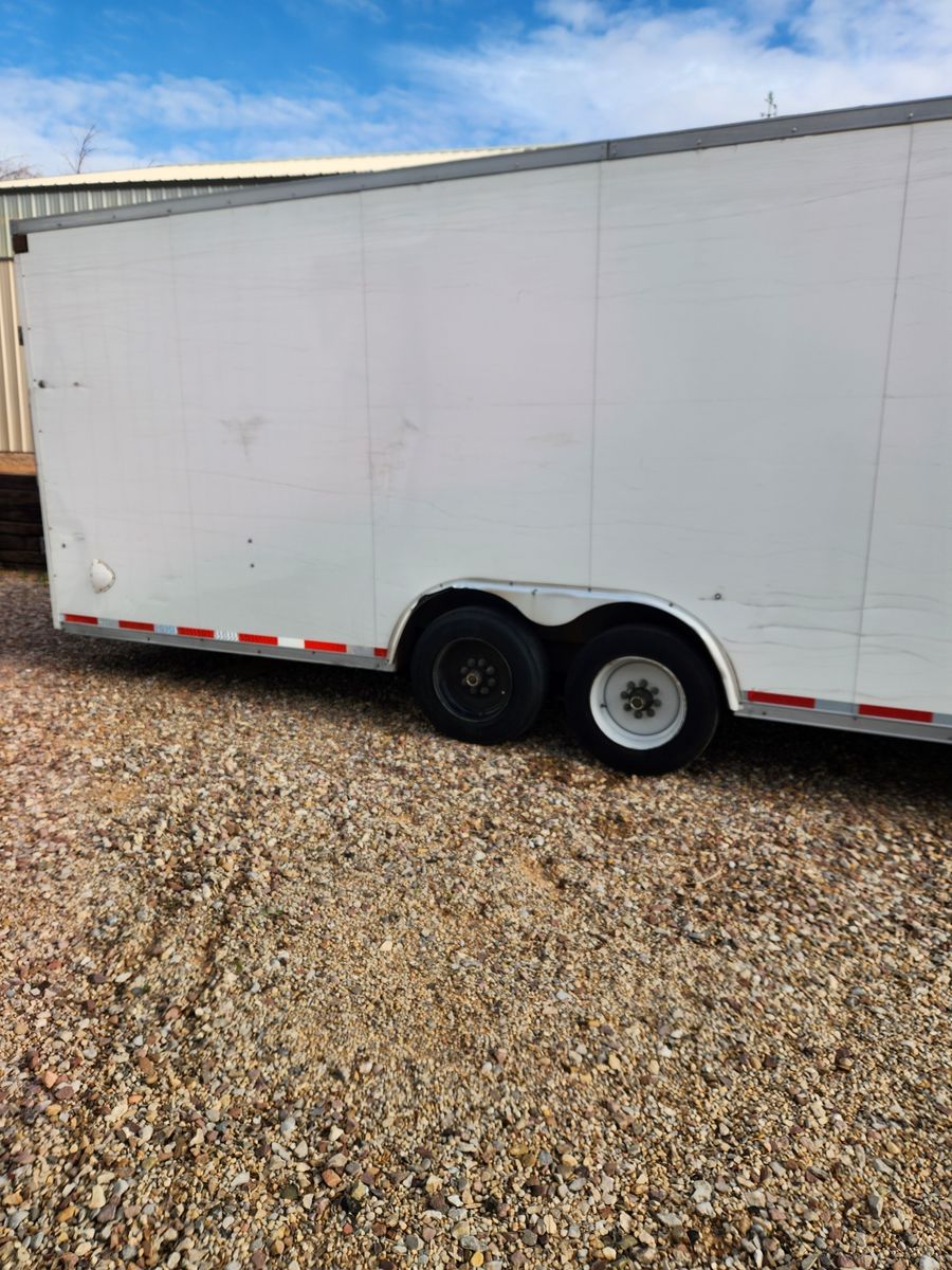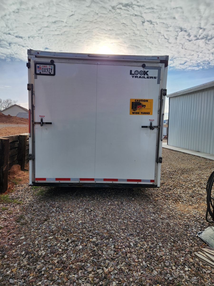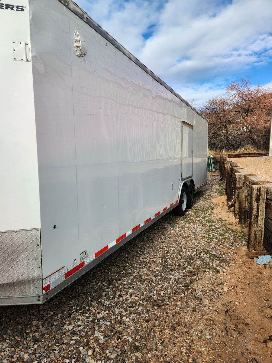 8.6 X 28ft Enclosed Box w/2ft V Front. Heady duty 2x8 steel frame with 3rd 2x8 center support. 7-Way electic plug, Interior lights, 4 wheel electric breakes (new breakes and seals) 2-ton car ramp door with 1ft flap, 7'1" door clearance. Car escape door, personnel entrance door. 7'6" Interior roof, E-Track and tie downs on floor and walls. 2-Spair tires and wheels included, full set of inner and outer barrings included, 1 bottel of hub oil included. Trailer located in Manila UT (By Flaming Gorge lake) Delivery available at resonable cost.