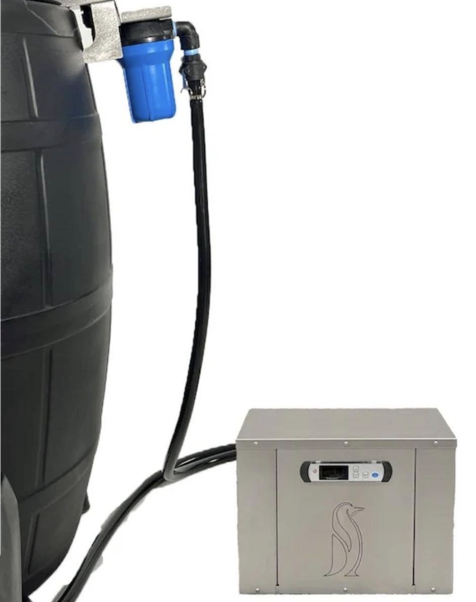 3/4HP Cold Therapy Chiller with built in pump Options: Barrel Bracket – no drilling required – continues to work with lid on via handles in lid. The Barrel Bracket will fit Ice Barrel This kit contains everything needed to utilize the built in connections on the Ice Barrel Attached filter canister with 150 micron washable / reusable filter Inline coarse screen (to catch hair/ large particles prior to entering chiller) Hoses with Quick Connect ends