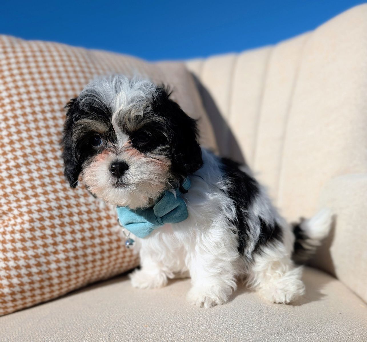 VenmoMiles locks onto his person from the moment he meets you. Striking black tricolor markings, soft wavy coat, and the most human-focused personality in the litter.