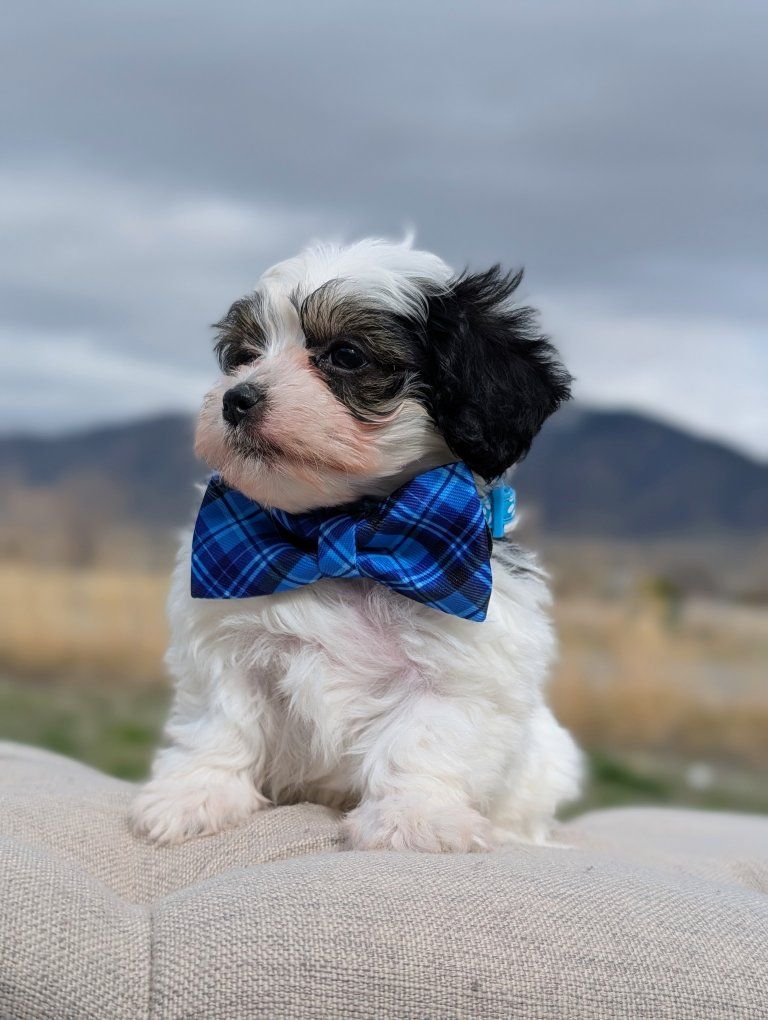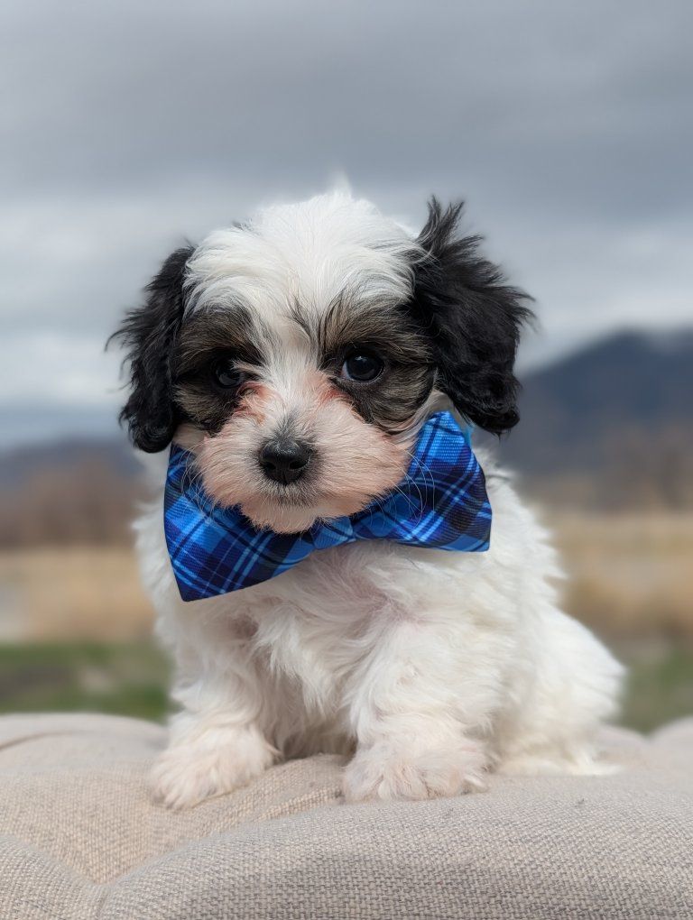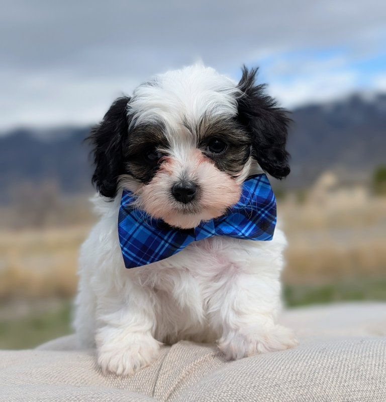 Toy Labradoodle male Born Feb 1st Estimated 6–10 lbs fully grown Soft, wavy low-shedding coat Black tricolor with high white markings