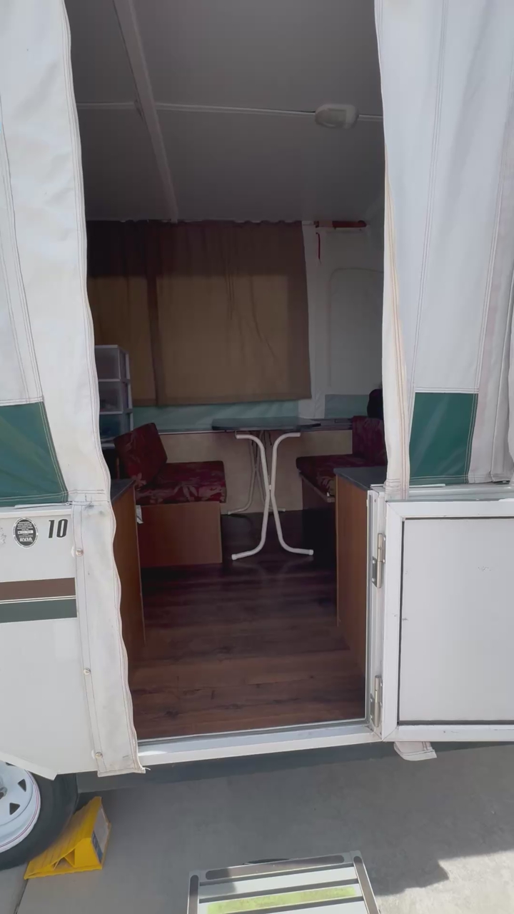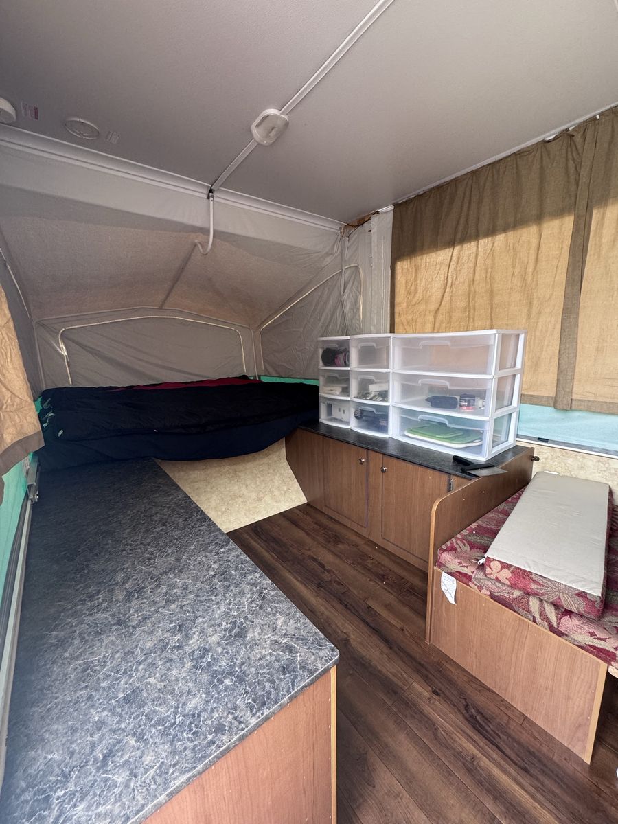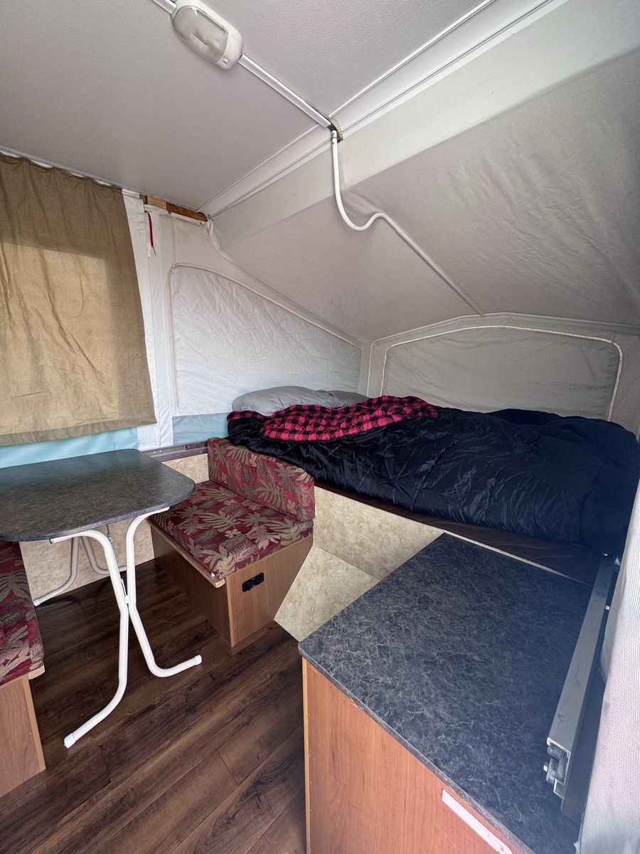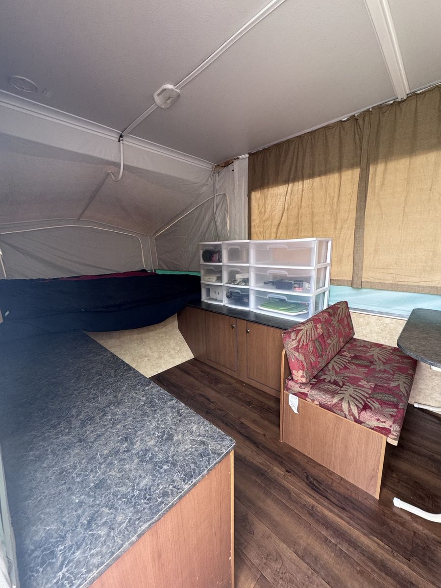 Venmo-Sleeps 4 adults + 1-2 small kids -TONS of storage! -Lightweight, easy to tow with almost any car! I towed with my Toyota Sienna! -NO leaks or water damage! Canvas is clean! Previous owner got caught in a hail storm, but repairs were made and never had problems with it.
