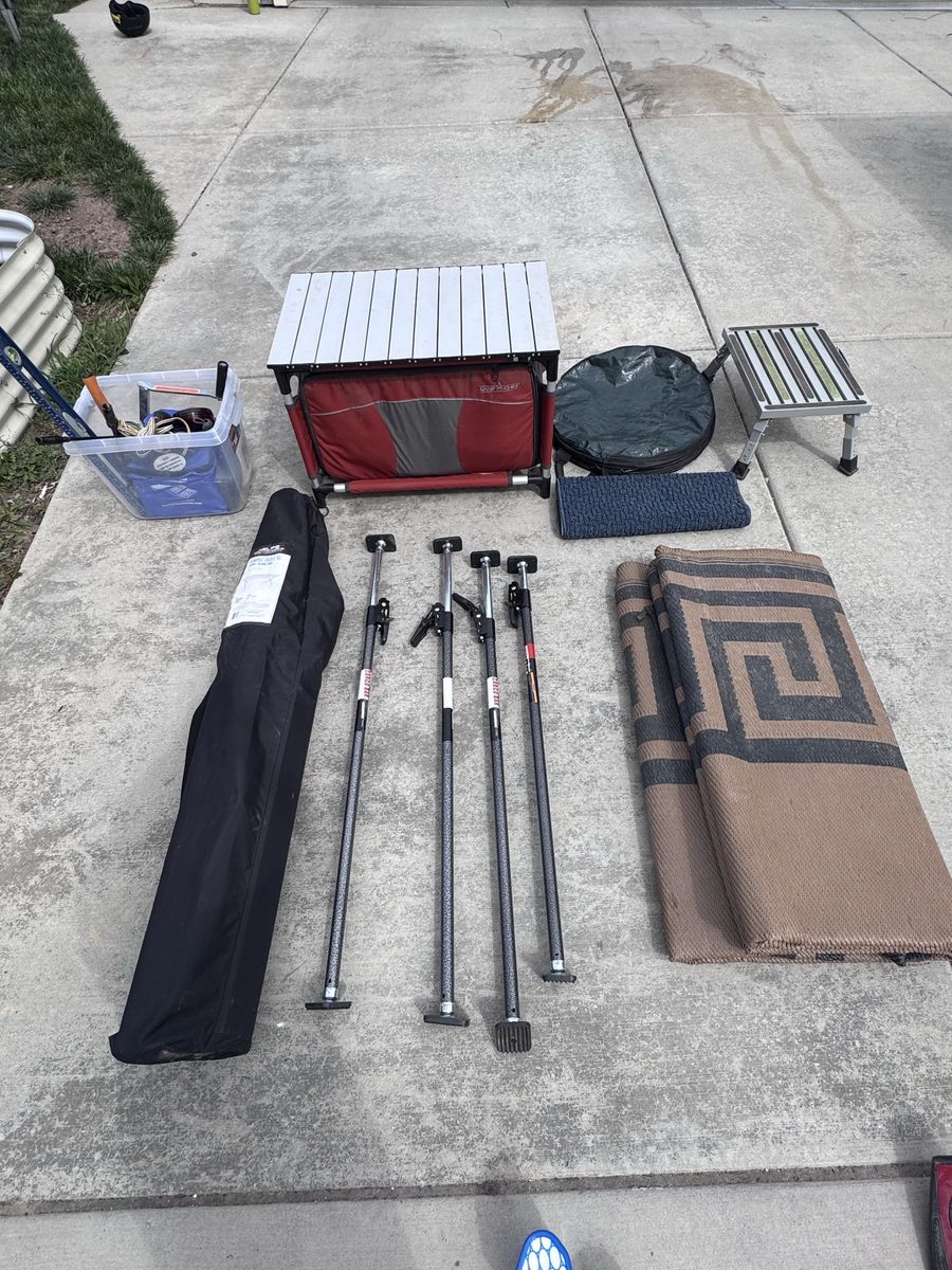 Trailer: window blackout fittings, 4 cargo bars, mattress toppers on both slide outs, 2 spare tires, all tools needed for a quick and easy set up & takedown. $4,000 Want to camp this weekend? Alps camp table, Camp Chef Kitchen filled with gear, 3 lanterns, 4 fans, 2 North Face sleeping bags, 2 large flannel sleeping bags, 24” Blackstone with side burner, marshmallow sticks, 3 Rubbermaid drawers for easy organization, large outdoor rug, small indoor rug, 2 camp chairs. $5,000