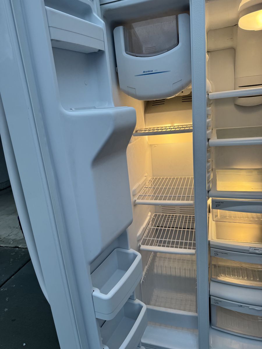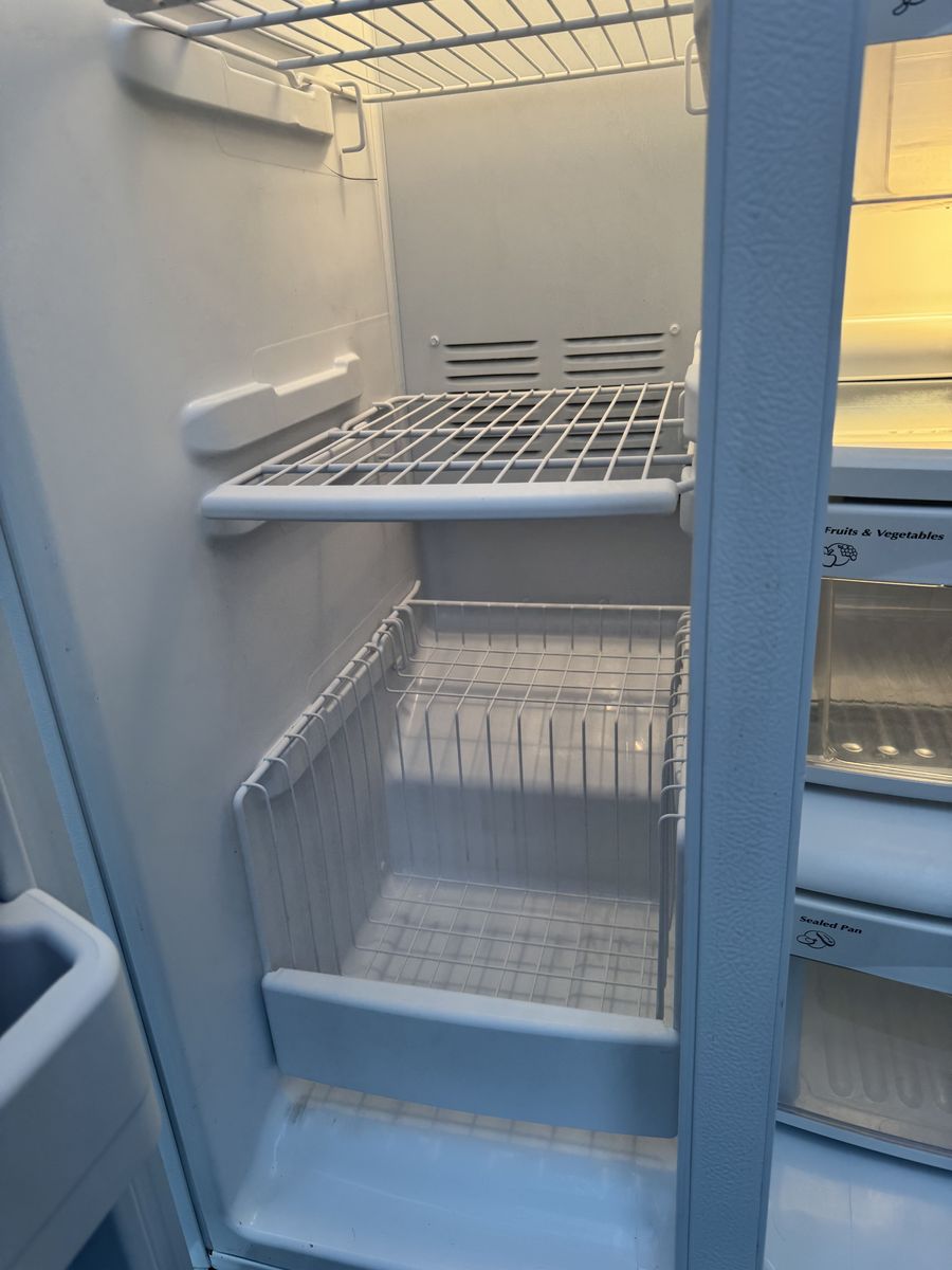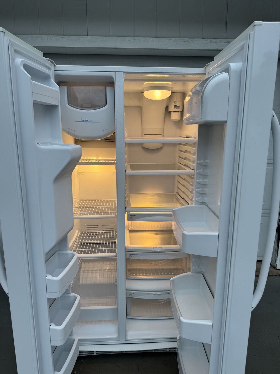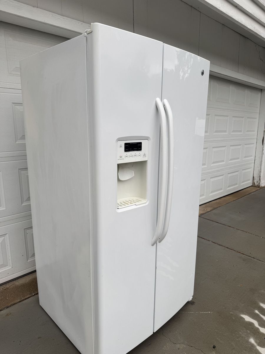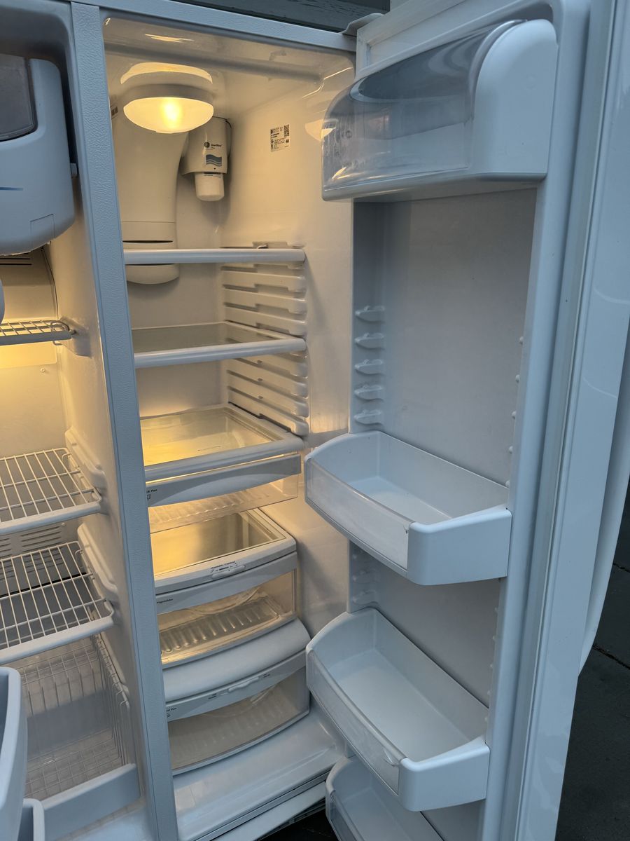 VenmoVery clean GE GSHF6LGBCHWW white side-by-side fridge with external ice and water dispenser. • 25.9 cubic feet total capacity • Spill-proof shelves, gallon door bins, humidity drawers • ENERGY STAR certified • Dimensions: 35.75” W x 69.5” H x 33.625” D