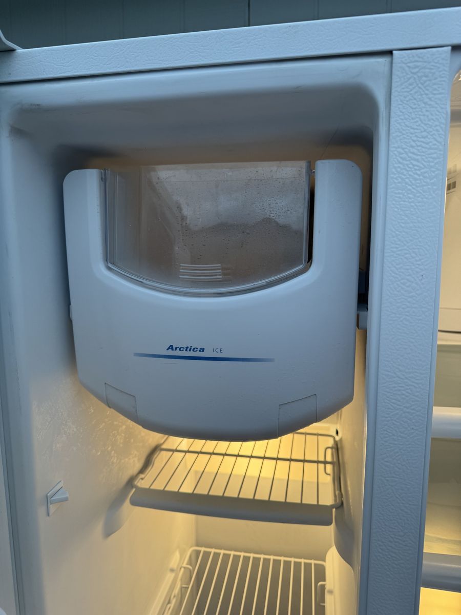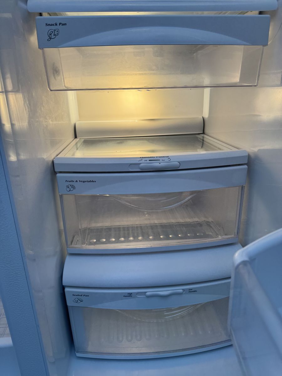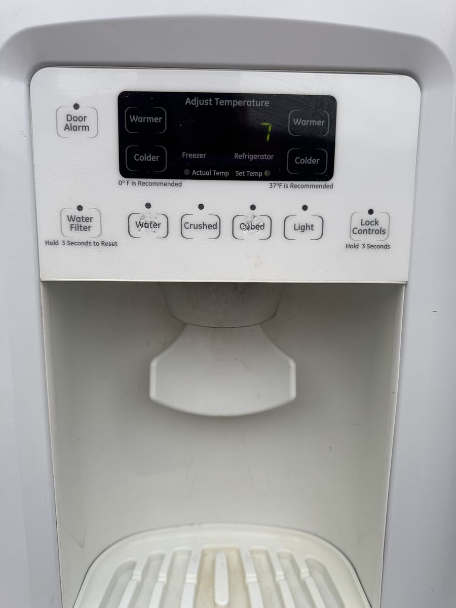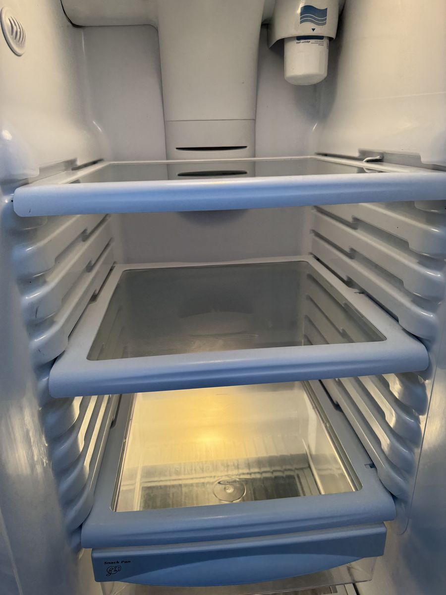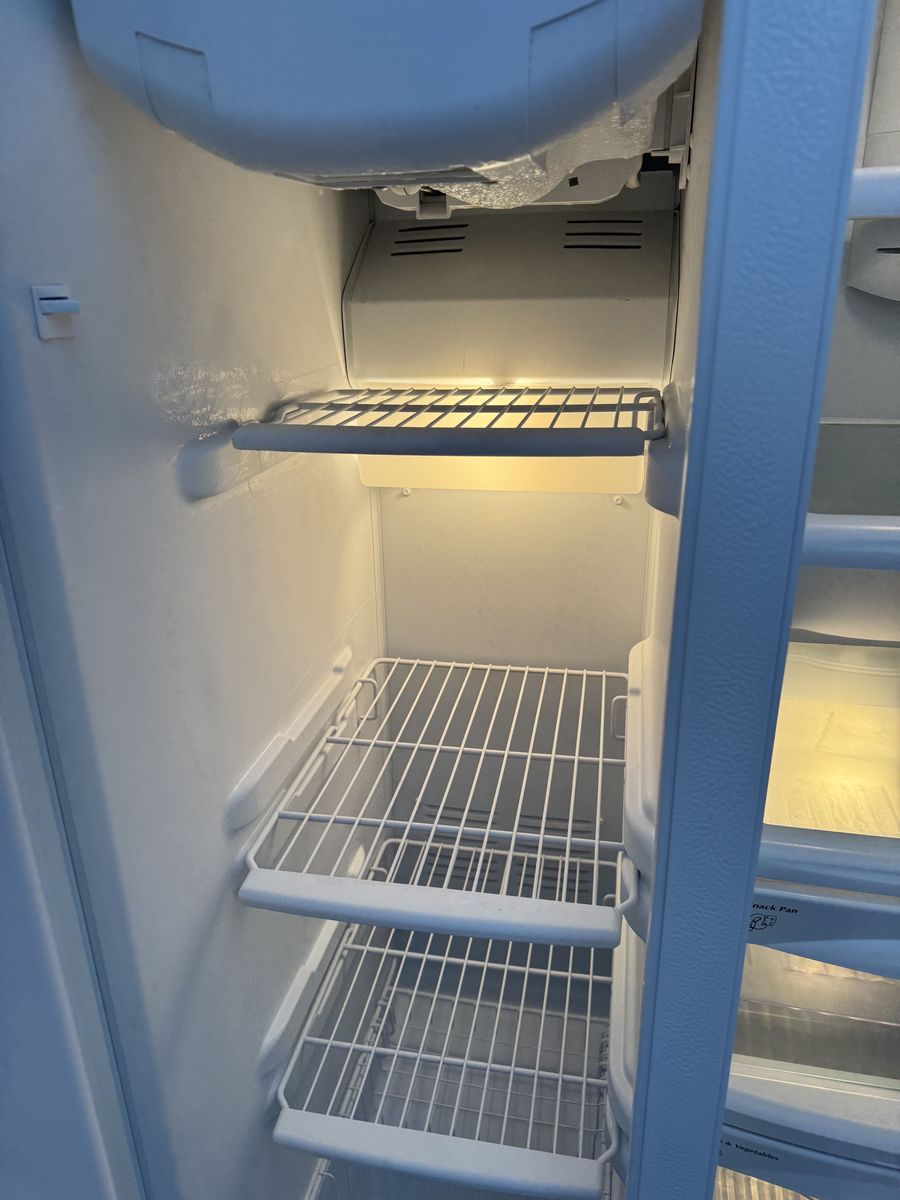 VenmoVery clean GE GSHF6LGBCHWW white side-by-side fridge with external ice and water dispenser. • 25.9 cubic feet total capacity • Spill-proof shelves, gallon door bins, humidity drawers • ENERGY STAR certified • Dimensions: 35.75” W x 69.5” H x 33.625” D