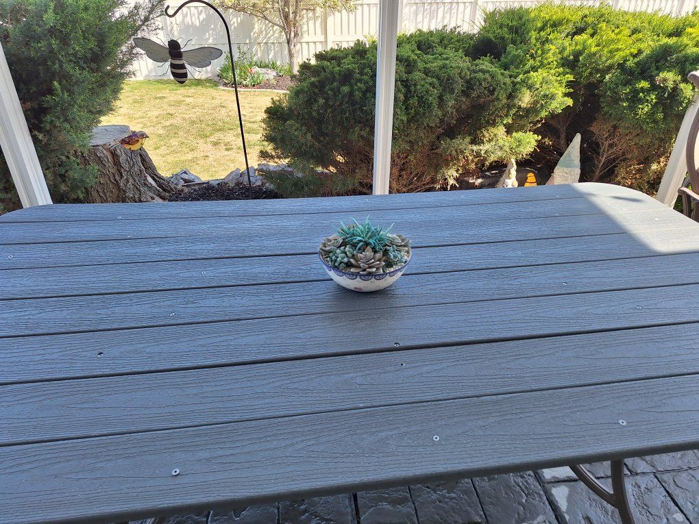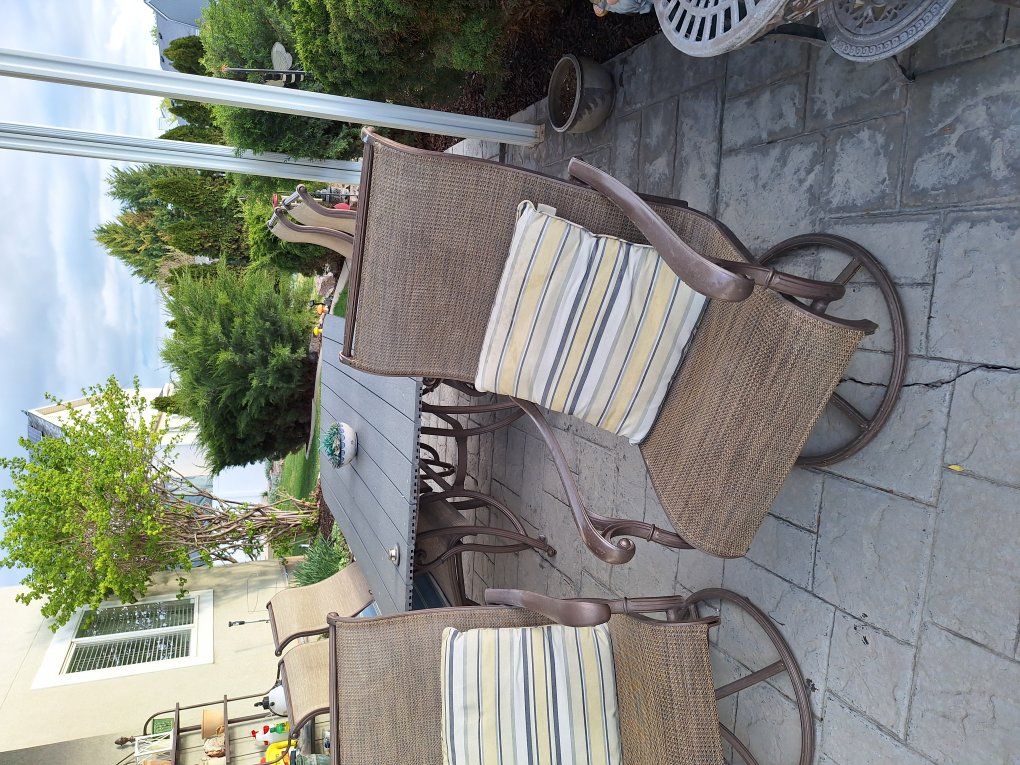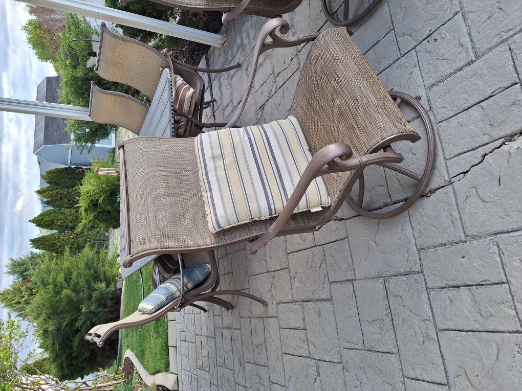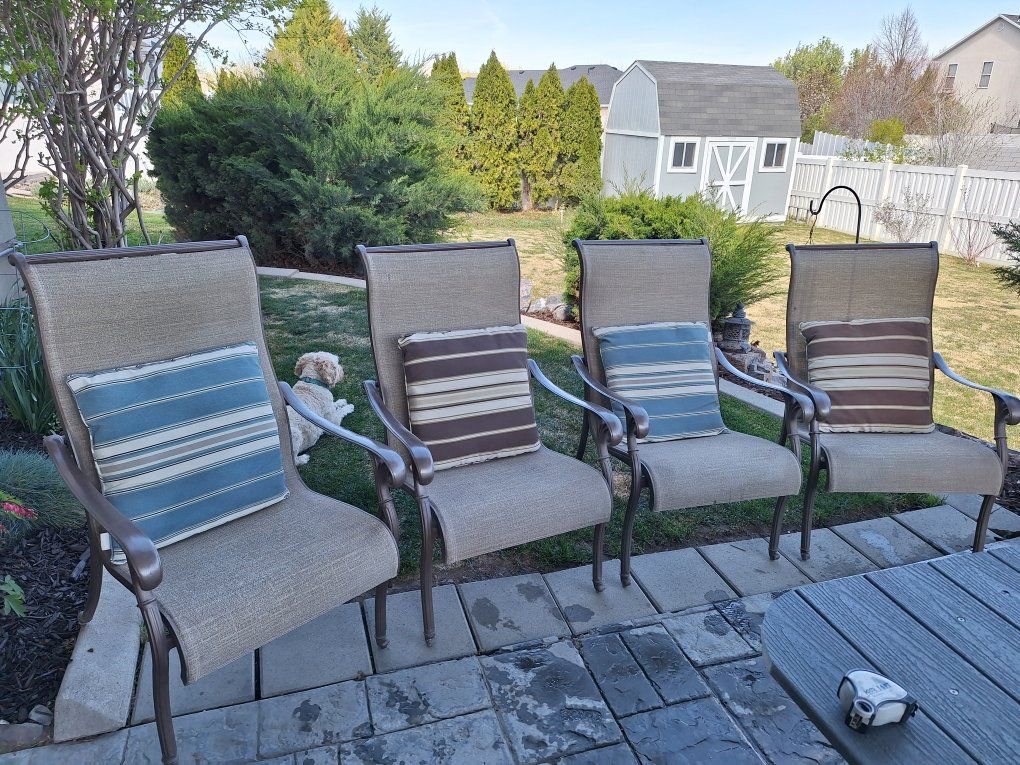 VenmoFabulous quality Costco cast aluminum frames and an 83"x44" super picnic table with a new Trex top. Four regular chairs with cushions and two super comfortable rocker-recliners with brand new slings. We've had up to 9 people at this table, so a polygamist with 8 wives could be accommodated! Sell for $175 with just 4 chairs, or $300 with the swivel-rockers. Give me a call, Michael 801 403-6450