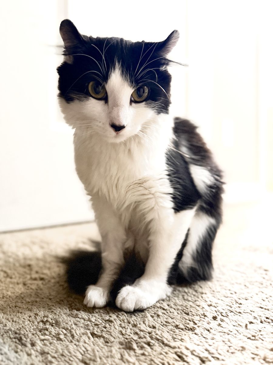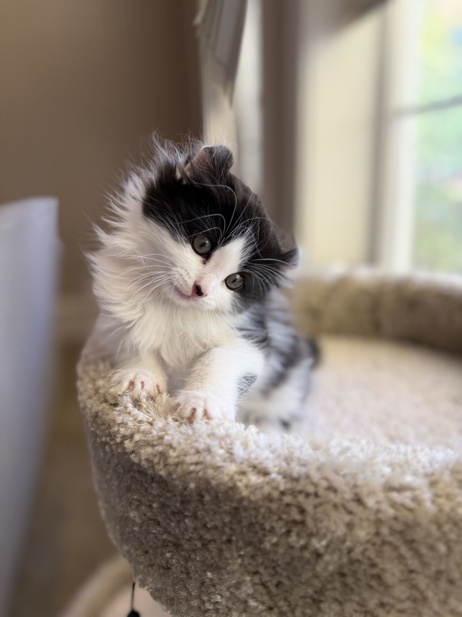 PayPalHello! This sweet small kitty, 7months, spayed and vaccinated Great with children and other pets Curious and cuddly Ultra soft American Curl Tuxedo Female (spayed)