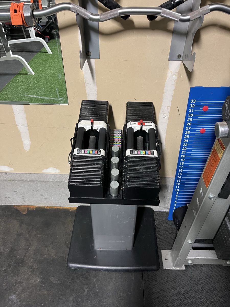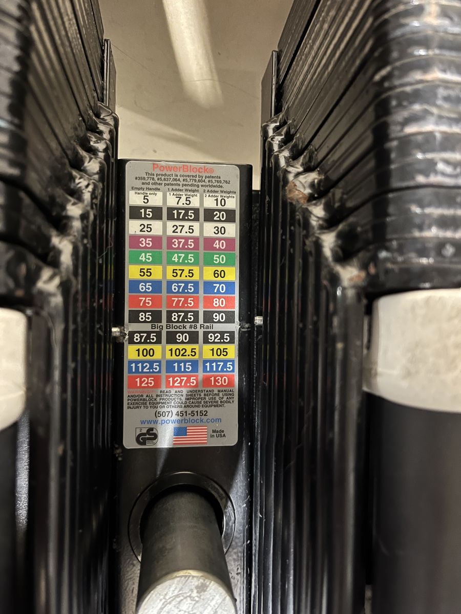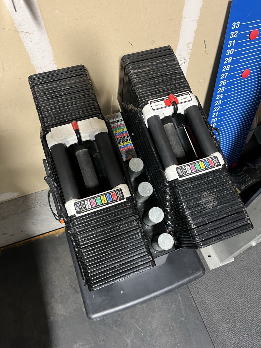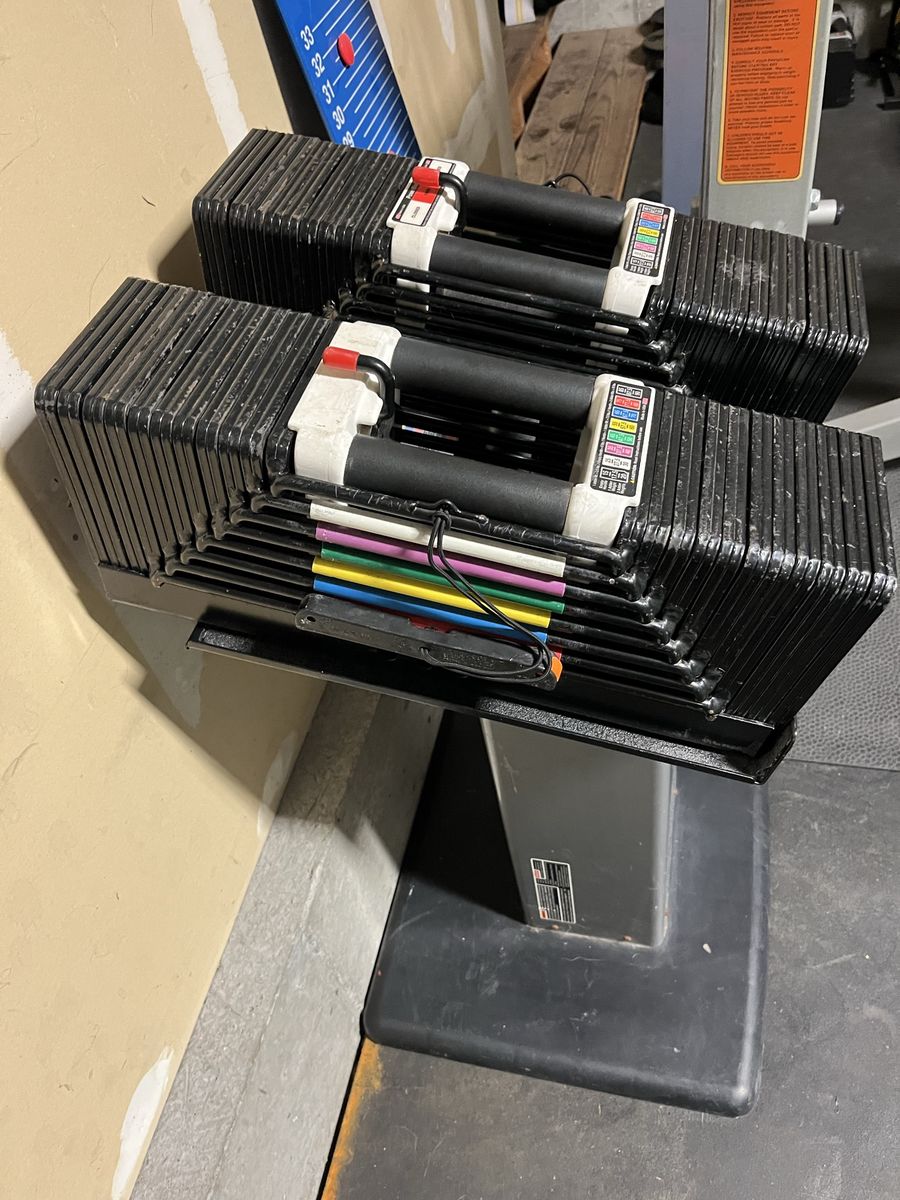 Very rare powerblock adjustable dumbbells in great condition and in perfect working order each dumbbell can be adjusted from 5 to 130 pounds. I am missing the stage for adjustment pen, but they can be ordered online for $20 each as is now these dumbbells can be adjusted from 5 to 90 pounds.. the new model of powerblocks that go to 125 cost well over $2000 selling these for for $880 Firm and I’m including the stand for free.