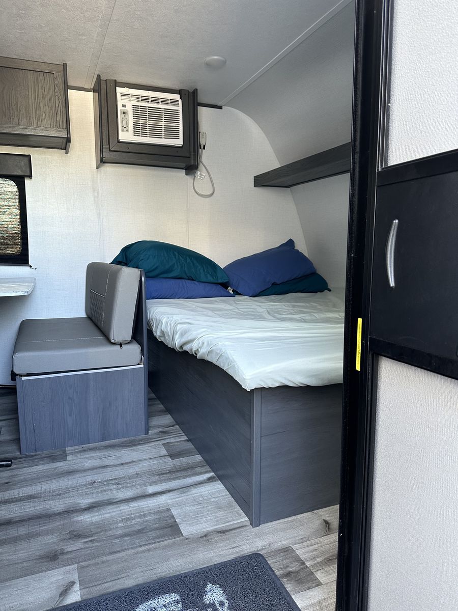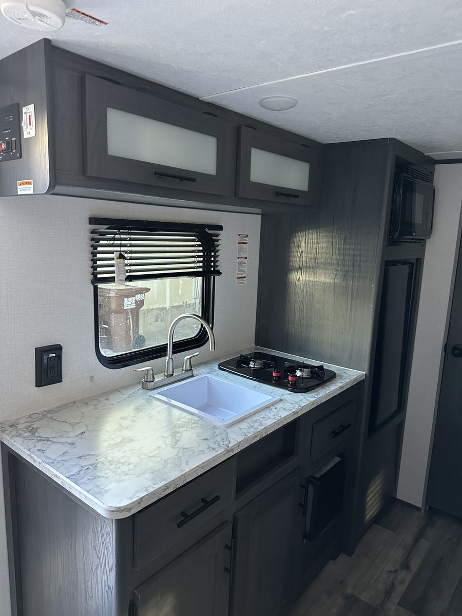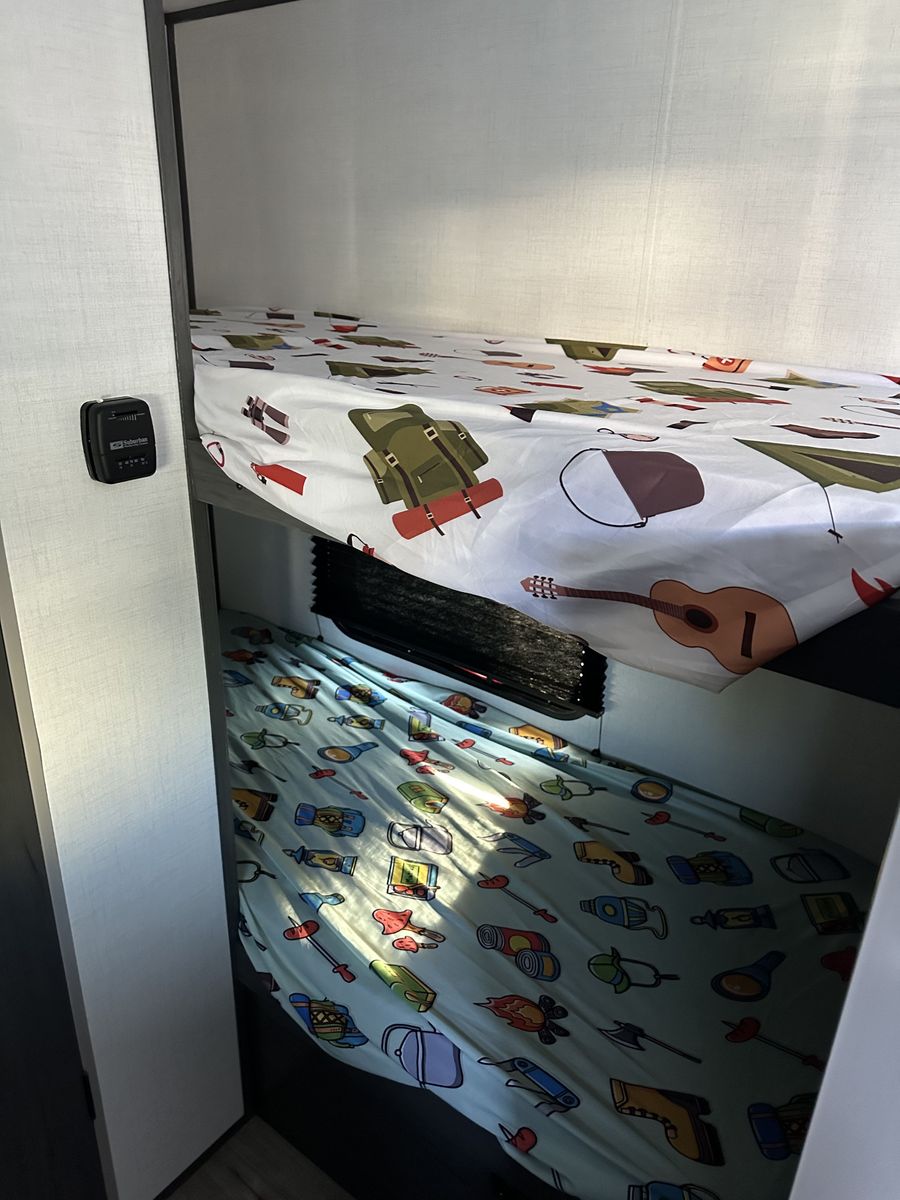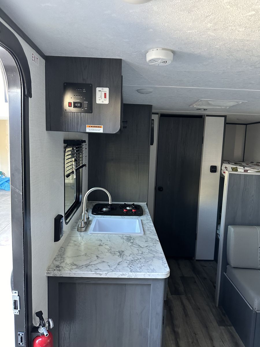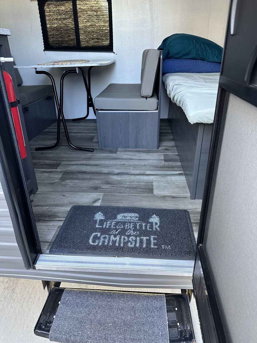 Beautiful and in excellent condition. Purchased in 2024 and used only 3 times. Sleeps 5 and comes with a rear camera, stabilizer bar (WDH), a cover, and many upgrades (over $2,000). It has a refrigerator, microwave, heater, two-burner stove, air conditioning, electric awning, and a bathroom with a shower. Double bed, bunk bed, and dining set, where another person can sleep. Ready for camping trips..!
