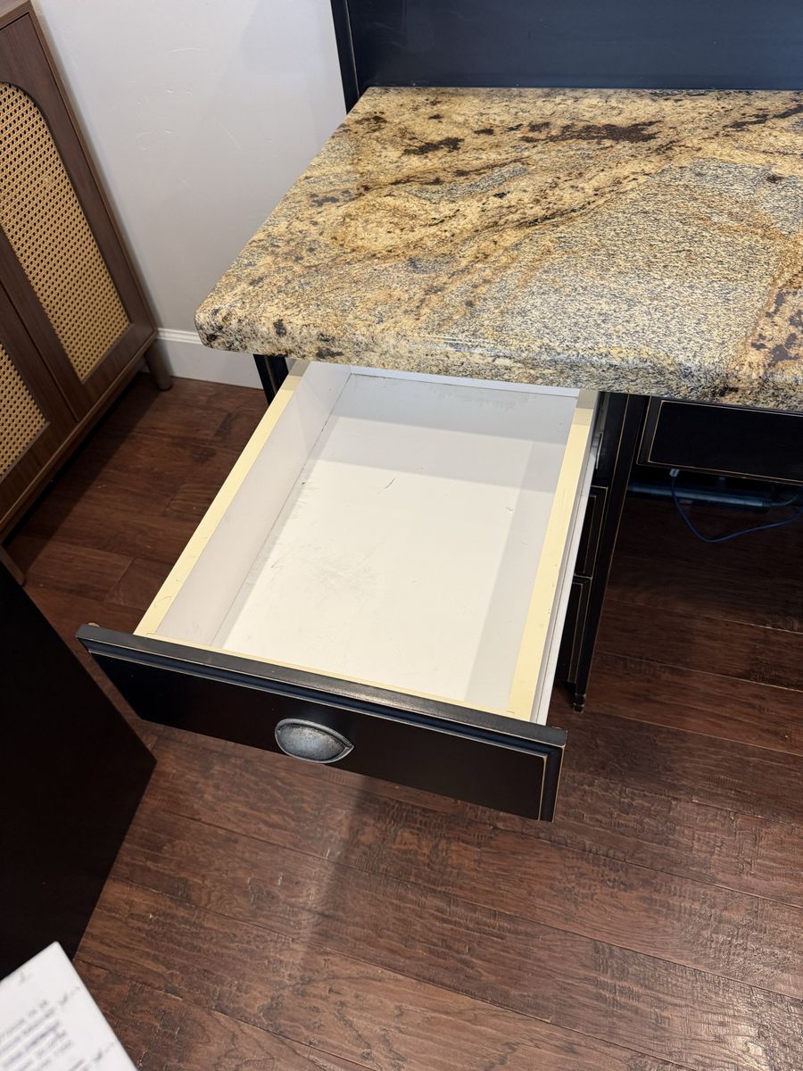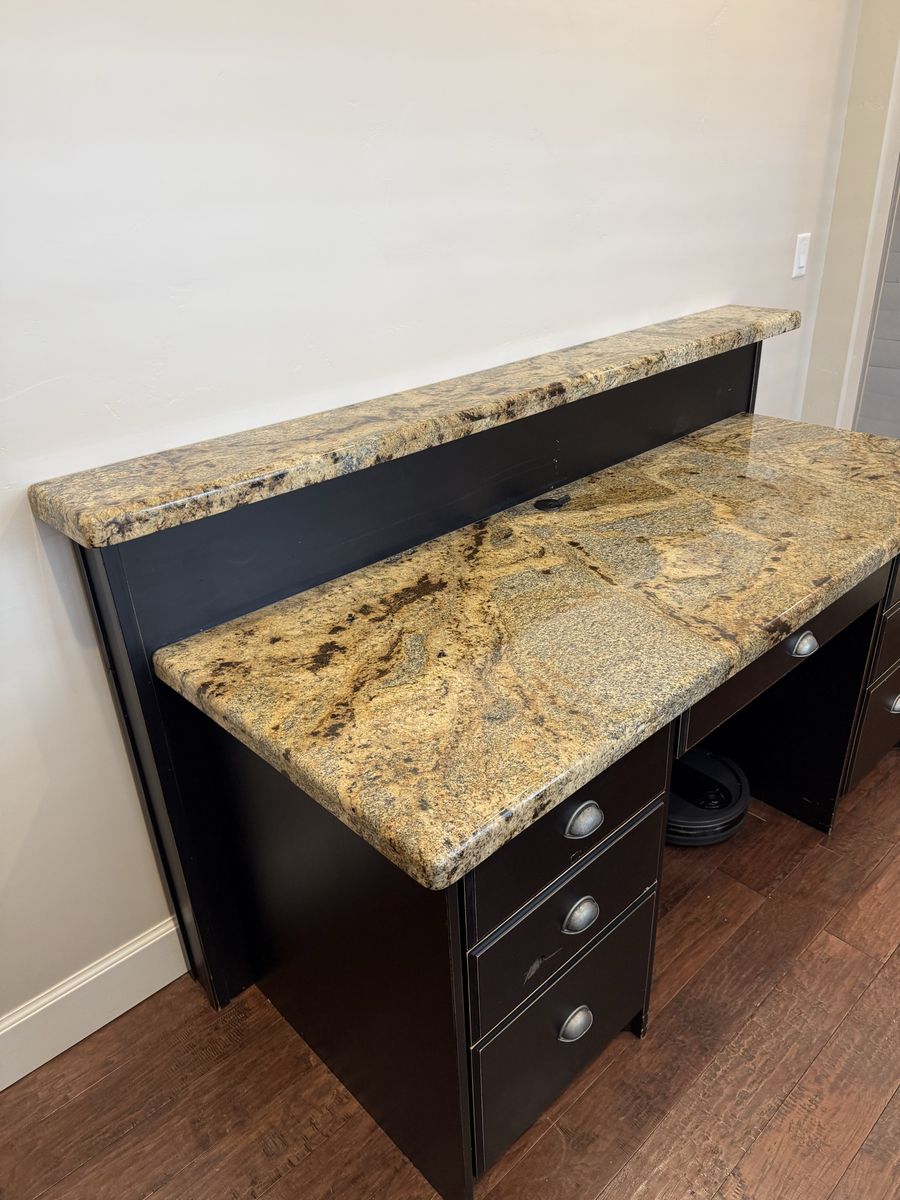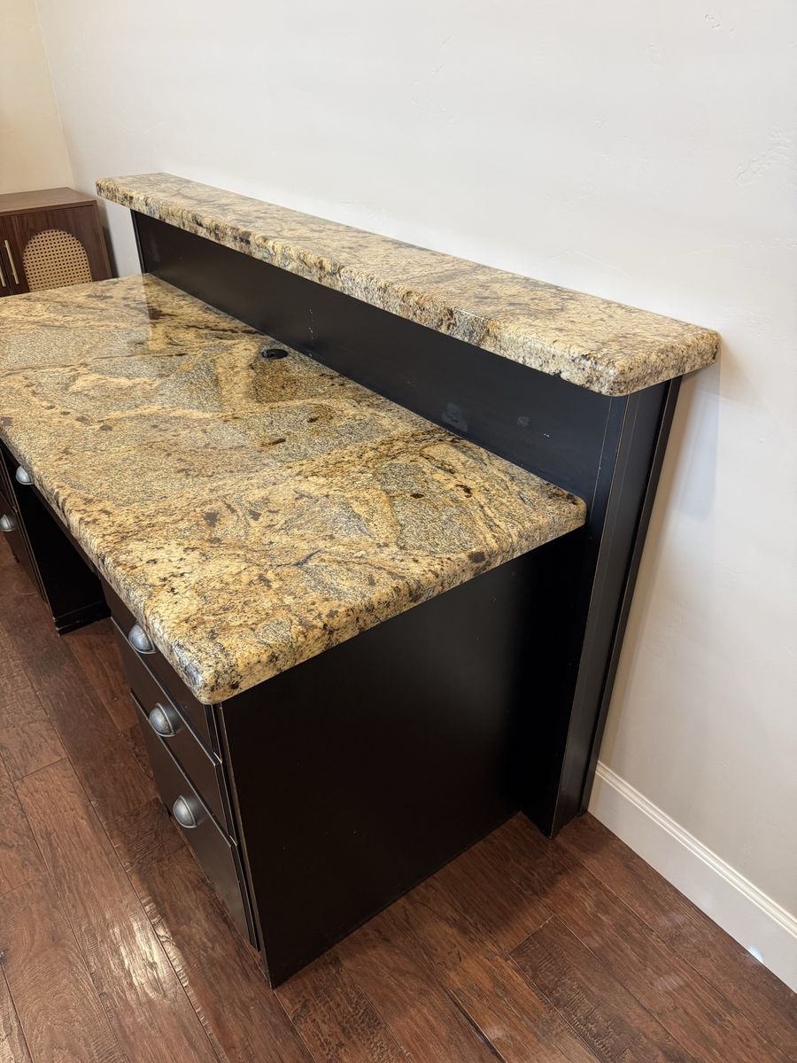 VenmoWe no longer need this desk any more. It was made professionally by a cabinet maker and we had granite installed for the countertop. The upper section can be removed if you don’t want to use it. Whether you keep the raised upper section or not this would work best against a wall. This is a very good quality. Not what you would get at a store.