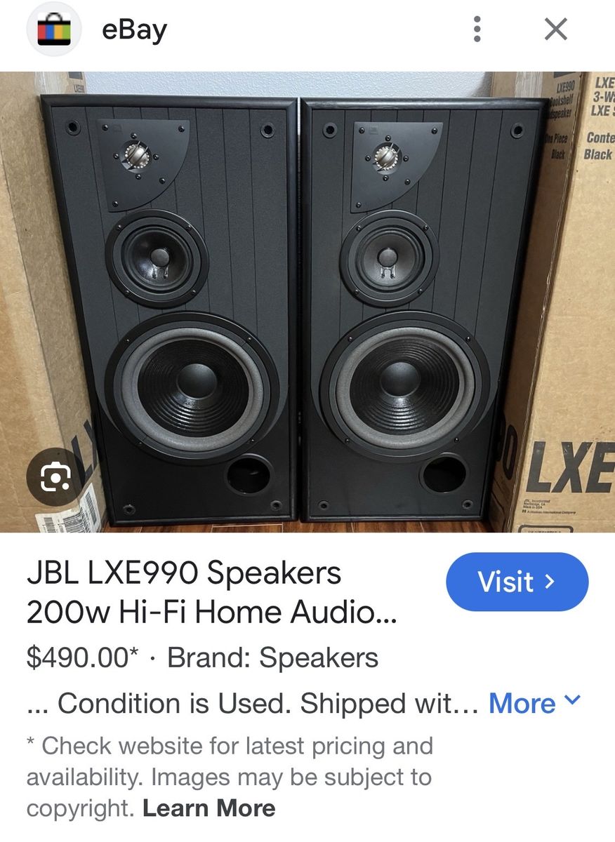 VenmoVery good sounding speakers. The JBL LXE 990 is a 3-way, bass-reflex floor-standing loudspeaker system produced in the mid-1990s. It was the flagship model of the LXE series, known for its high efficiency and the use of titanium dome tweeters. This speakers are a powerhouse for the size specially if you don’t have a lot of space in your setup area. Enclosure helps with bass full front firing sound makes the speakers have more bass and full sounded. Has been refoamed 2yrs ago. Specs: Type: 3 way, 3 driver loudspeaker system Frequency Response: 40Hz to 23kHz Recommended Amplifier: 10 to 200W Crossover Frequency: 800, 3200Hz Impedance: 8Ω Sensitivity: 92dB Bass: 1 x 254mm Midrange: 1 x 127mm Tweeter: 1 x 25mm titanium dome Enclosure: bass reflex Dimensions: 724 x 343 x 227mm Weight: 16.8kg